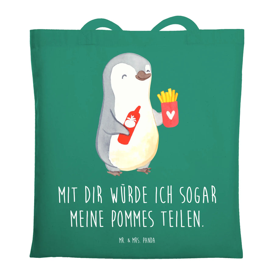 Das Motiv zeigt einen fröhlichen Pinguin mit Pommes und Ketchup sowie dem Spruch „Mit dir würde ich sogar meine Pommes teilen.“ Handgezeichnete Aquarell-Elemente machen das Design warm und persönlich – perfekt als Geschenk für Freundin, Freund, Ehefrau oder Ehemann.