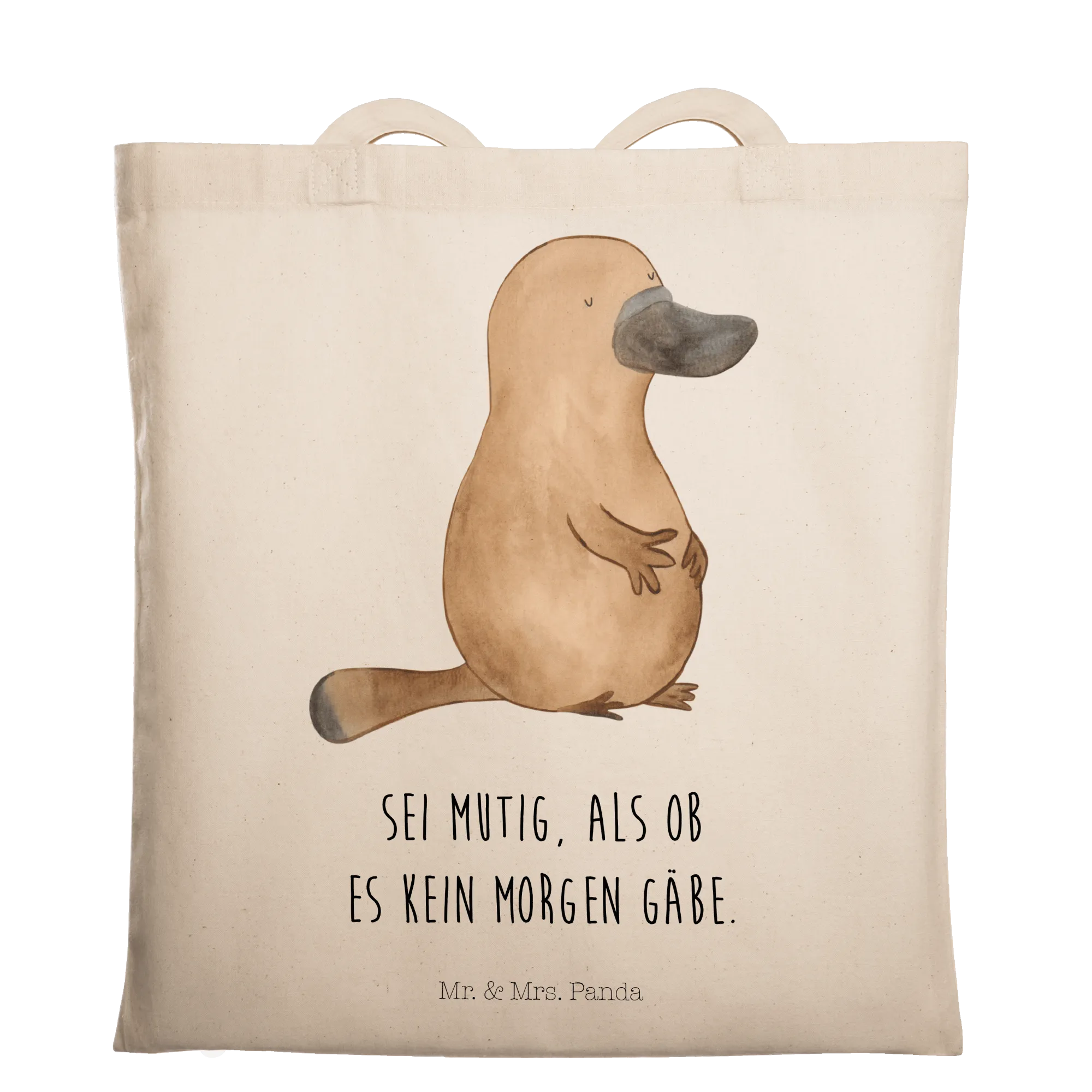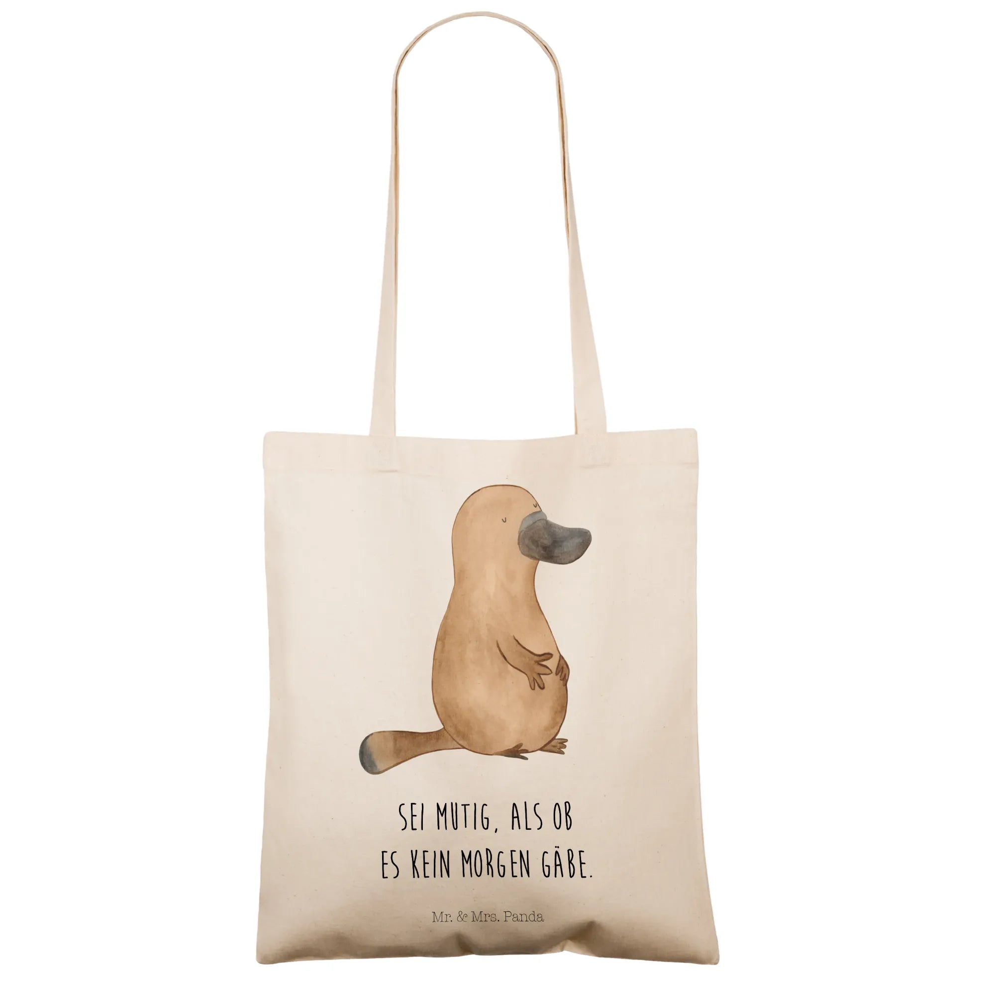 The design features our charming platypus character, depicted from the side in a friendly pose, with a playful oversized body and an expressive eye. The neutral beige and brown tones, paired with the simple yet captivating illustration, create a delightful visual appeal. Our motto, 'Be brave as if there's no tomorrow,' will inspire you to take on life’s adventures with enthusiasm. Whether you’re commuting to work, leaving for a new start, or embarking on a spontaneous road trip, this tote bag makes an ideal companion.