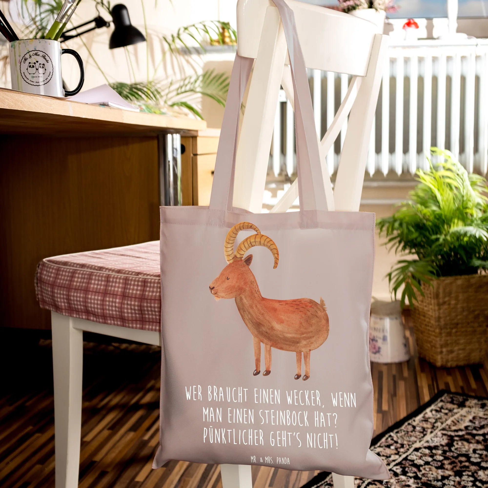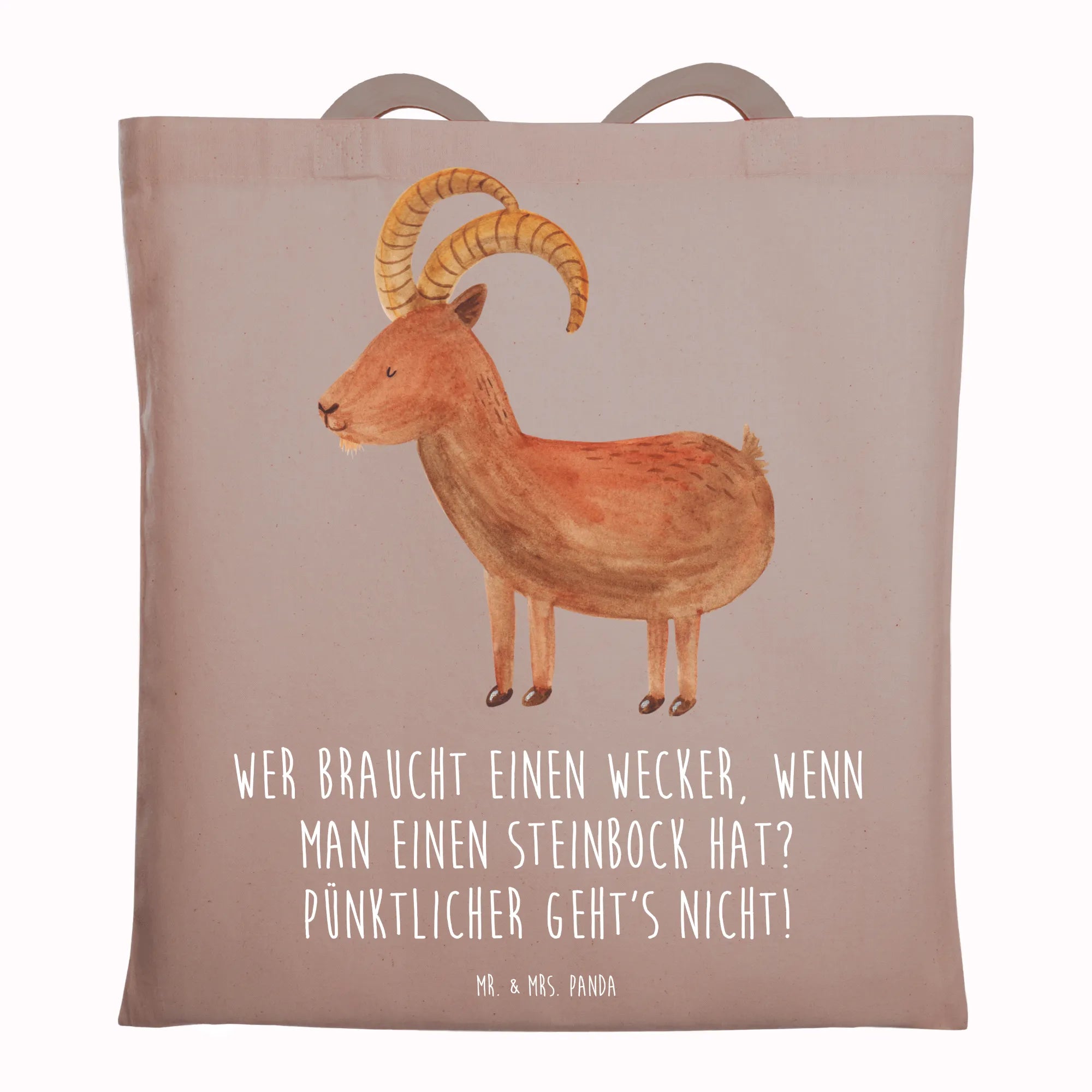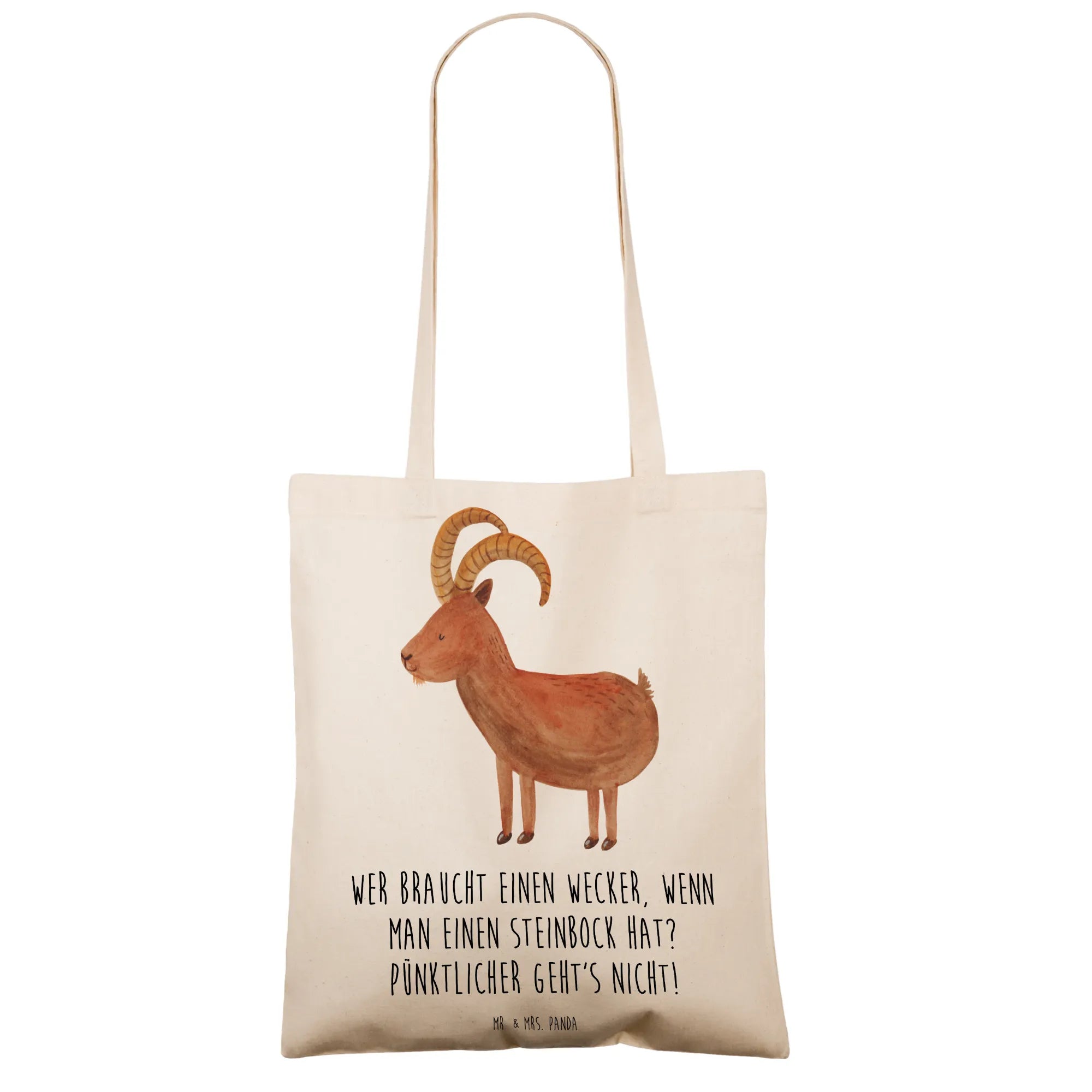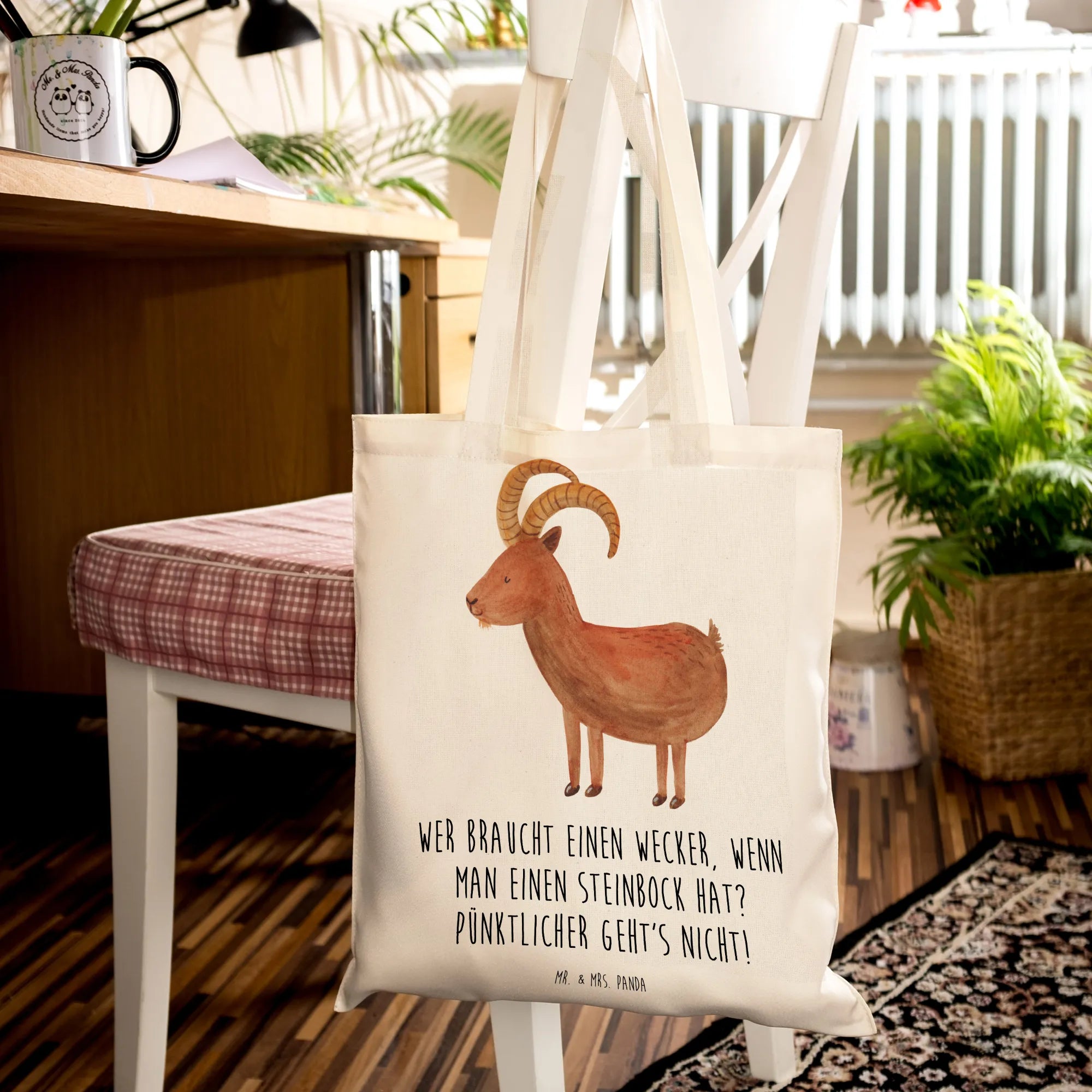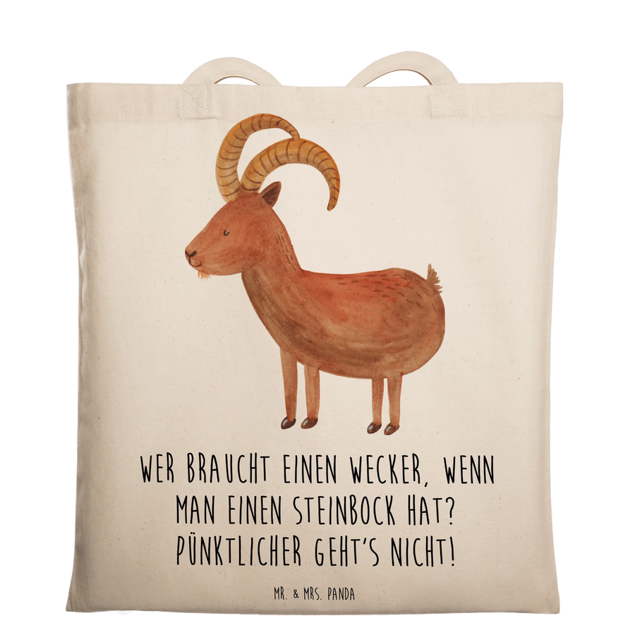 Mit viel Liebe von Mrs. Panda handgezeichnet und mit einem Augenzwinkern versehen: Das Aquarellmotiv des Steinbocks und der freche Spruch „Wer braucht einen Wecker, wenn man einen Steinbock hat? Pünktlicher geht's nicht!“ machen diese Tasche zu einem charmanten Begleiter im Alltag.