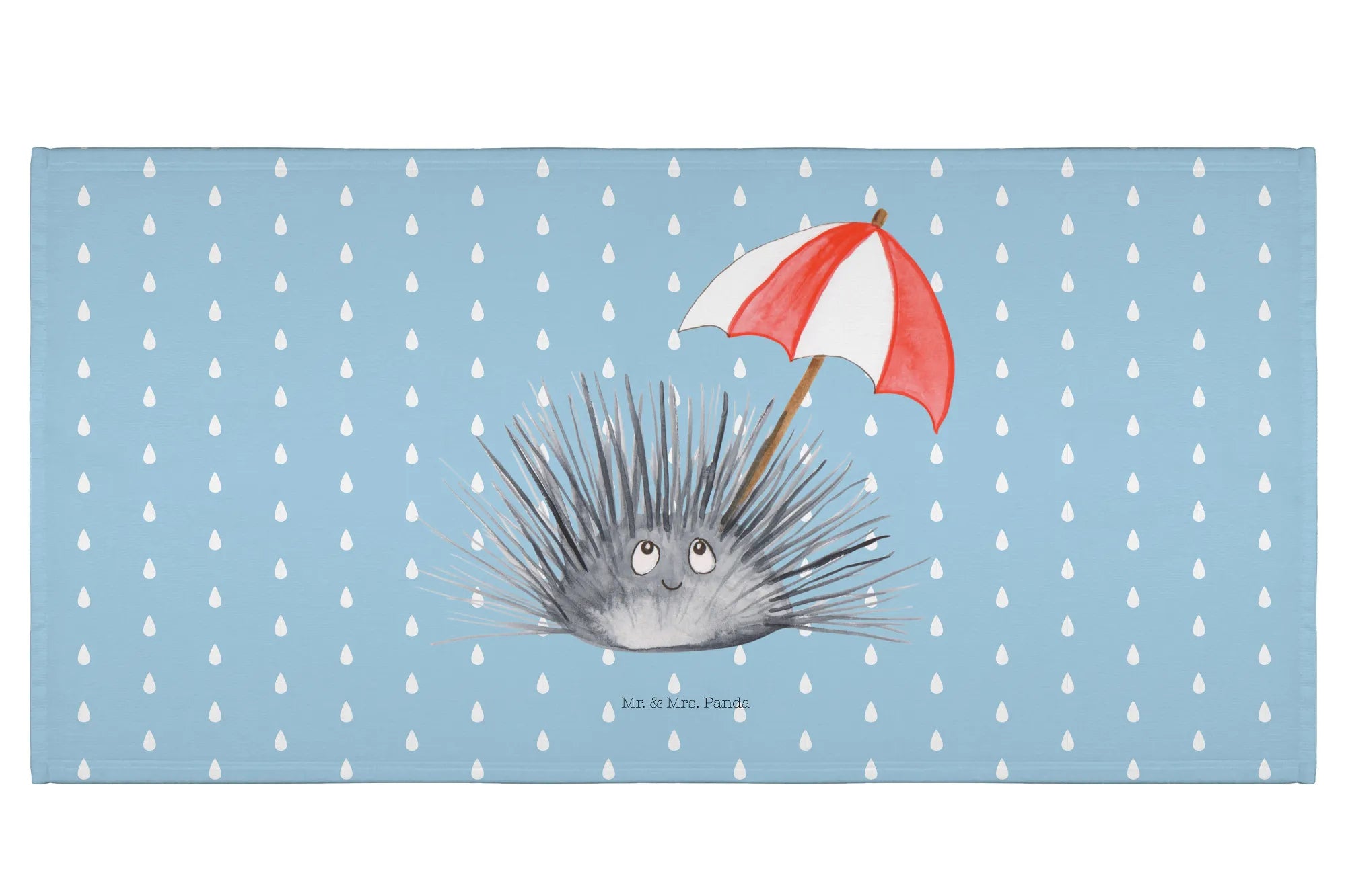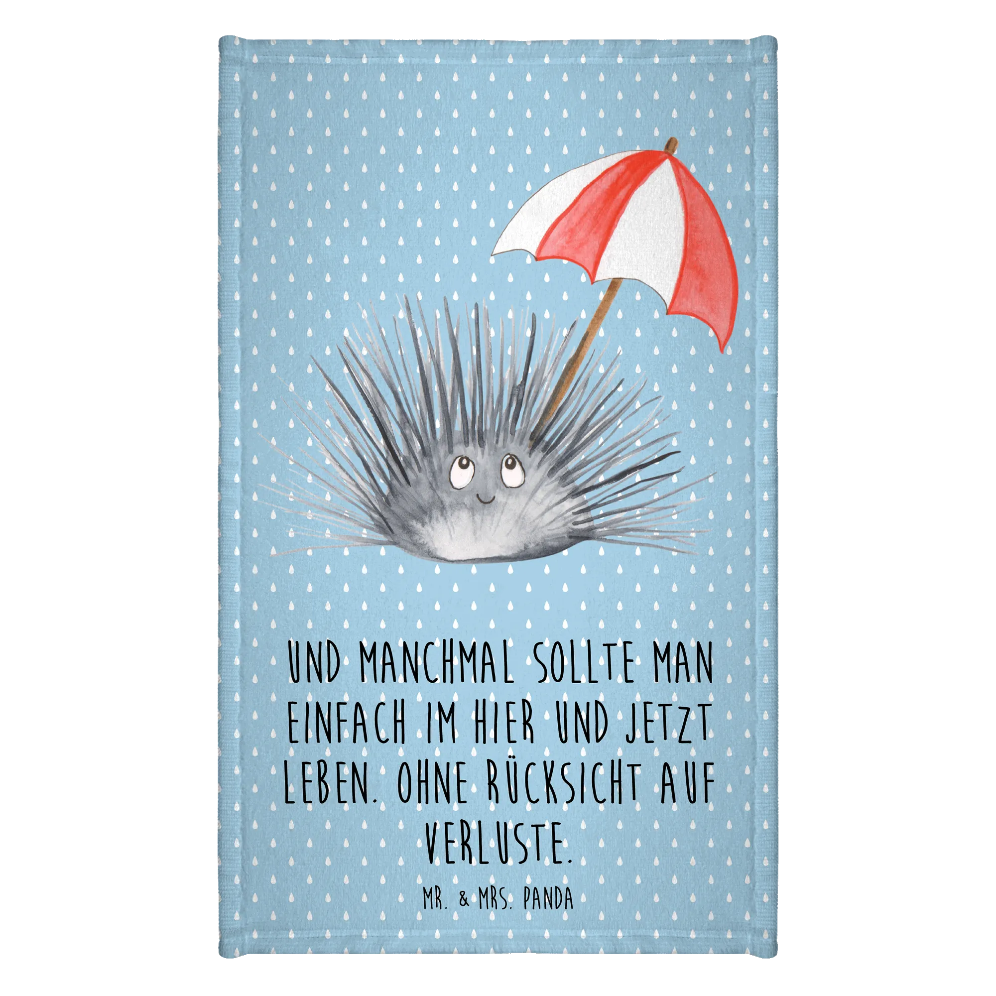 Imagine a bright and cheerful bathroom, adorned with this vibrant hand towel, featuring an adorable sea urchin with big, kind eyes and a sweet smile. This charming marine creature holds a red-and-white striped umbrella, inviting you to embrace a mindset of mindfulness and self-acceptance. With the slogan, 'And sometimes you just have to live in the here and now. Without regard for losses,' this towel reminds us of the importance of cherishing each moment.