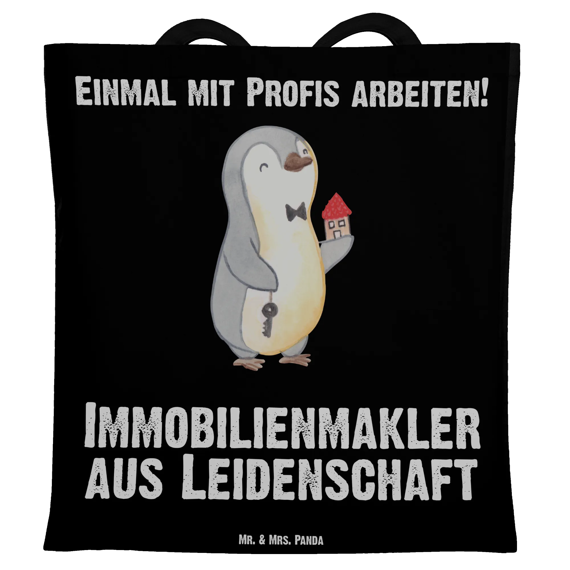 Unsere Tragetasche „Immobilienmakler aus Leidenschaft“ von Mr. & Mrs. Panda ist das perfekte Geschenk für alle, die Immobilien lieben und mit Leidenschaft arbeiten. Das liebevoll gezeichnete Motiv zeigt unseren kleinen Pinguin mit Schlüssel und Haus, begleitet vom Schriftzug „Immobilienmakler aus Leidenschaft“ – ein fröhlicher und persönlicher Blickfang für jeden Tag.