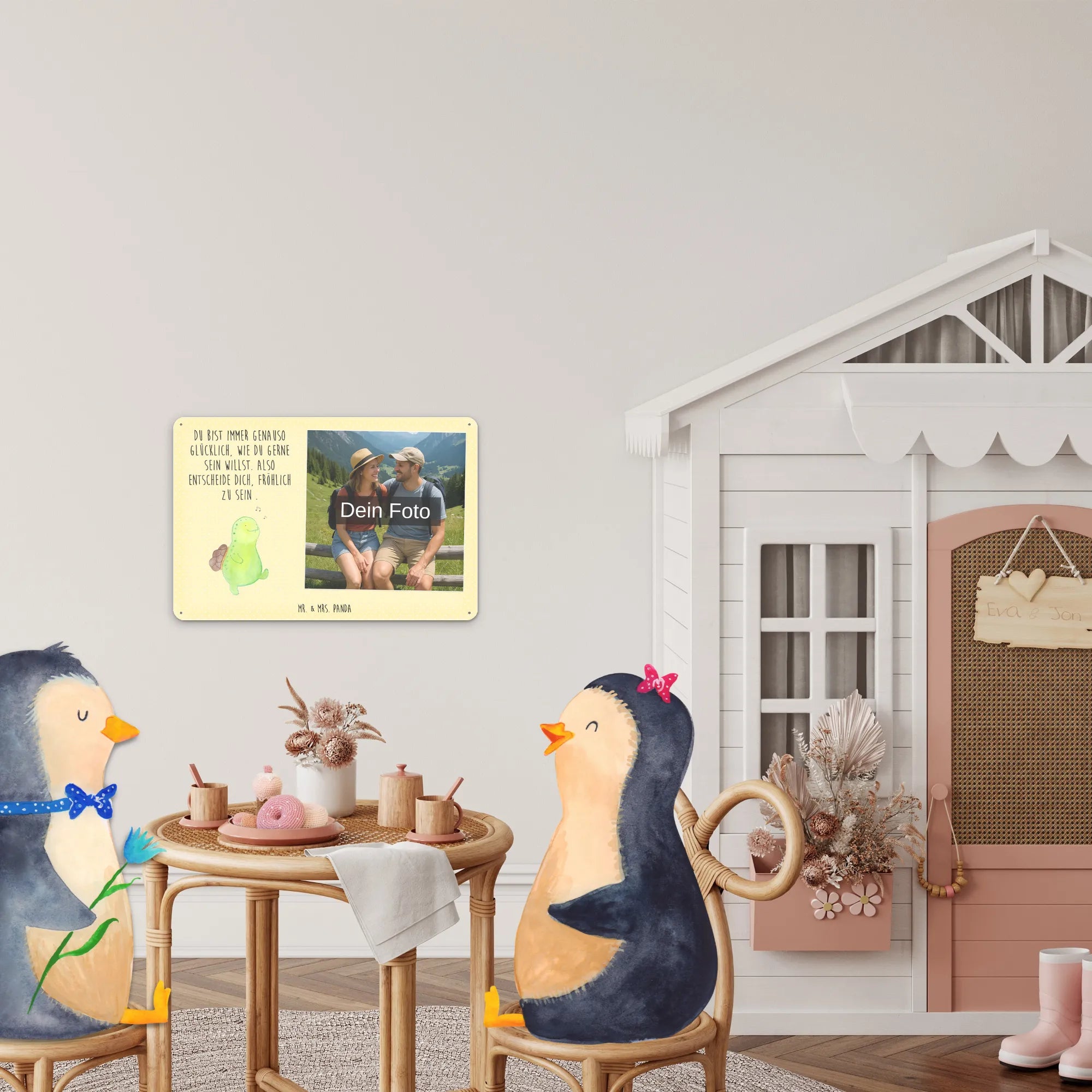 Ein personalisiertes Foto Blechschild von Mr. & Mrs. Panda – edel, freundlich und wunderbar als Geschenk. Unsere Motive und Sprüche verleihen deinem Foto zusätzlichen Charme, gedruckt wird auf hochwertigem Stahlblech ohne Wölbung mit seidenmatter, langlebiger Oberfläche. Maße: 70 mm x 420 mm x 297 mm. Das Schild hat 4 Bohrungen zur Befestigung, sichere umgefaltze Kanten und abgerundete Ecken für ein sauberes Erscheinungsbild. Vor dem Upload deines Wunschfotos: Achte auf hohe Auflösung, einen passenden Bildausschnitt (sieh dir unsere Platzhalter-Vorschau an) und darauf, dass du die Bildrechte besitzt. Perfekt als Türschild oder Wanddeko im Innenbereich, leicht mit einem feuchten Tuch zu reinigen. In verschiedenen Größen erhältlich, sodass du das ideale Format für dein Zuhause findest. Ob als Geschenk für Freunde, Familie oder als persönliche Dekoration – dieses personalisierte Foto Blechschild von Mr. & Mrs. Panda verbindet liebevolle Designs mit hochwertiger Verarbeitung und einfacher Montage. Gestalte dein Unikat und bring ein kleines Stück Panda-Glück in dein Zuhause.