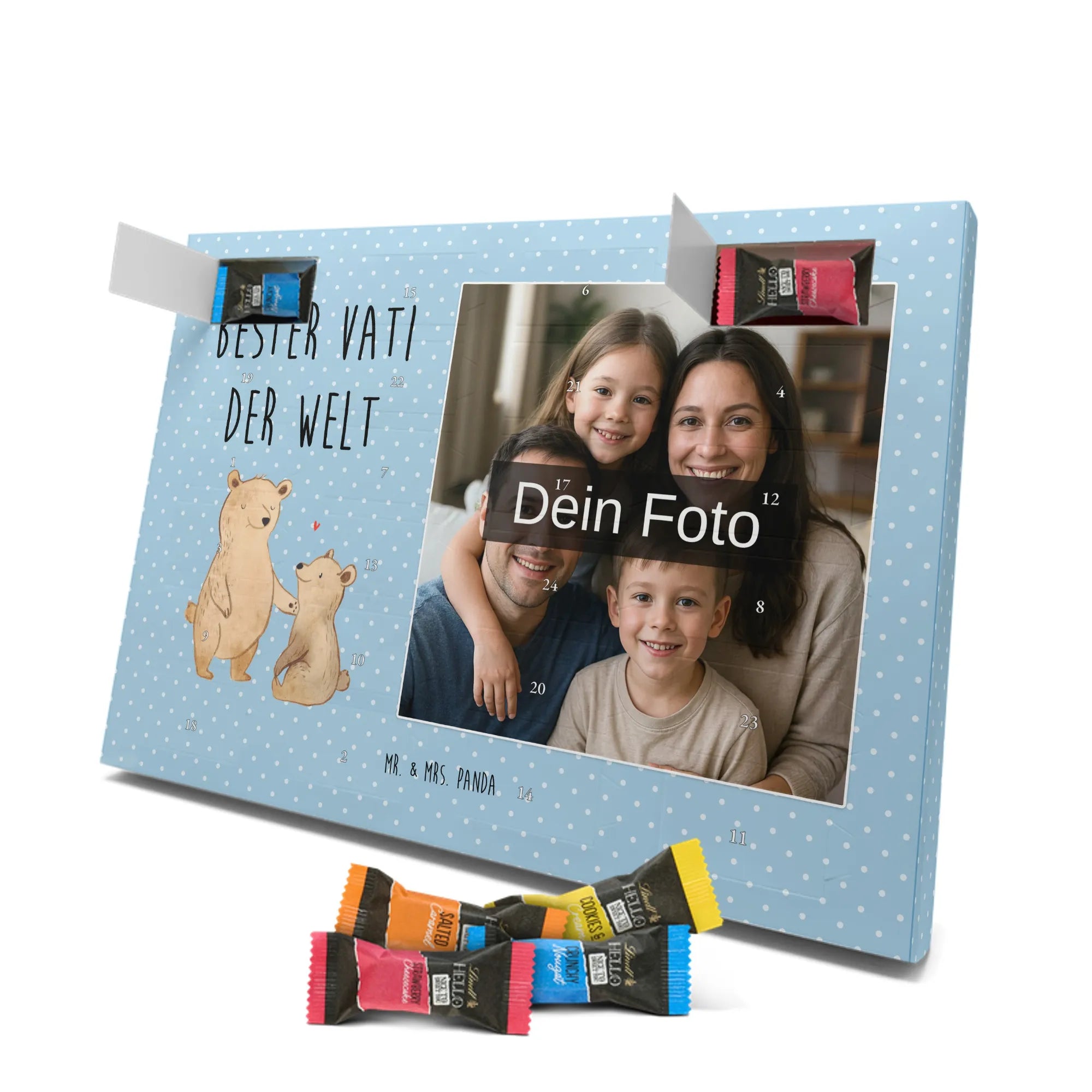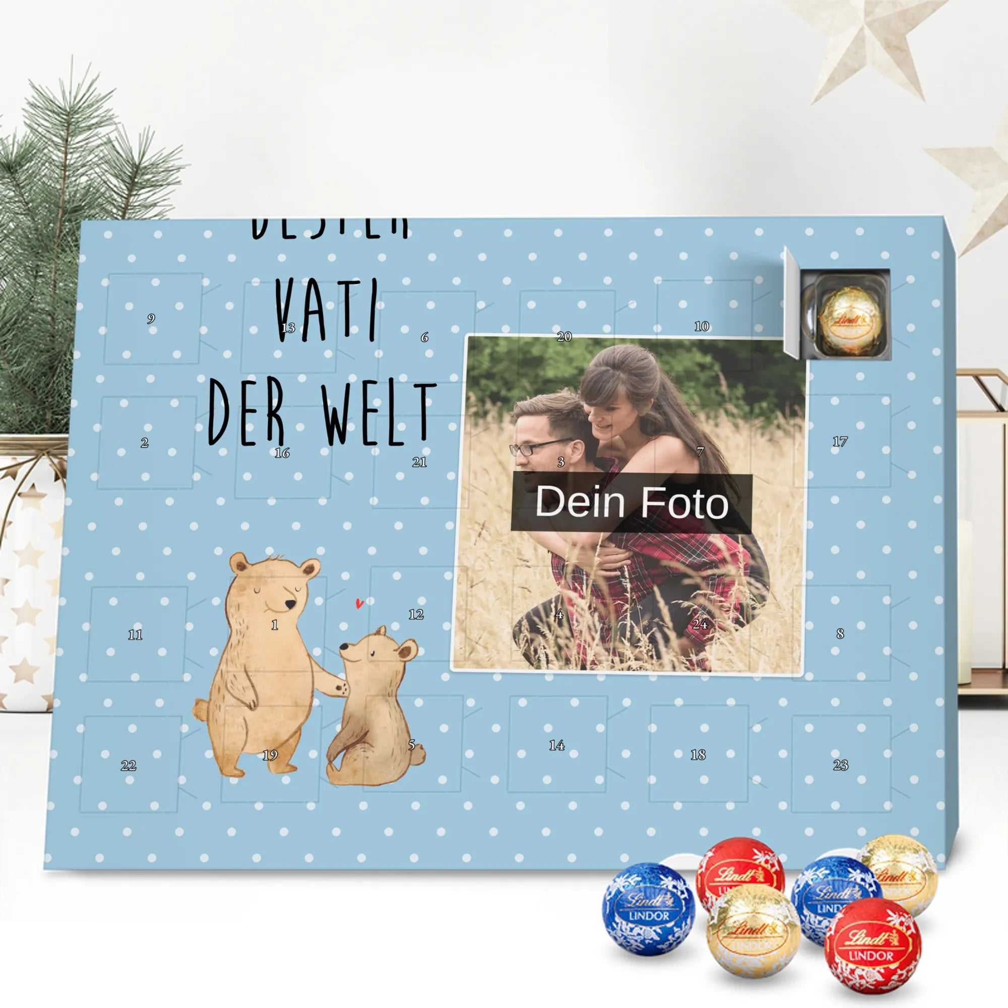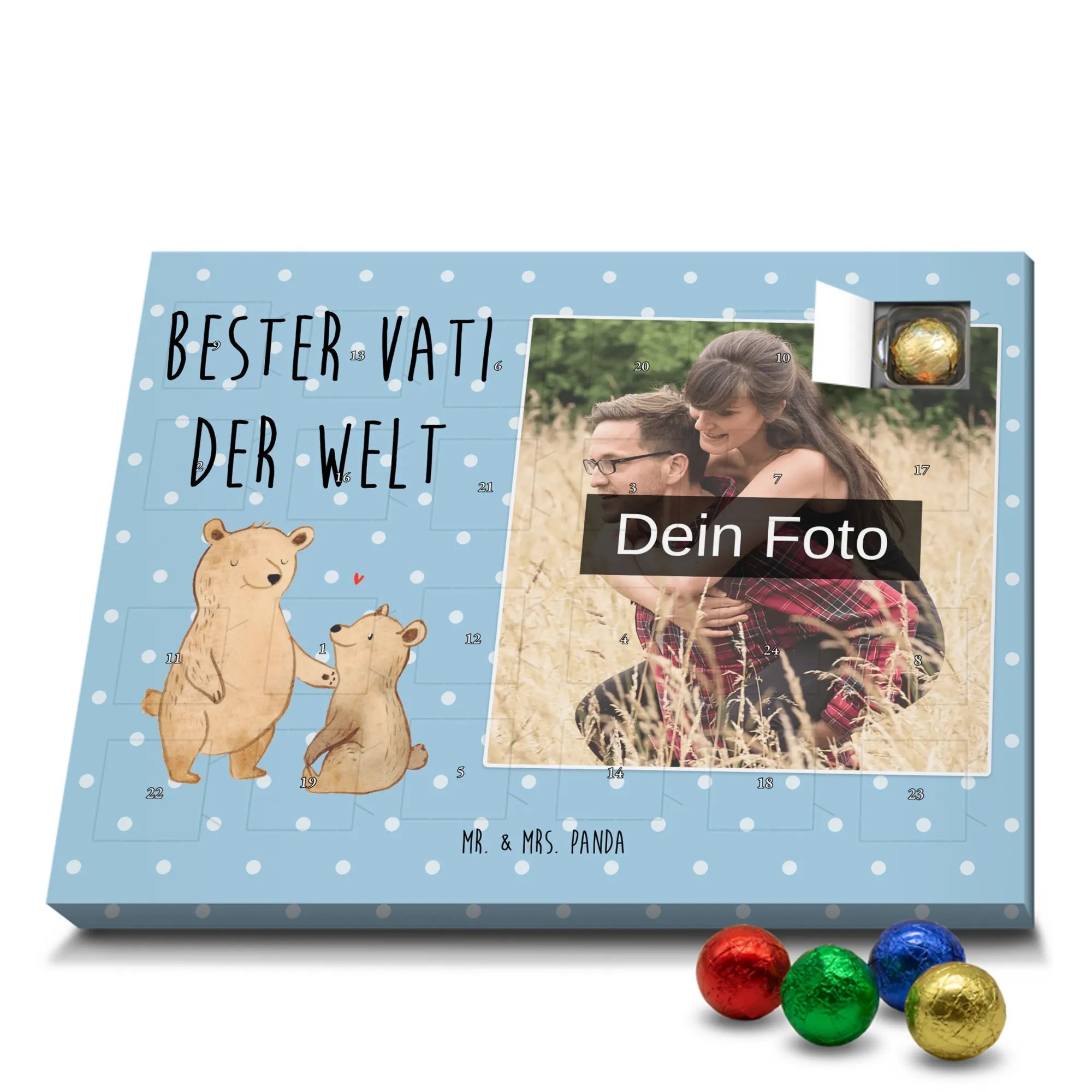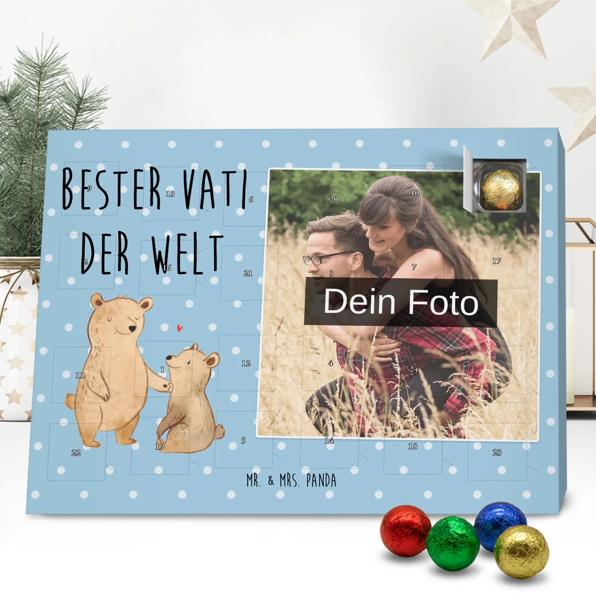 Discover the magic of waiting for Christmas with our exclusive Personalized Chocolate Photo Advent Calendar from Mr. & Mrs. Panda. This unique gift can be personalized with your own photo and is surrounded by beautiful designs and quotes. Enjoy a high-quality chocolate sphere in a variety of colors each day during the Advent season, while the silver sheen of the photo print in brilliant quality enchants your room. Perfect for capturing special moments and enhancing the anticipation of Christmas.