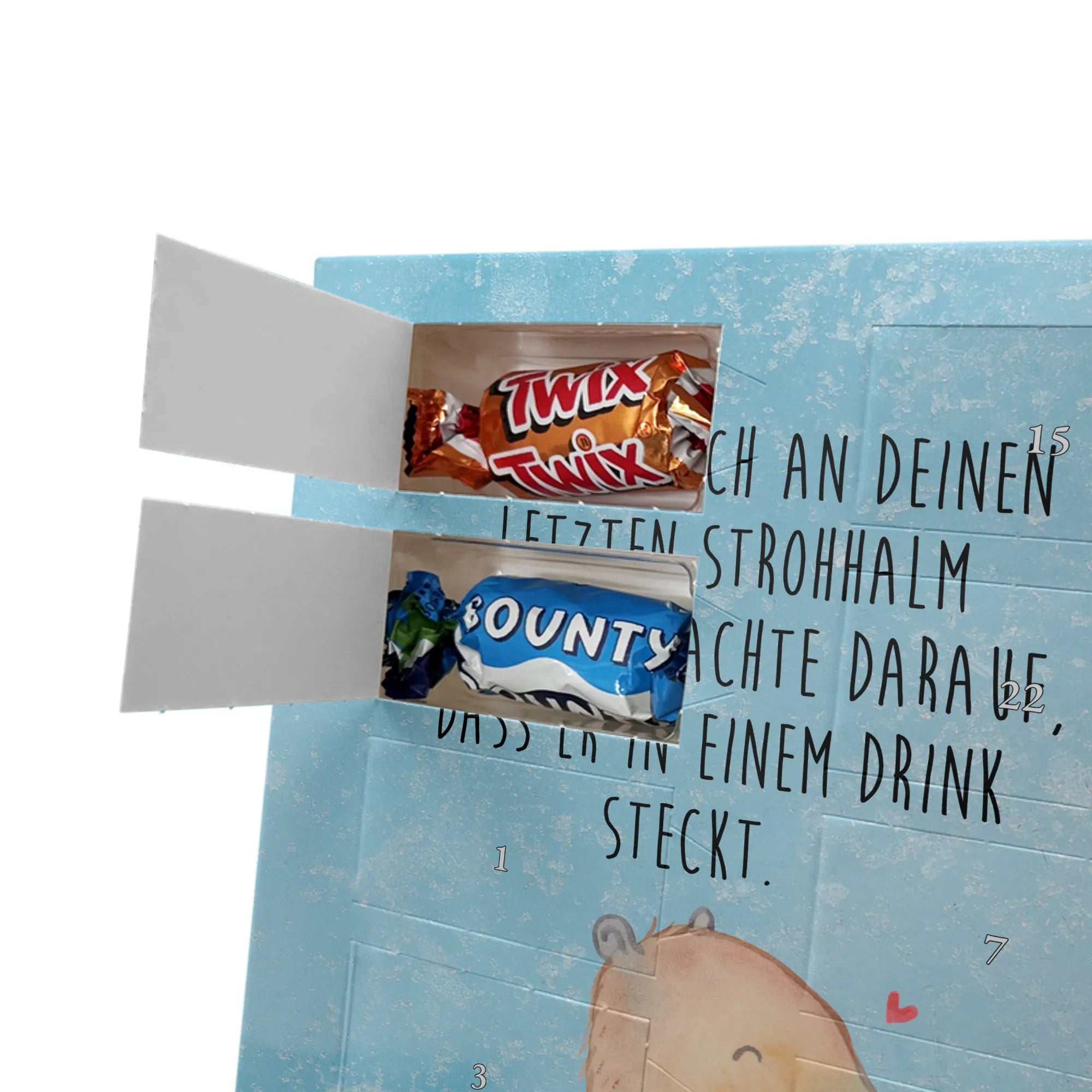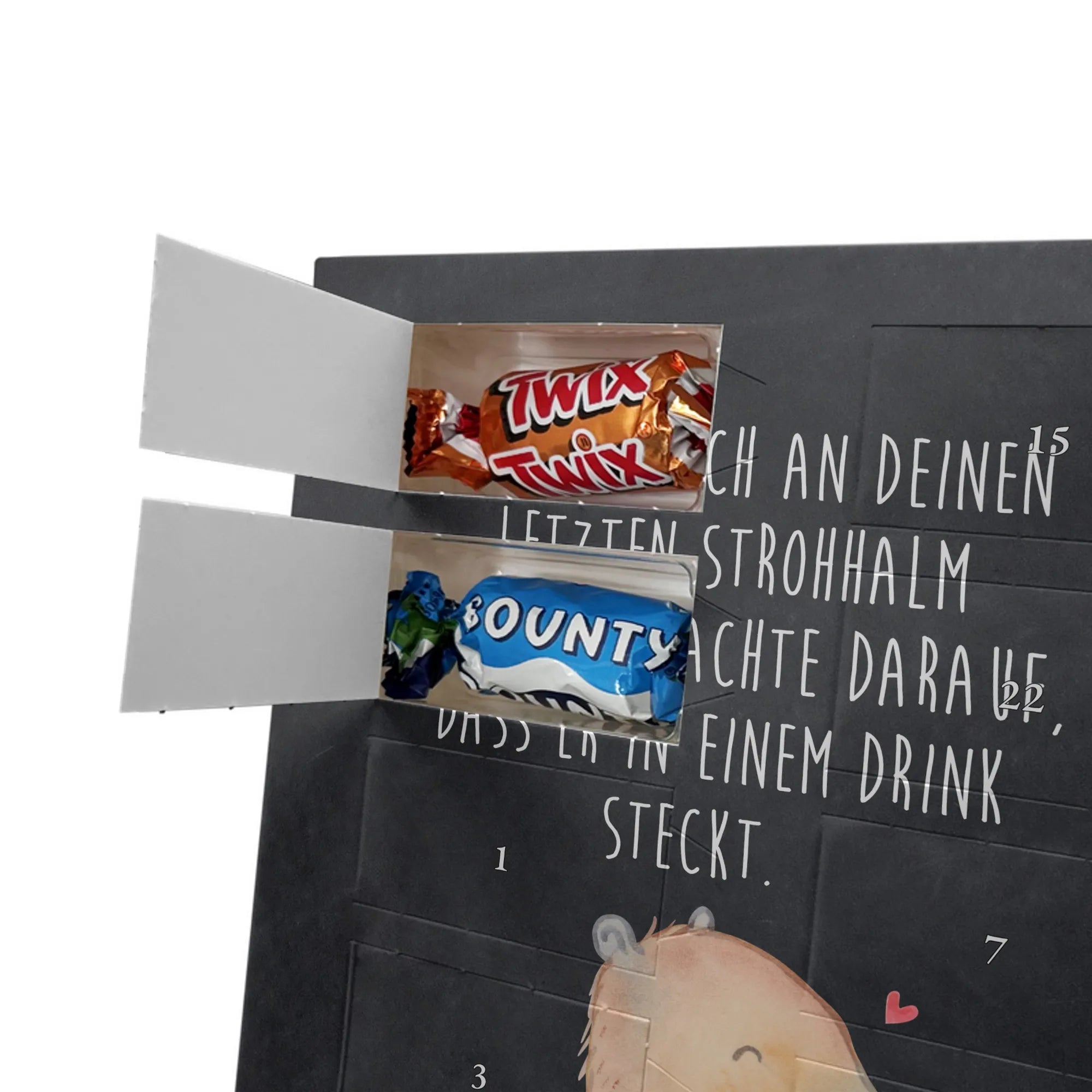 Charmanter Personalisierter Adventskalender mit Schoko-Foto von Mr. & Mrs. Panda – eine liebevolle Art, die Adventszeit zu personalisieren. Der Kalender ist mit den typischen Mr. & Mrs. Panda Motiven und herzlichen Sprüchen bedruckt; du kannst die Vorderseite mit deinem Lieblingsfoto gestalten. Achte auf eine hohe Auflösung deines Fotos, damit das Druckbild schön scharf wird, und kontrolliere den Bildausschnitt, damit keine wichtigen Details verloren gehen. Bitte lade nur Bilder hoch, für die du die Bildrechte besitzt oder eine Erlaubnis zur Nutzung vorliegt. Die Verarbeitung ist hochwertig: brillante Druckqualität, seidenmatte Oberflächenveredelung und bedruckte Seitenflächen für ein rundes Design. Maße: 325 mm x 225 mm x 27 mm. Der Kalender kann aufgehängt oder aufgestellt werden – ganz nach Belieben. Wichtig: Die Fotos werden nicht nachbearbeitet oder zugeschnitten; personalisierte Foto-Artikel sind vom Widerruf ausgenommen. Gefüllt ist der Adventskalender mit Celebrations Schokolade – 24 feine Füllungen in 8 verschiedenen Sorten (Maltesers, Mars, Snickers, Twix, Milky Way, Bounty, Galaxy, Galaxy Caramel). Ein persönliches Geschenk, das Erinnerungen und Genuss wunderbar verbindet.