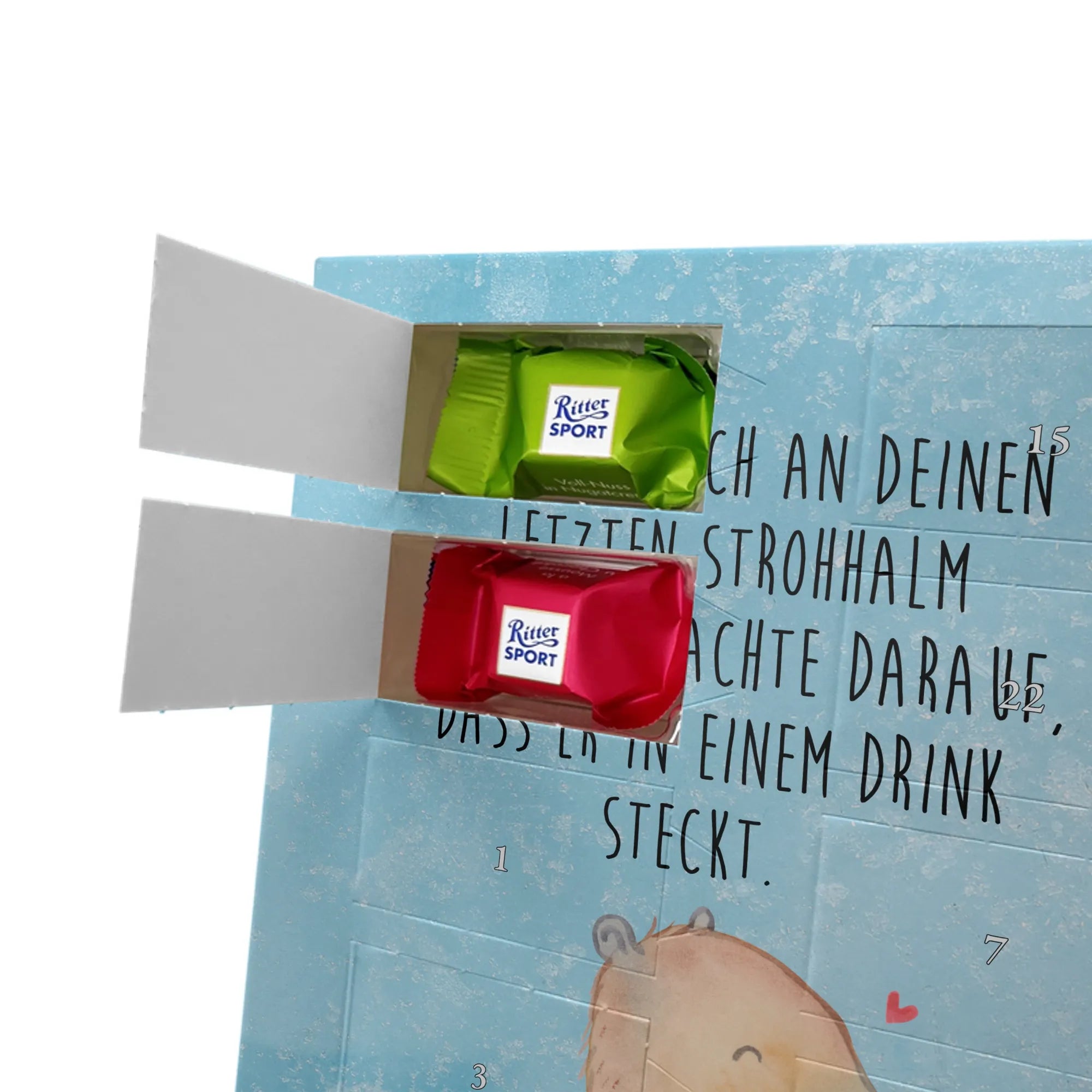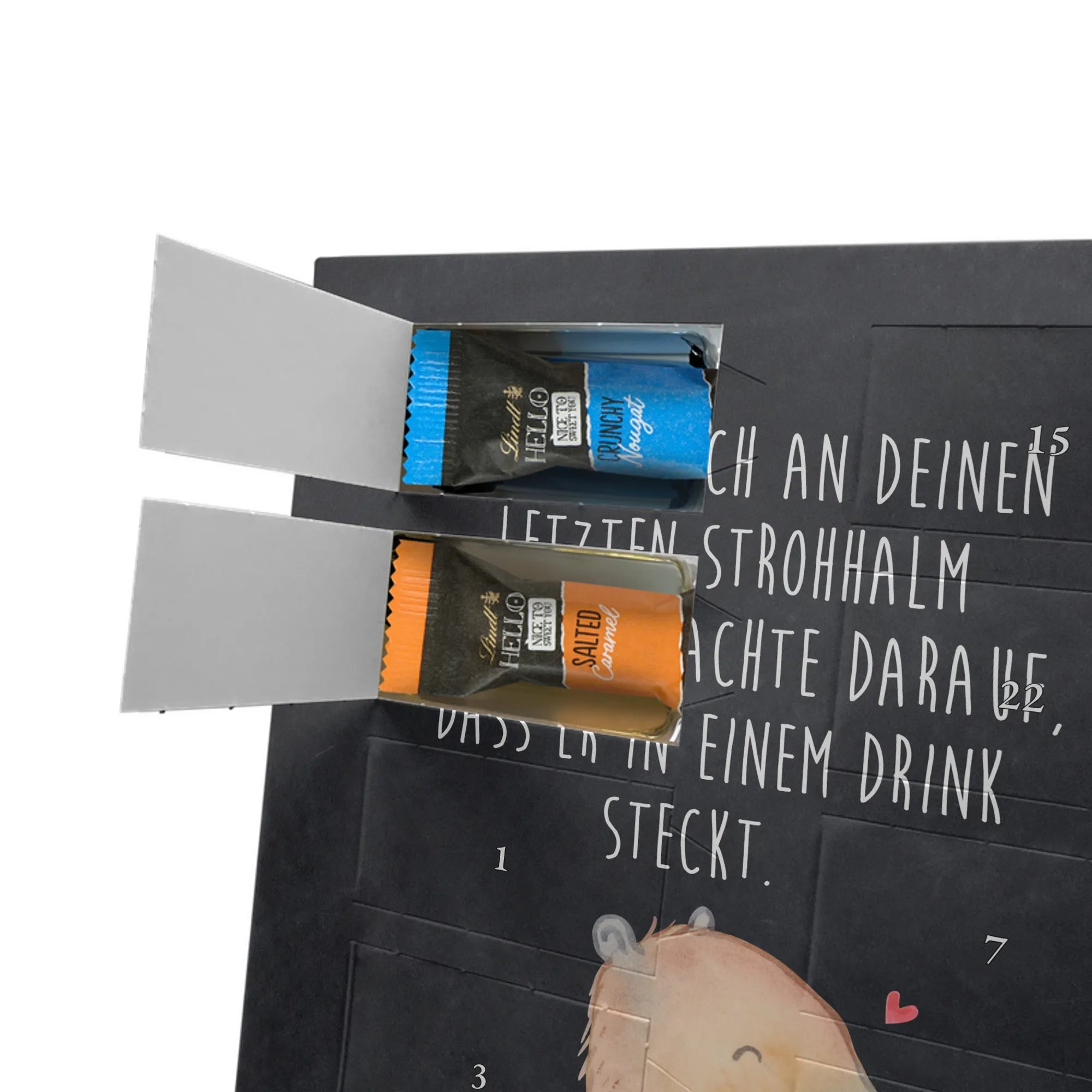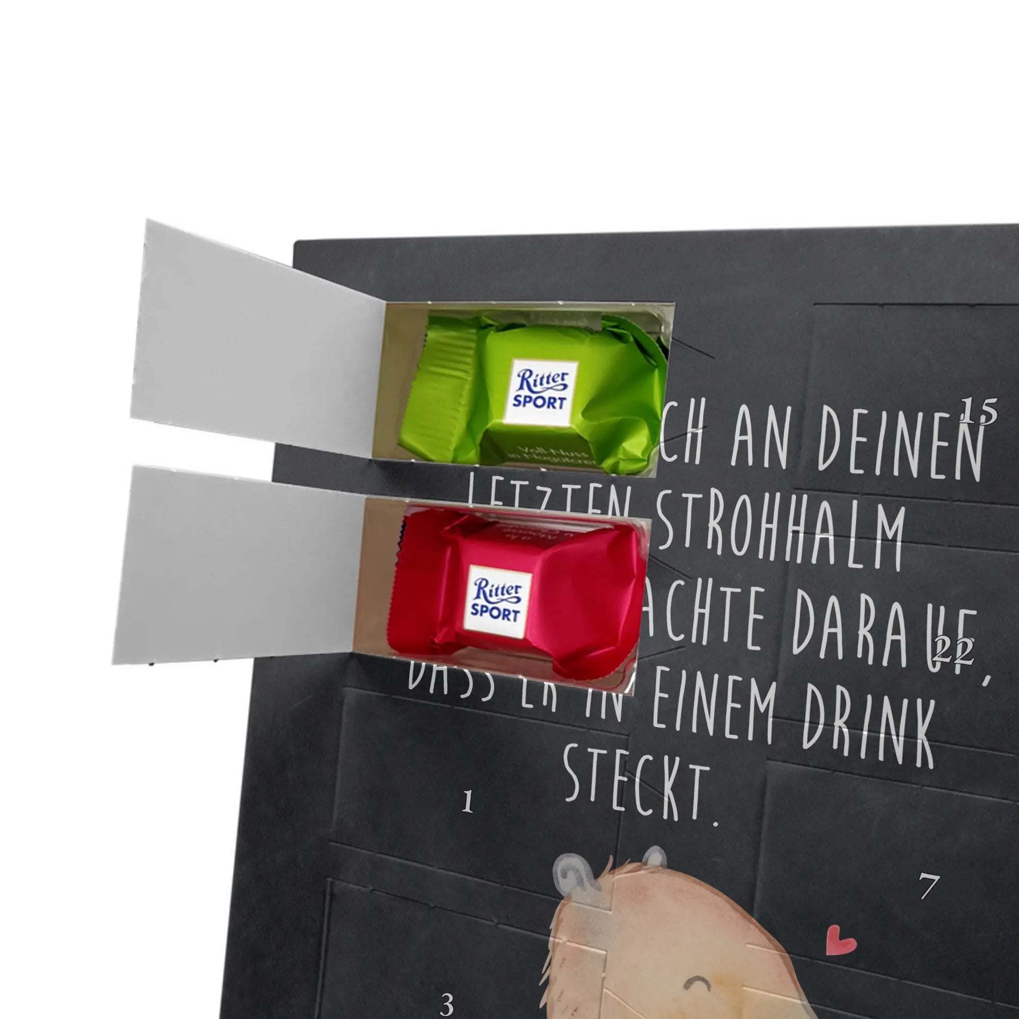 Wunderschöner Personalisierter Schoko Foto Adventskalender von Mr. & Mrs. Panda – das perfekte Geschenk für deine Liebsten! Dieser Adventskalender ist liebevoll gestaltet, bedruckt mit wunderschönen Motiven & Sprüchen von Mr. & Mrs. Panda und personalisierbar mit einem Foto deiner Wahl. Achte bitte auf hohe Auflösung: Lade ein Foto in guter Qualität und ausreichender Auflösung hoch, damit das Druckergebnis klar und brillant wird. Achte auf den richtigen Bildausschnitt, damit keine wichtigen Details abgeschnitten werden. Wir empfehlen, den Kalender-Rahmen vorher anzusehen, um zu wissen, wie dein Foto platziert wird. Lade nur Bilder hoch, bei denen du die Bildrechte besitzt oder die Erlaubnis hast. Die Fotos werden weder aufbereitet noch zugeschnitten. Rücknahme bei personalisierten Foto Artikeln ist ausgeschlossen. Der Kalender besticht durch brillante Druckqualität mit seidenmatter Oberflächenveredelung und bedruckte Seitenflächen. Maße: 325 mm x 225 mm x 27 mm. Besonderheit: Kann aufgehängt oder aufgestellt werden – ganz wie du möchtest. Gefüllt ist der Kalender mit Ritter Sport Schokowürfeln in leckeren Geschmacksrichtungen: Mousse au Chocolat, Schoko Crisp, Voll-Nuss in Nougatcreme, Karamell Duo, Joghurt und Erdbeer-Joghurt. Ein zauberhaftes, persönliches Geschenk, das Vorfreude bereitet und jeden Tag im Advent versüßt!