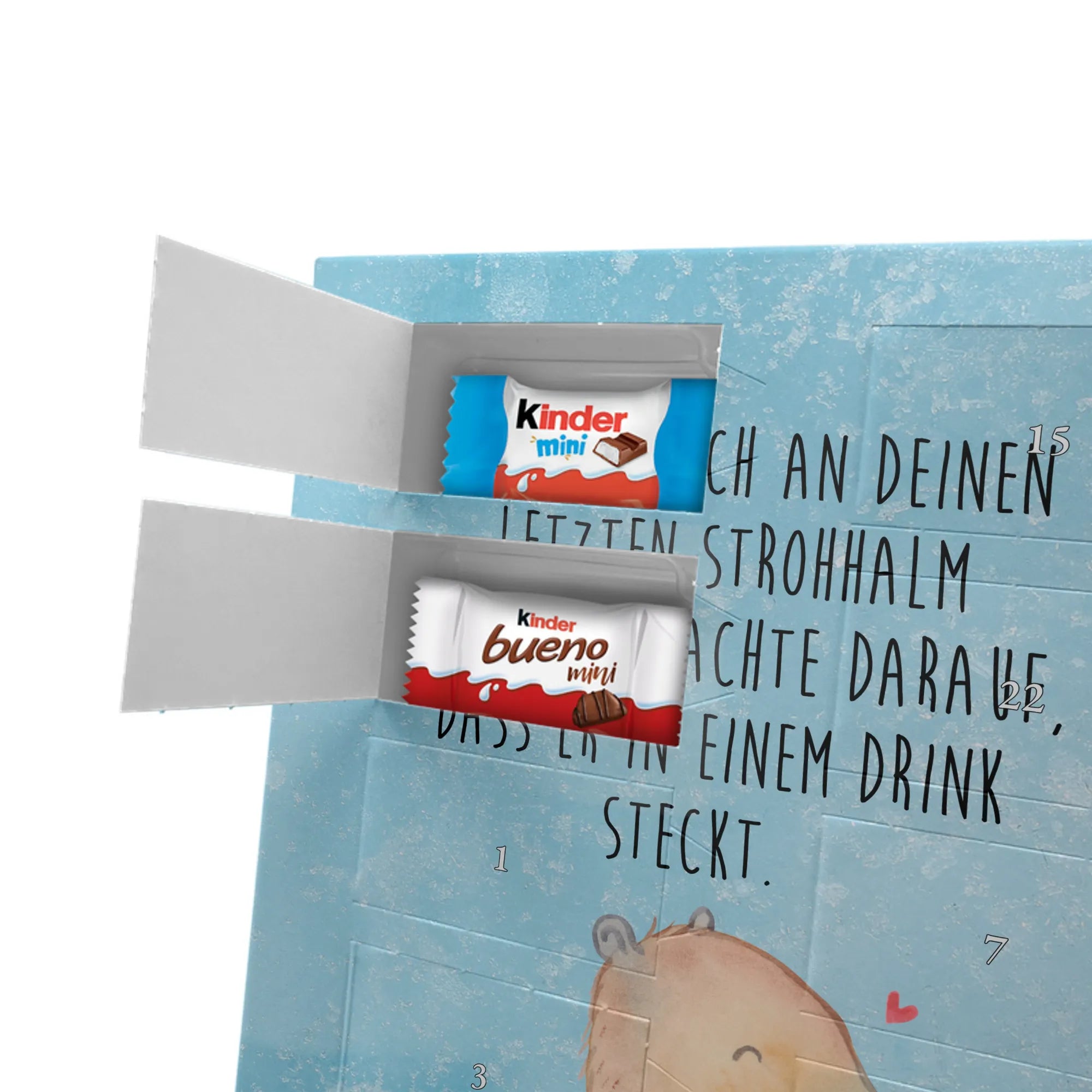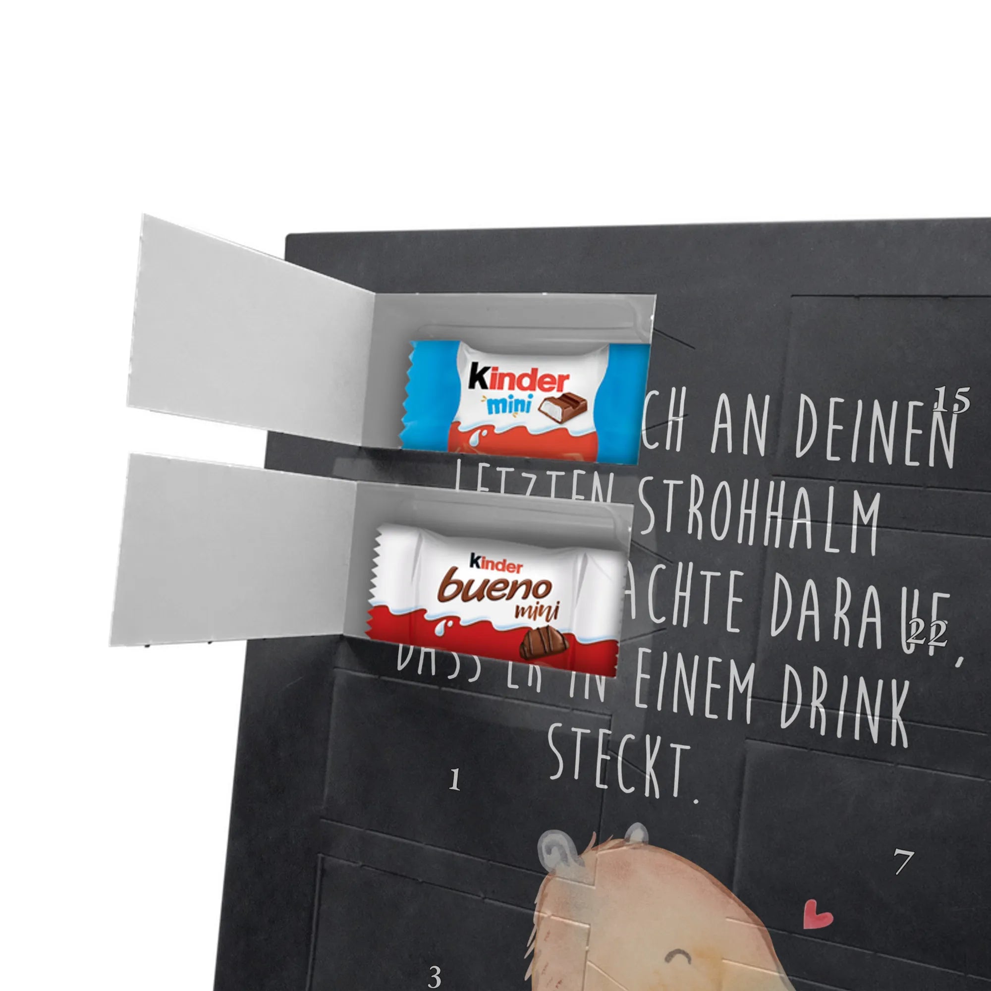 Unser personalisierten Schoko Foto Adventskalender ist ein echtes Highlight in der Adventszeit – handlich, individuell und voller süßer Überraschungen. Du personalisierst die Vorderseite mit deinem liebsten Foto und wir kombinieren es mit liebevollen Motiven und Sprüchen von Mr. & Mrs. Panda. Bitte achte auf eine ausreichende Bildauflösung und einen passenden Bildausschnitt, damit das Druckergebnis gestochen scharf ist. Lade nur Bilder hoch, deren Rechte du besitzt oder bei denen du die Erlaubnis hast, besonders wenn Personen darauf zu sehen sind. Wichtig: Fotos werden nicht retuschiert oder zugeschnitten; personalisierte Foto-Artikel sind vom Widerruf ausgeschlossen. Der Kalender besticht durch brillante Druckqualität und eine seidenmatte Oberflächenveredelung sowie bedruckte Seitenflächen. Maße: 355 mm x 245 mm x 11 mm. Du kannst ihn entweder aufstellen oder an die Wand hängen. Gefüllt ist der Adventskalender mit kinder® Schokolade, inklusive kinder® Schoko-Bons, kinder® Bueno mini und kinder® Schokolade mini. Ein liebevolles, persönliches Geschenk für Kinder, Freunde oder die bessere Hälfte – individuell, süß und mit dem typischen Mr. & Mrs. Panda Charme.