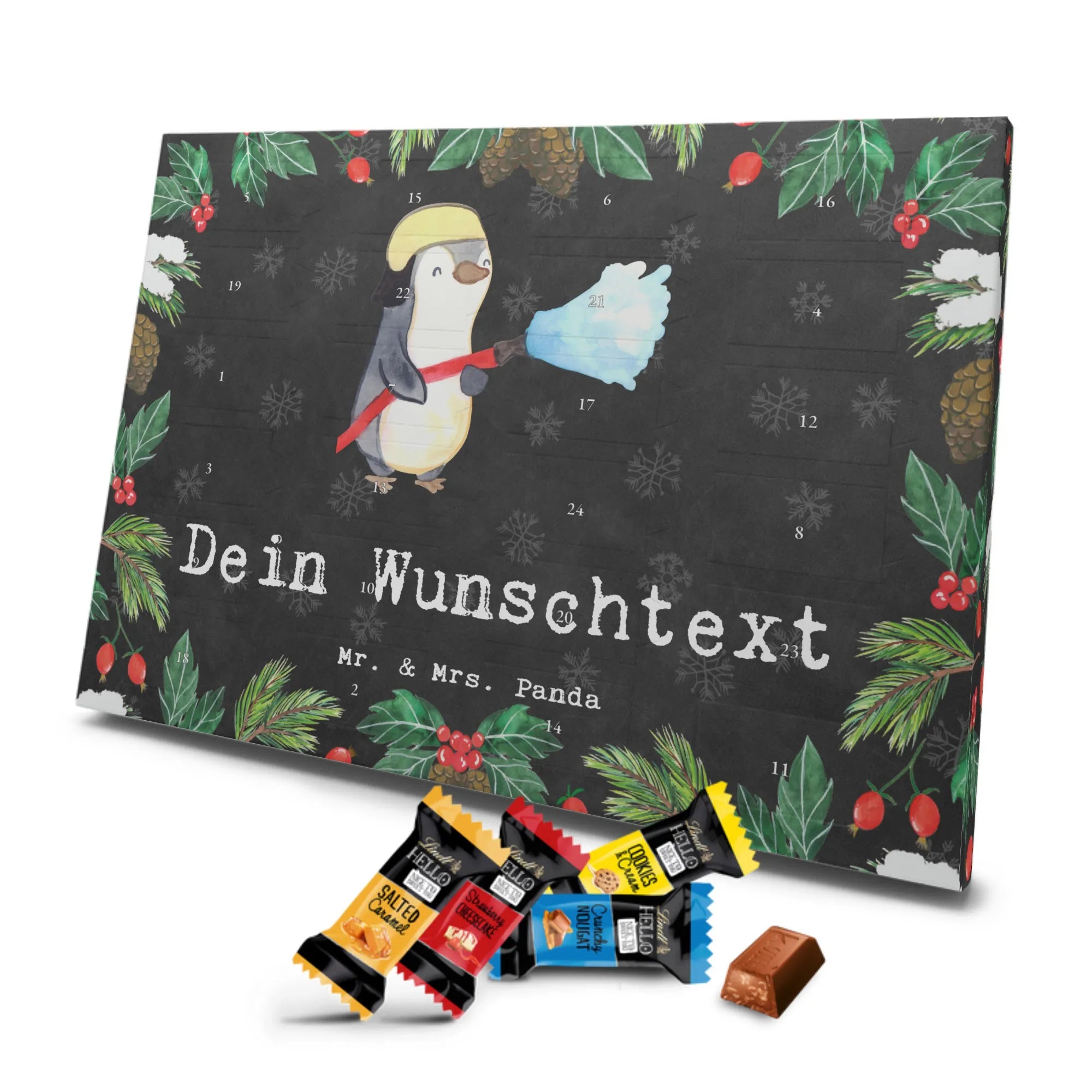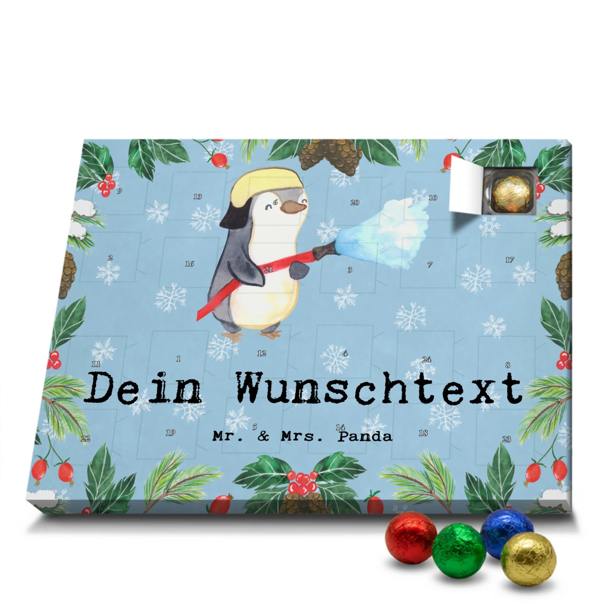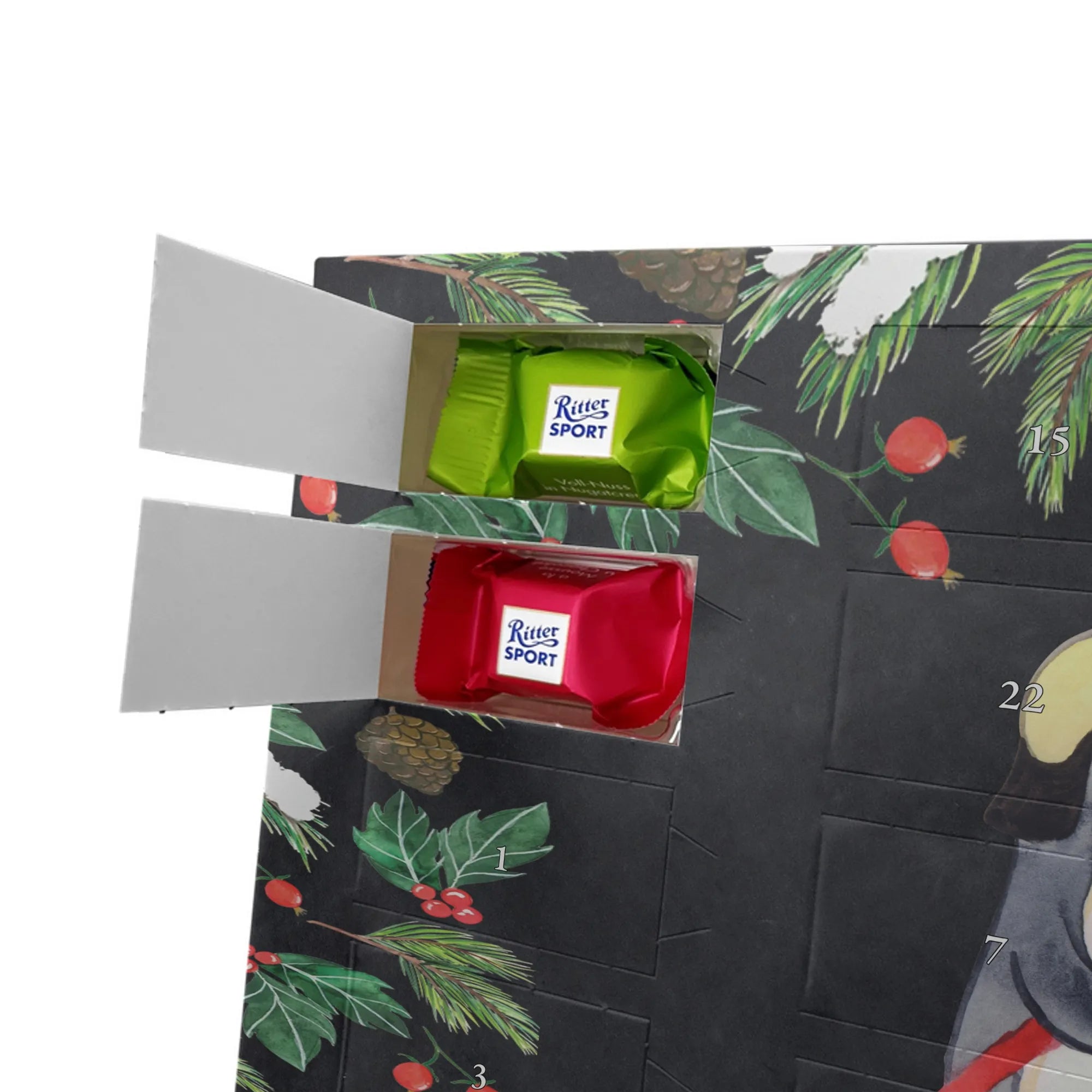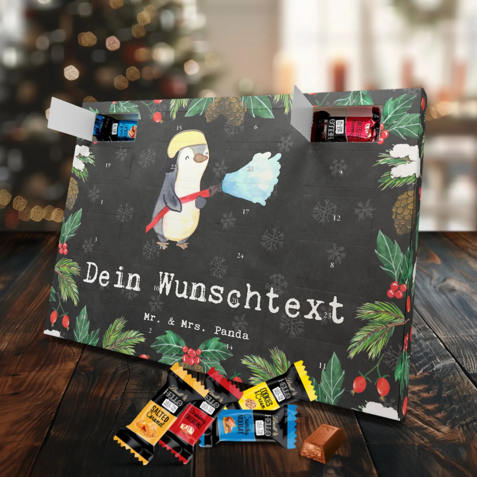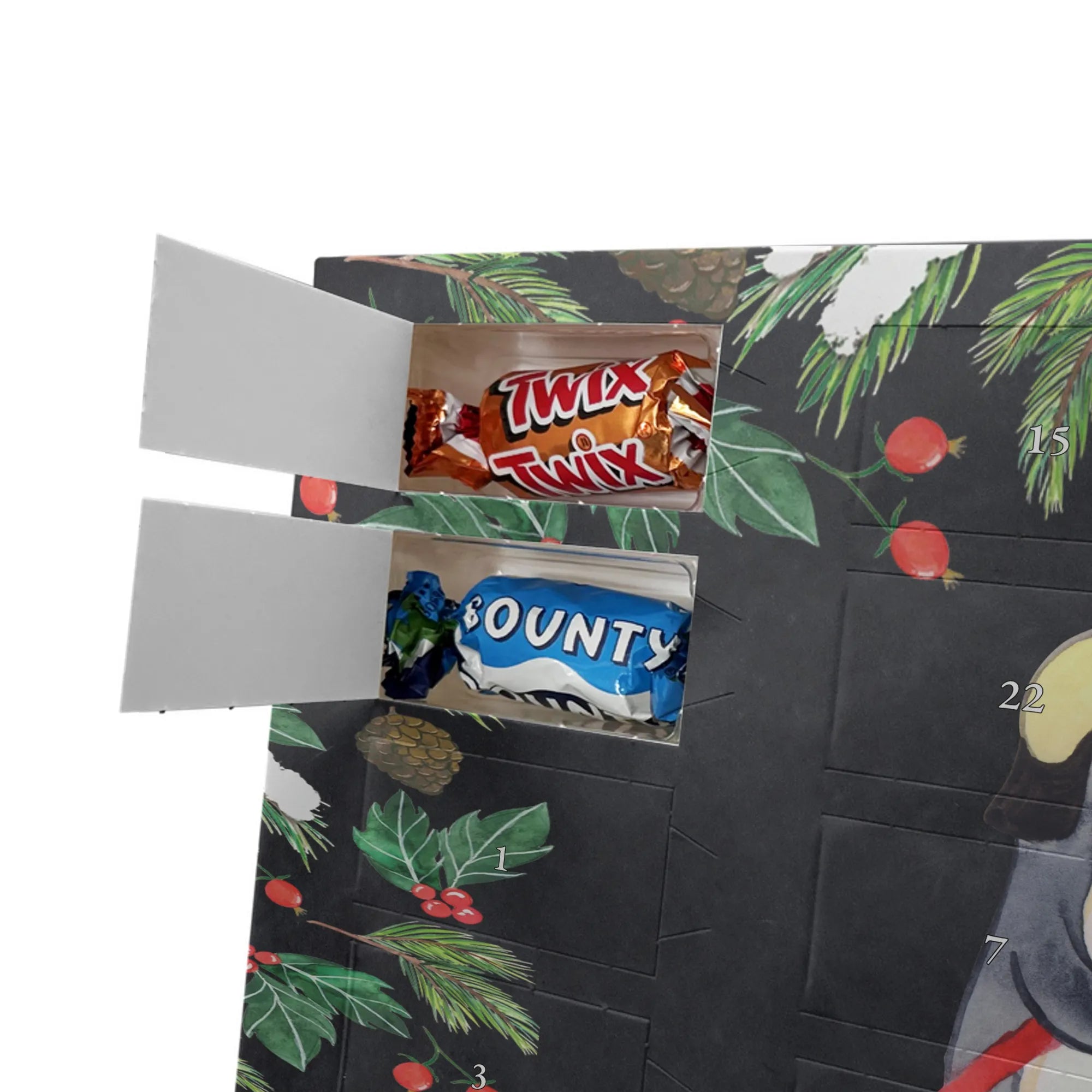 Make the Advent season even more special with the personalized chocolate Advent calendar from Mr. & Mrs. Panda. This unique Advent calendar is printed with your desired name or a custom text and features exclusive designs and sayings from the renowned designer duo. It's not only a visual highlight but also delights taste buds with 24 high-quality chocolate balls in various colors. The brilliant print quality and the silk-matte finish make this calendar a true eye-catcher during the Christmas season.
