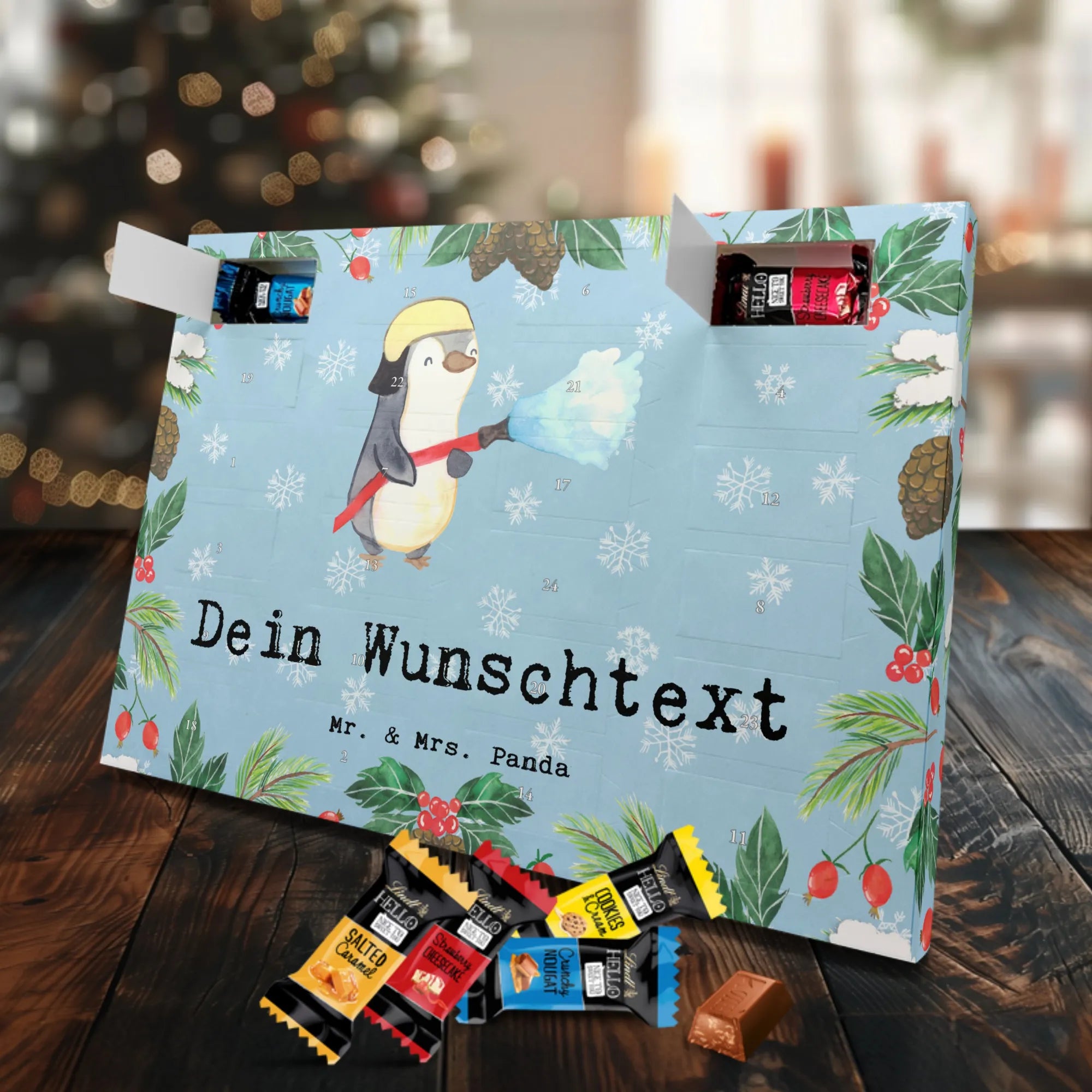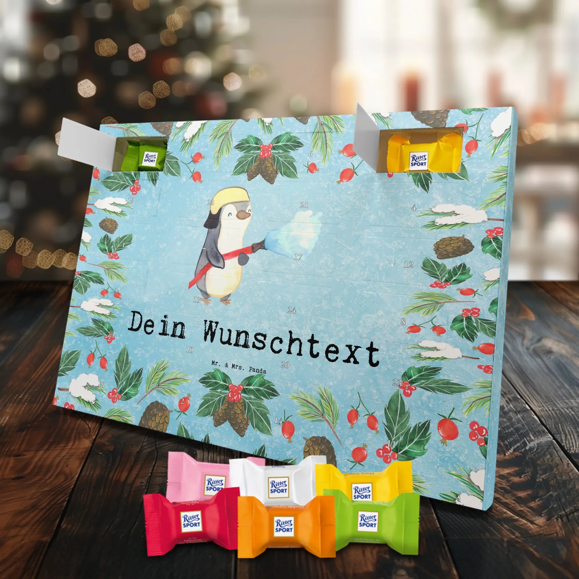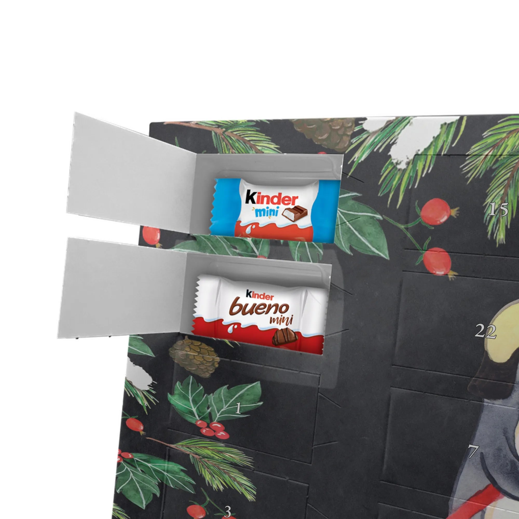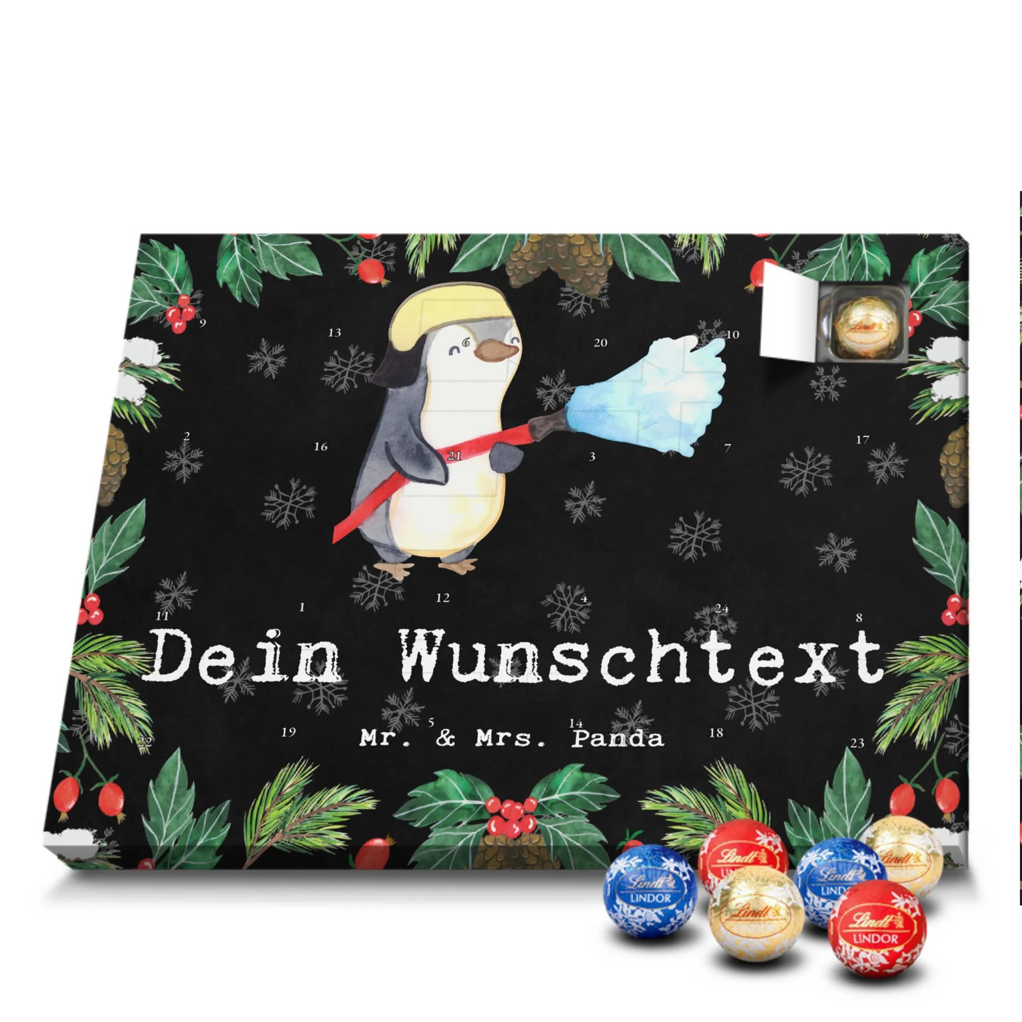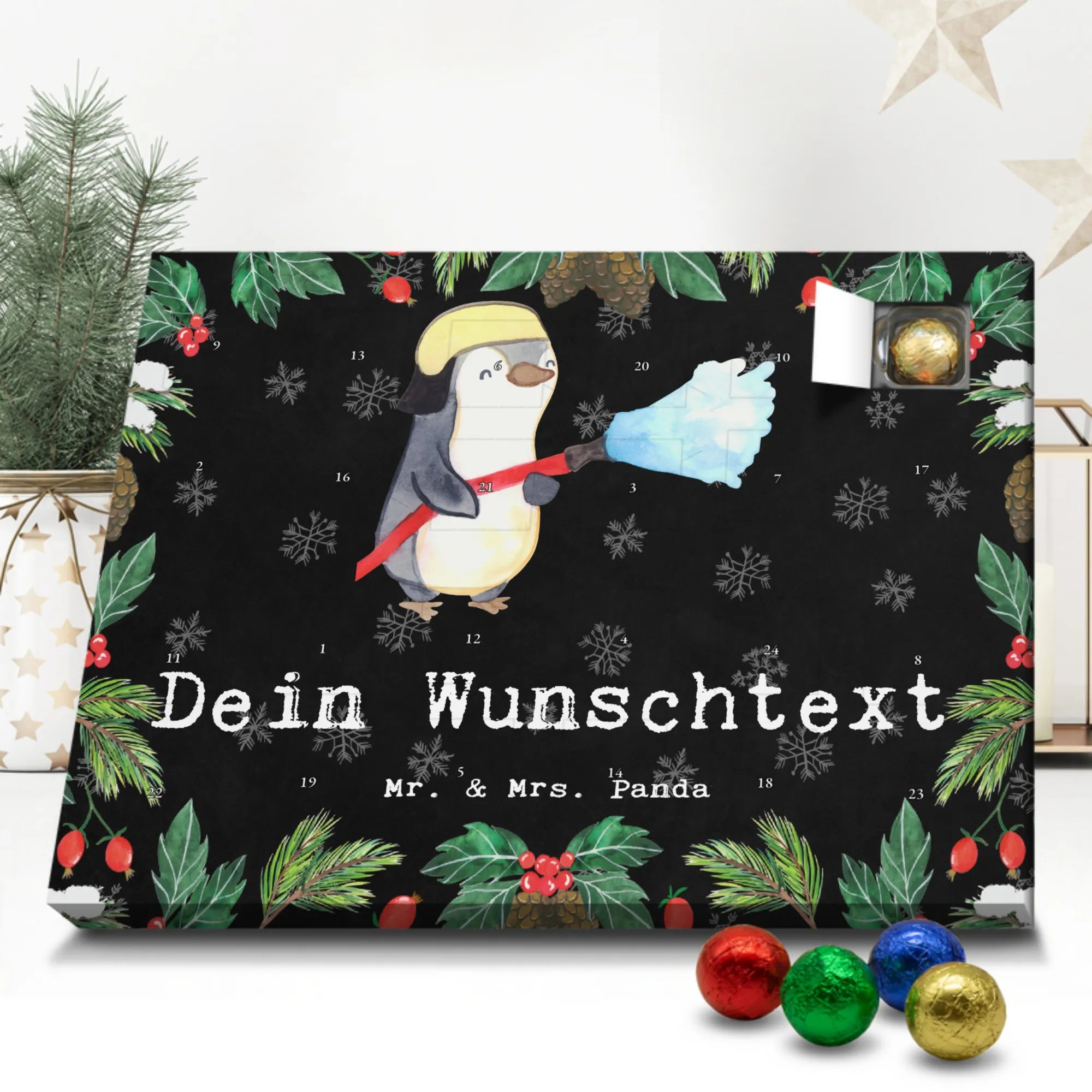 Make the Advent season even more special with the personalized chocolate Advent calendar from Mr. & Mrs. Panda. This unique Advent calendar is printed with your desired name or a custom text and features exclusive designs and sayings from the renowned designer duo. It's not only a visual highlight but also delights taste buds with 24 high-quality chocolate balls in various colors. The brilliant print quality and the silk-matte finish make this calendar a true eye-catcher during the Christmas season.