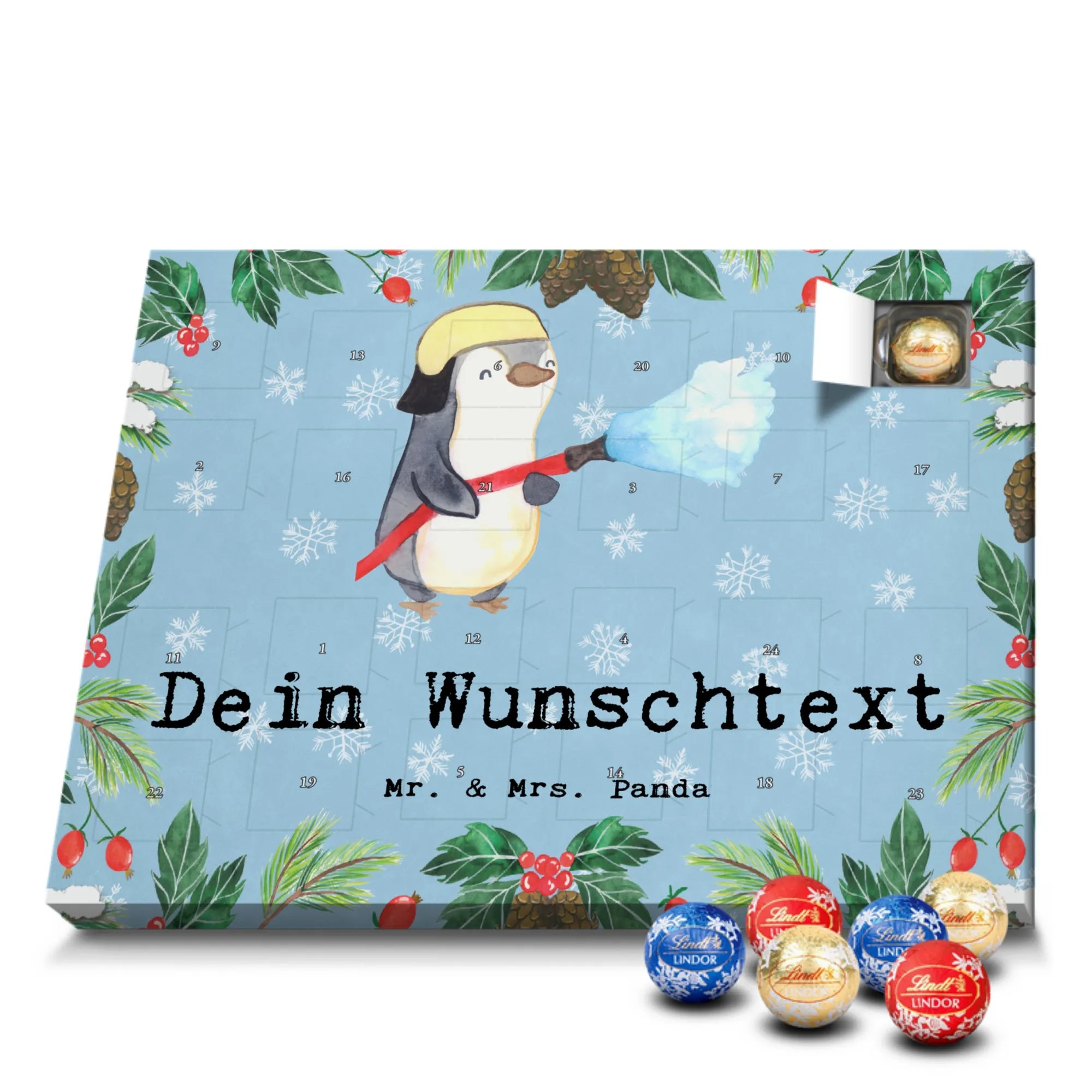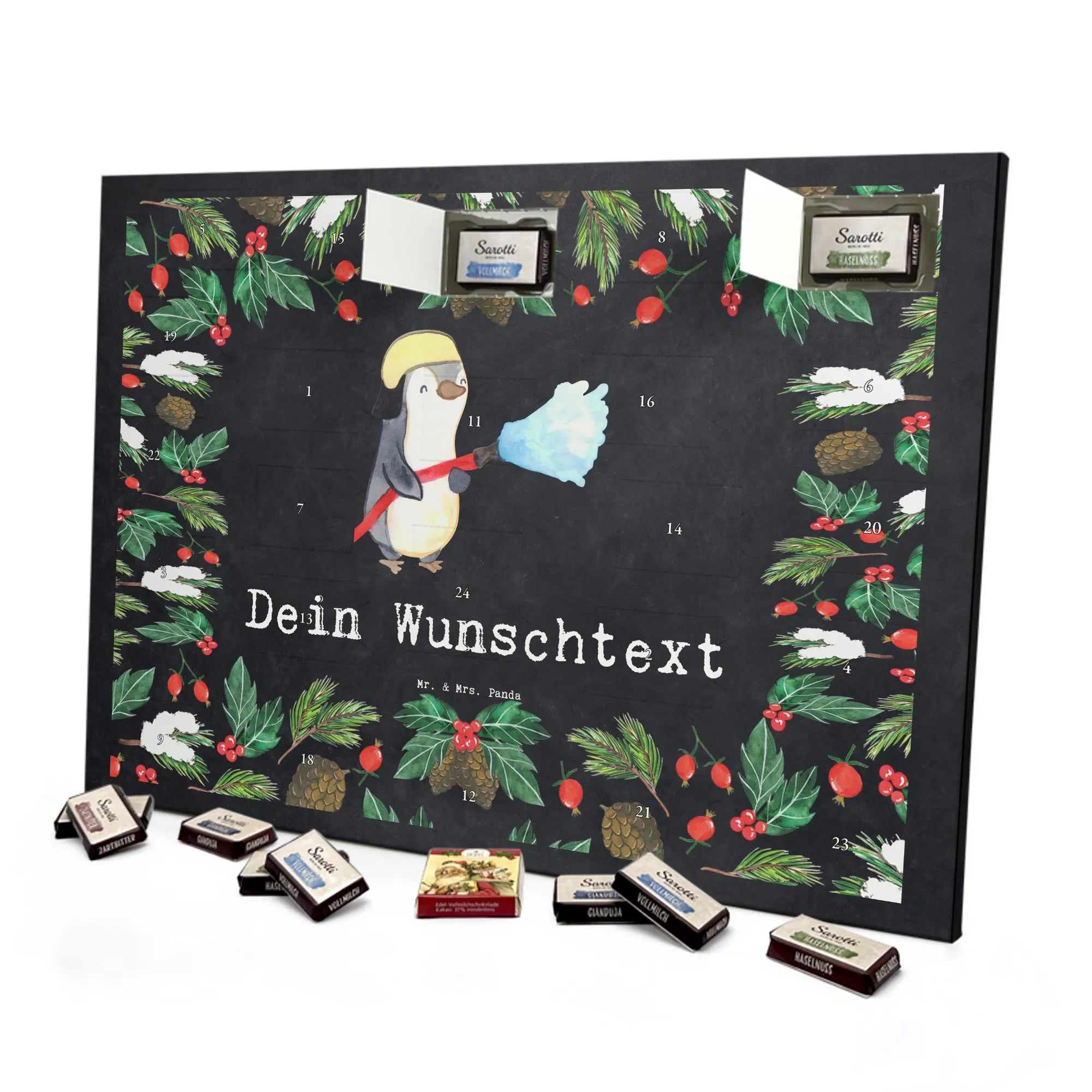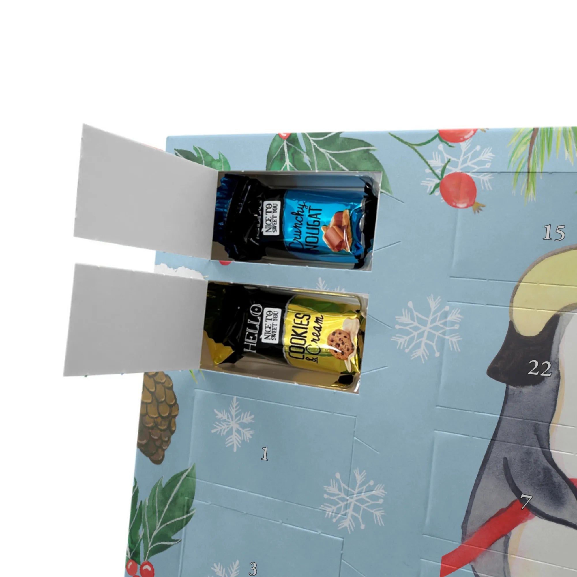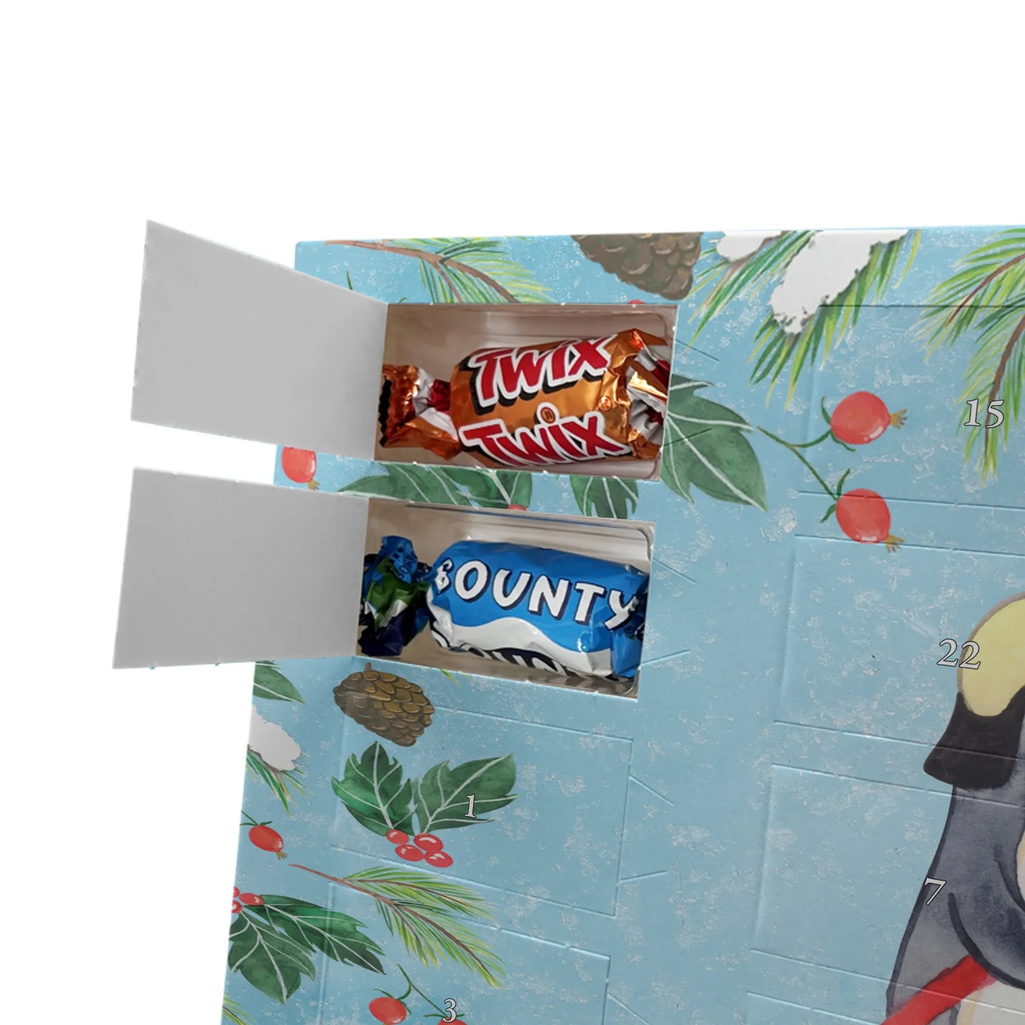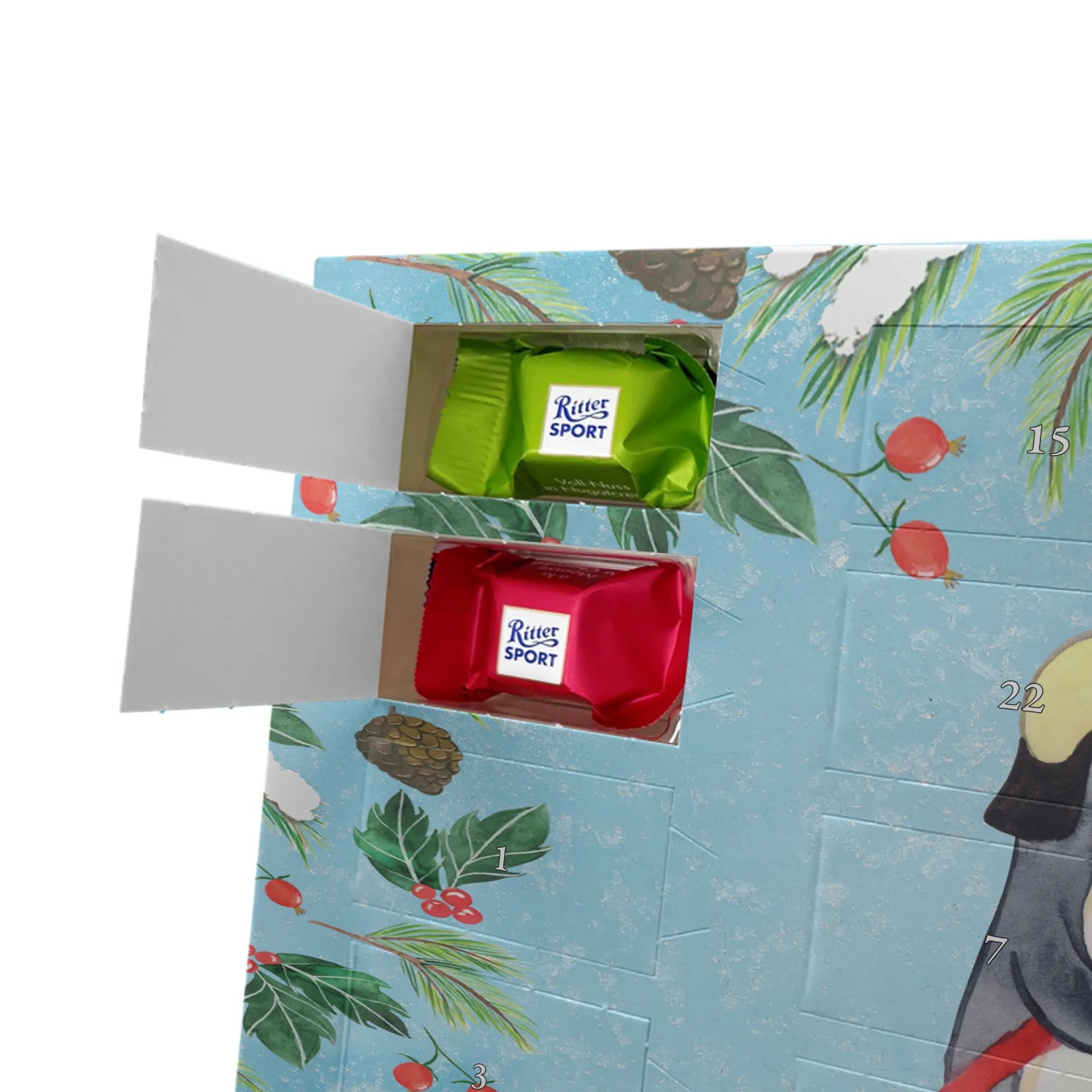 Make the Advent season even more special with the personalized chocolate Advent calendar from Mr. & Mrs. Panda. This unique Advent calendar is printed with your desired name or a custom text and features exclusive designs and sayings from the renowned designer duo. It's not only a visual highlight but also delights taste buds with 24 high-quality chocolate balls in various colors. The brilliant print quality and the silk-matte finish make this calendar a true eye-catcher during the Christmas season.