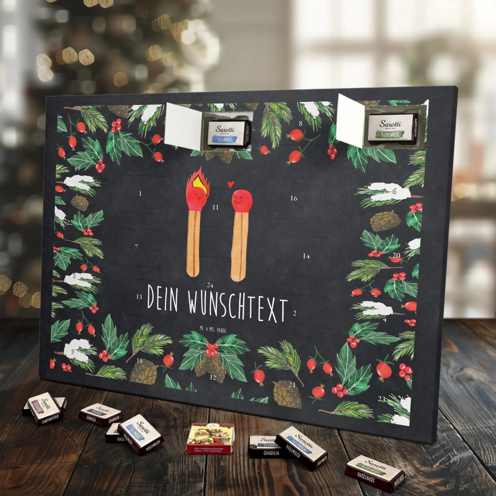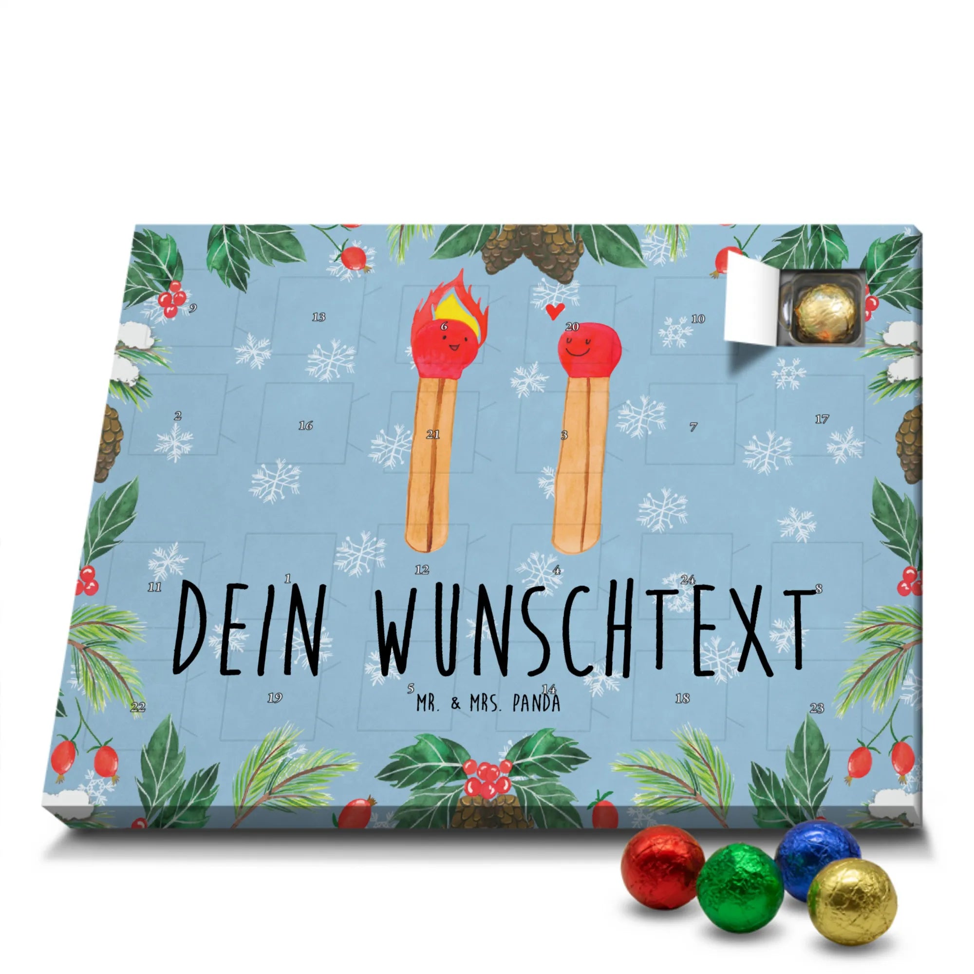 Make the Advent season even more special with the personalized chocolate Advent calendar from Mr. & Mrs. Panda. This unique Advent calendar is printed with your desired name or a custom text and features exclusive designs and sayings from the renowned designer duo. It's not only a visual highlight but also delights taste buds with 24 high-quality chocolate balls in various colors. The brilliant print quality and the silk-matte finish make this calendar a true eye-catcher during the Christmas season.
