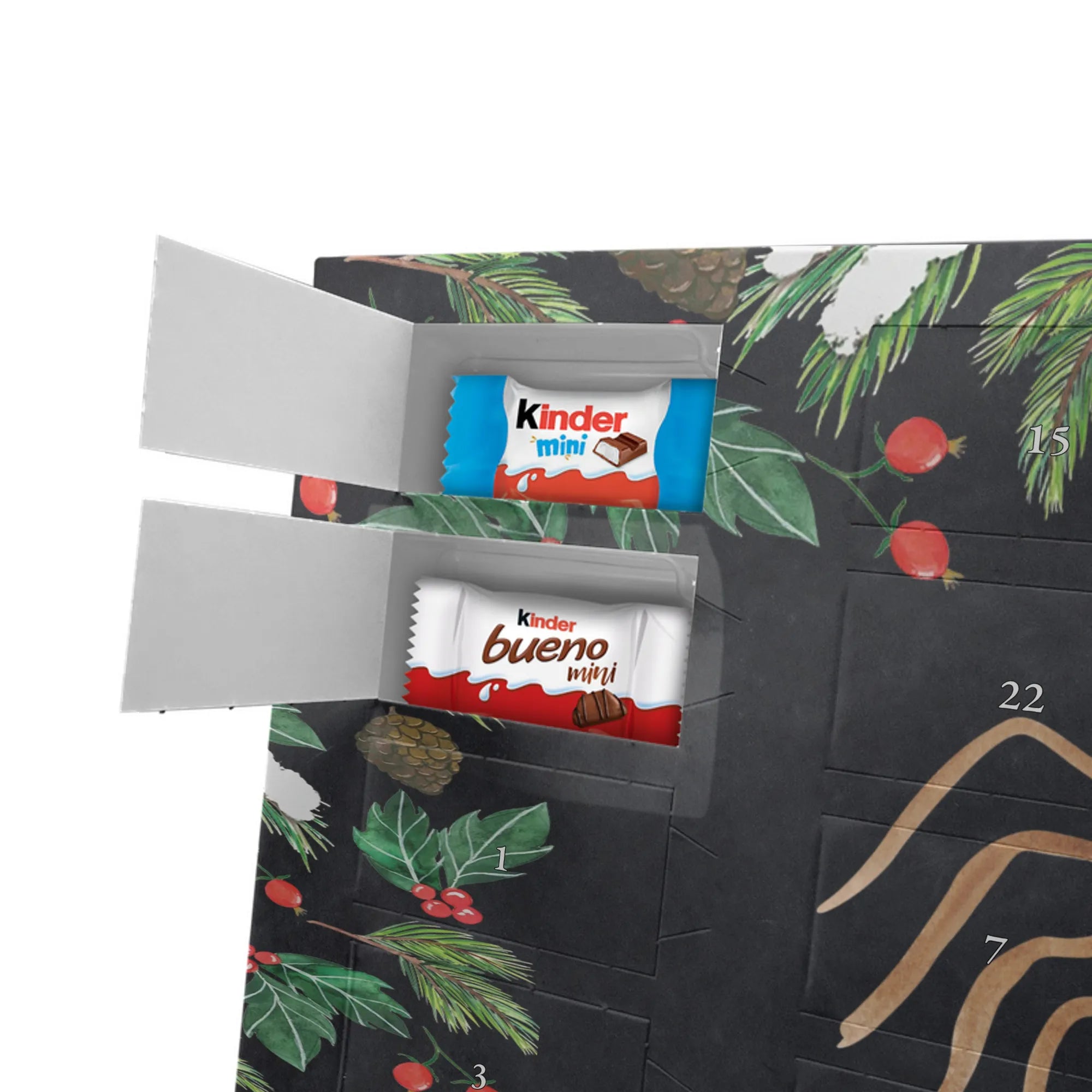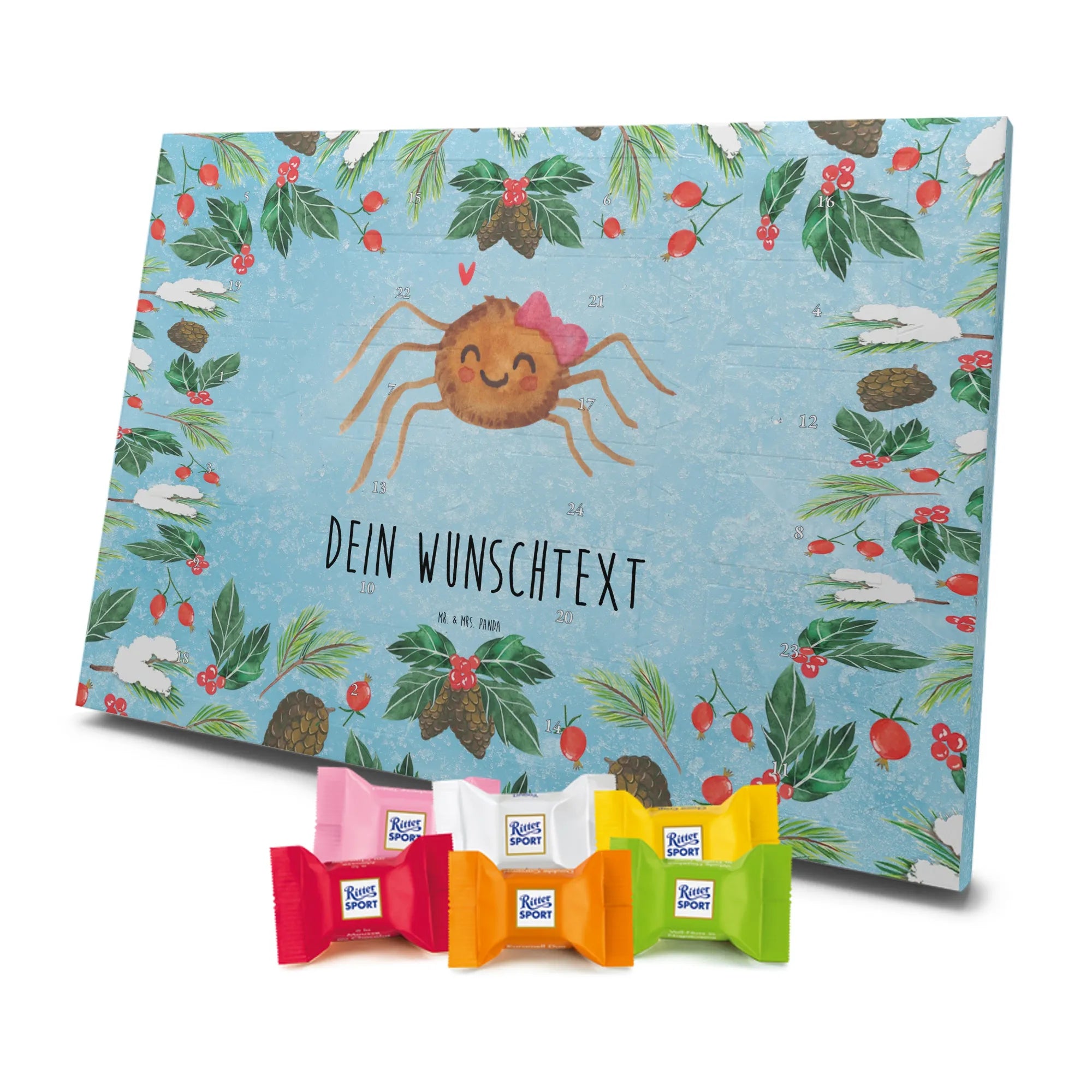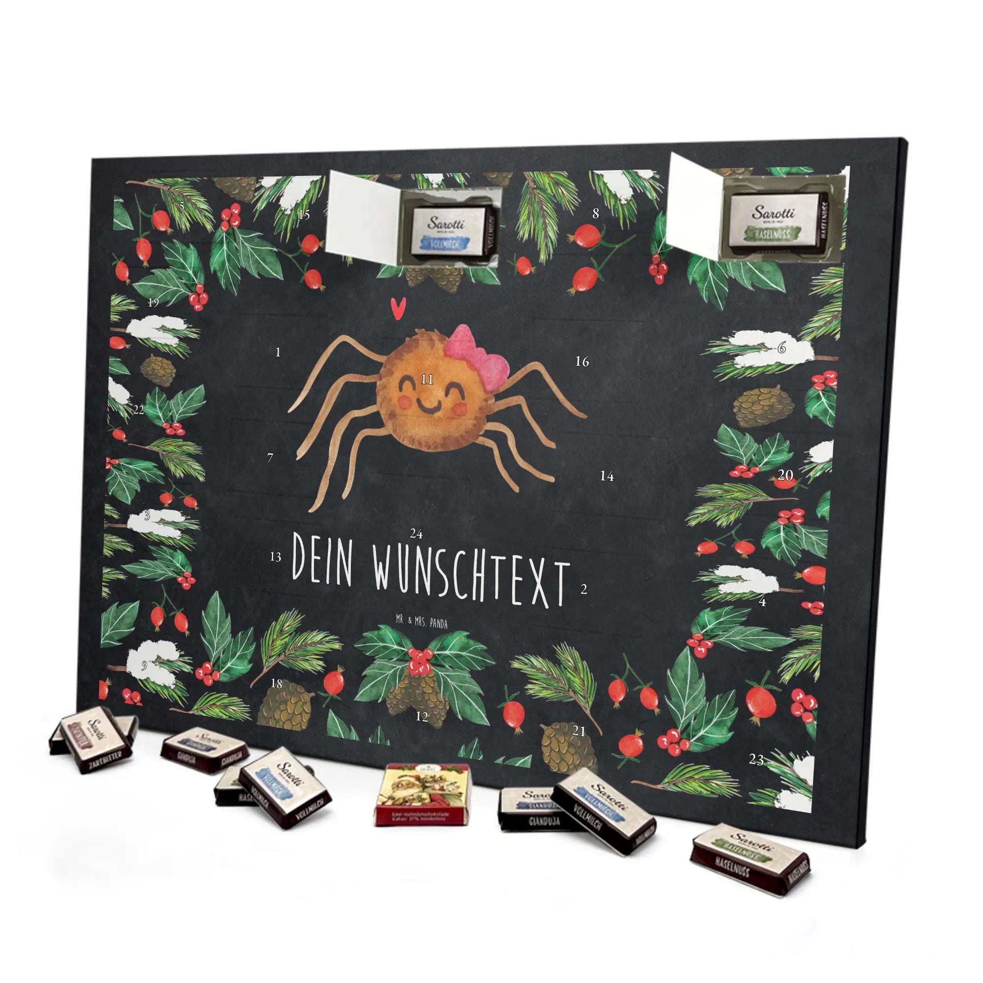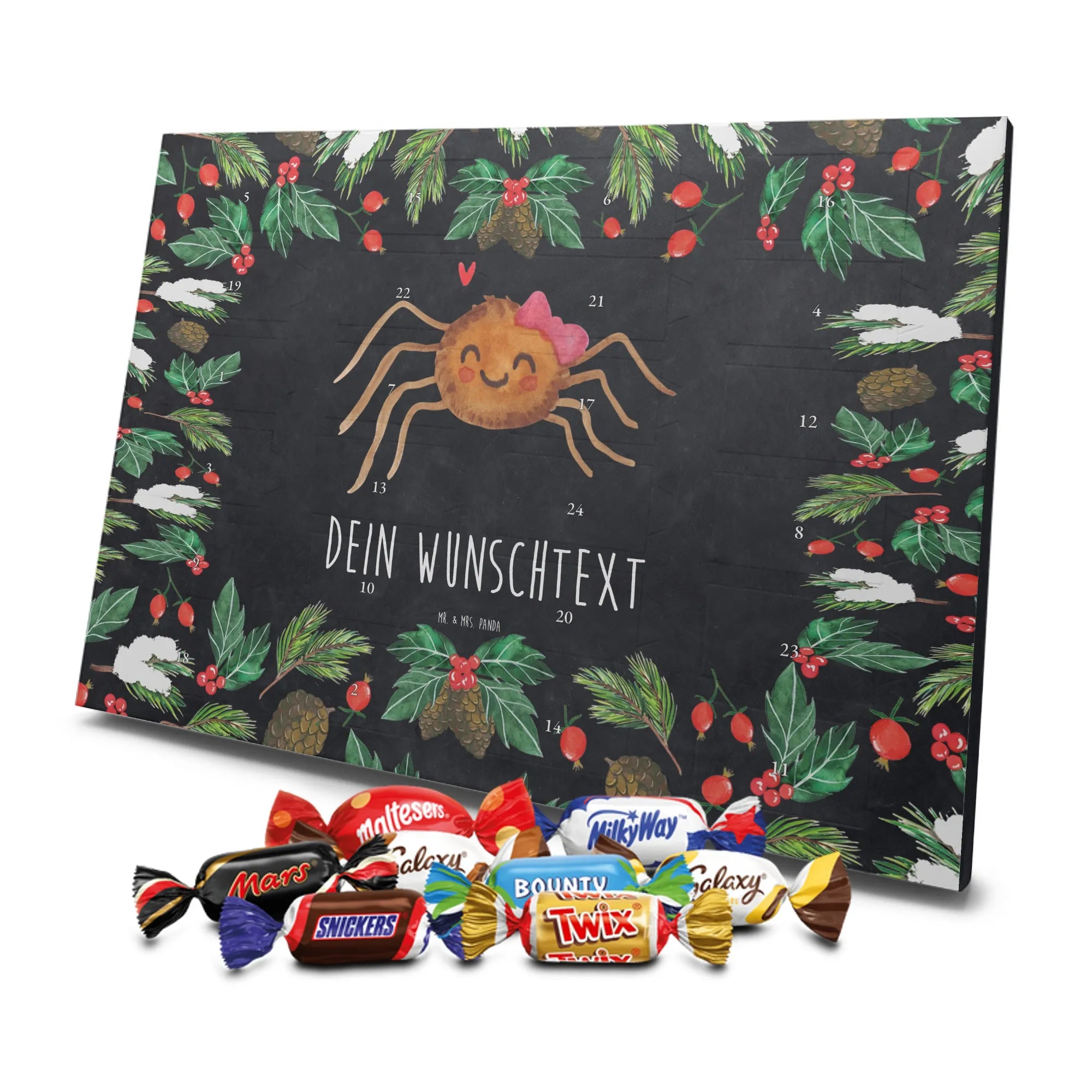 Make the Advent season even more special with the personalized chocolate Advent calendar from Mr. & Mrs. Panda. This unique Advent calendar is printed with your desired name or a custom text and features exclusive designs and sayings from the renowned designer duo. It's not only a visual highlight but also delights taste buds with 24 high-quality chocolate balls in various colors. The brilliant print quality and the silk-matte finish make this calendar a true eye-catcher during the Christmas season.