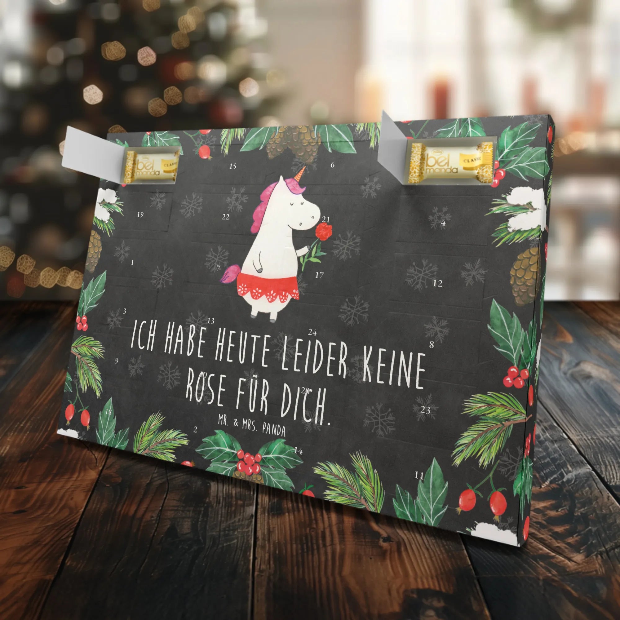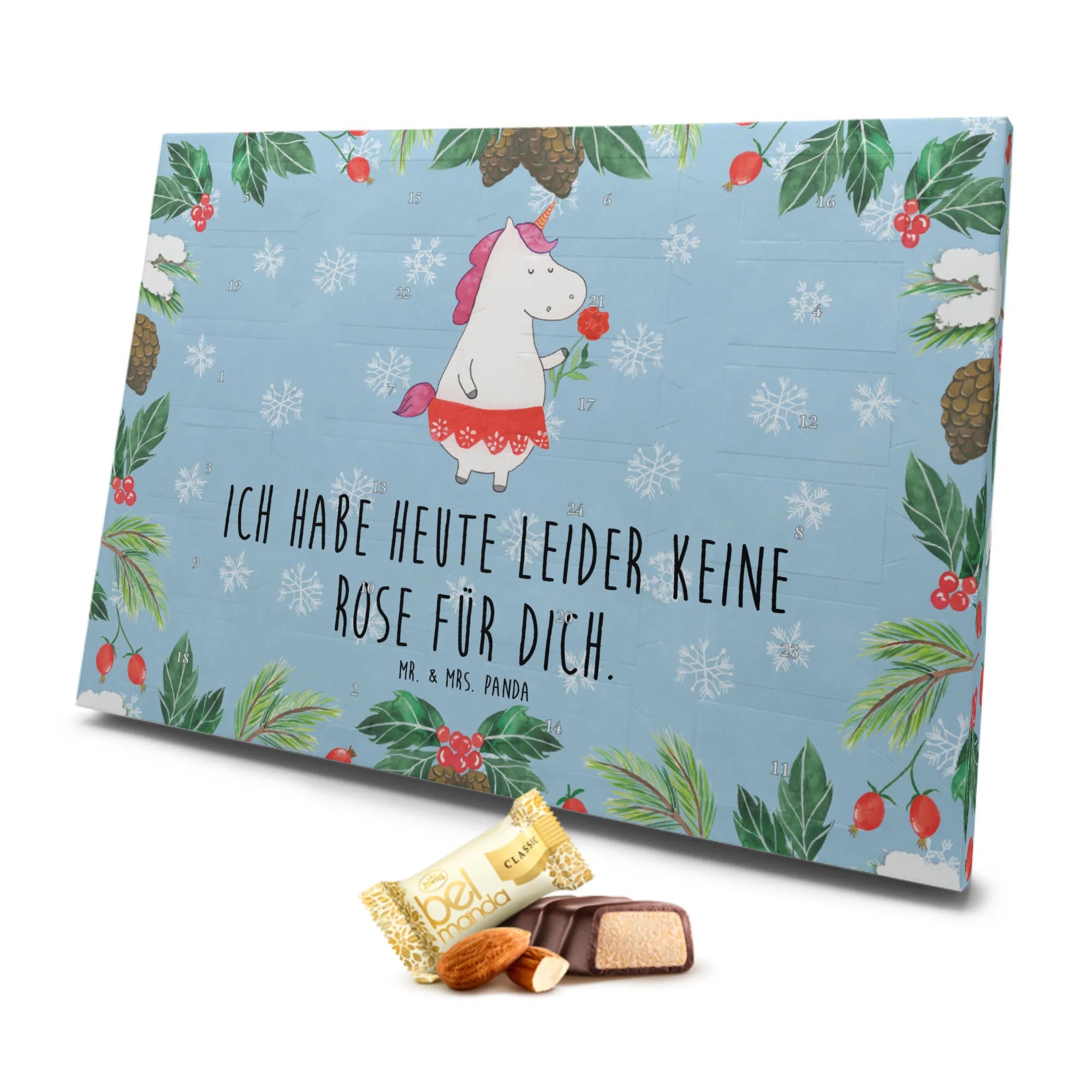Liebevoll handgezeichnet von Mrs. Panda, bringt das Einhorn mit dem Spruch "Ich habe heute leider keine Rose für dich" einen Hauch von Magie in den Advent.