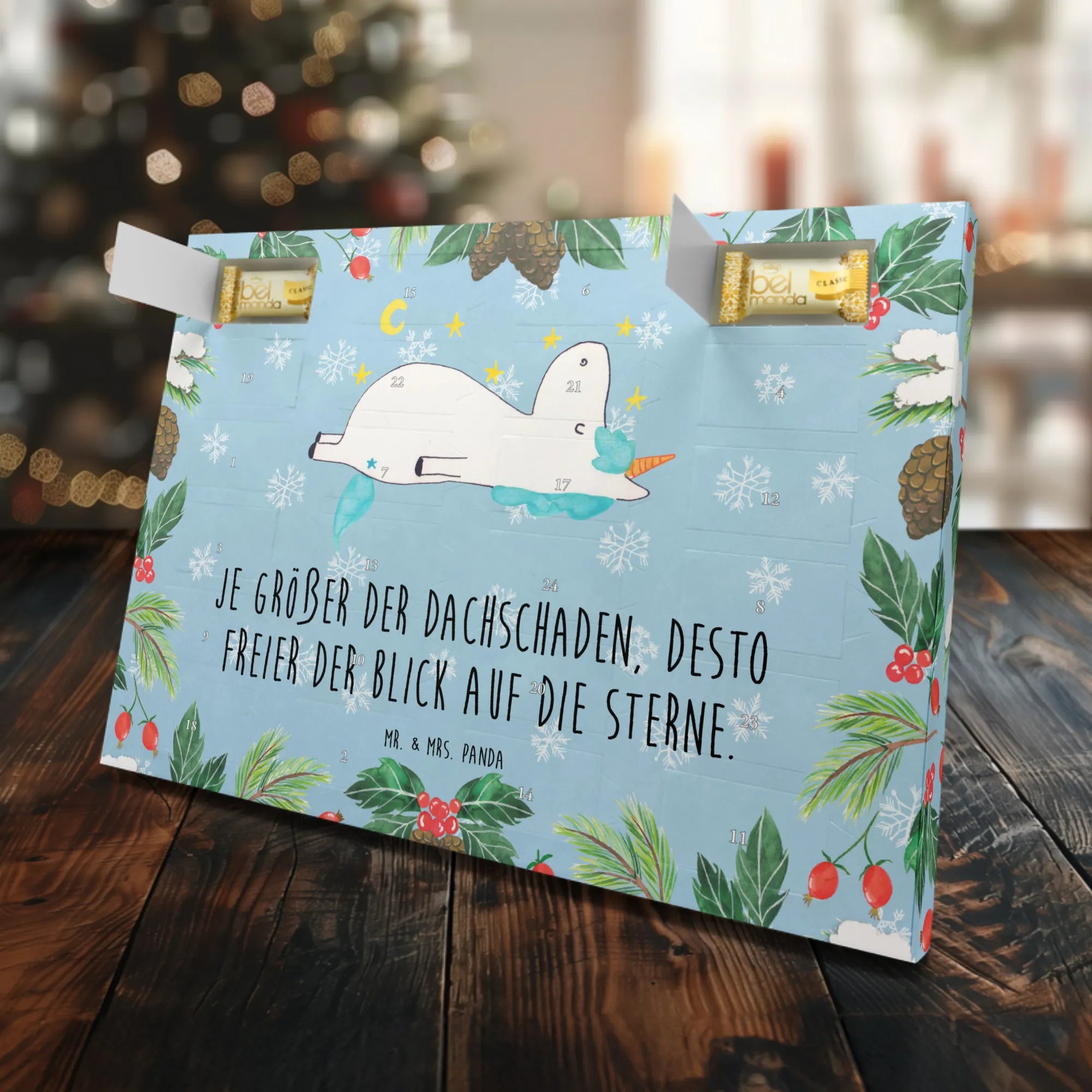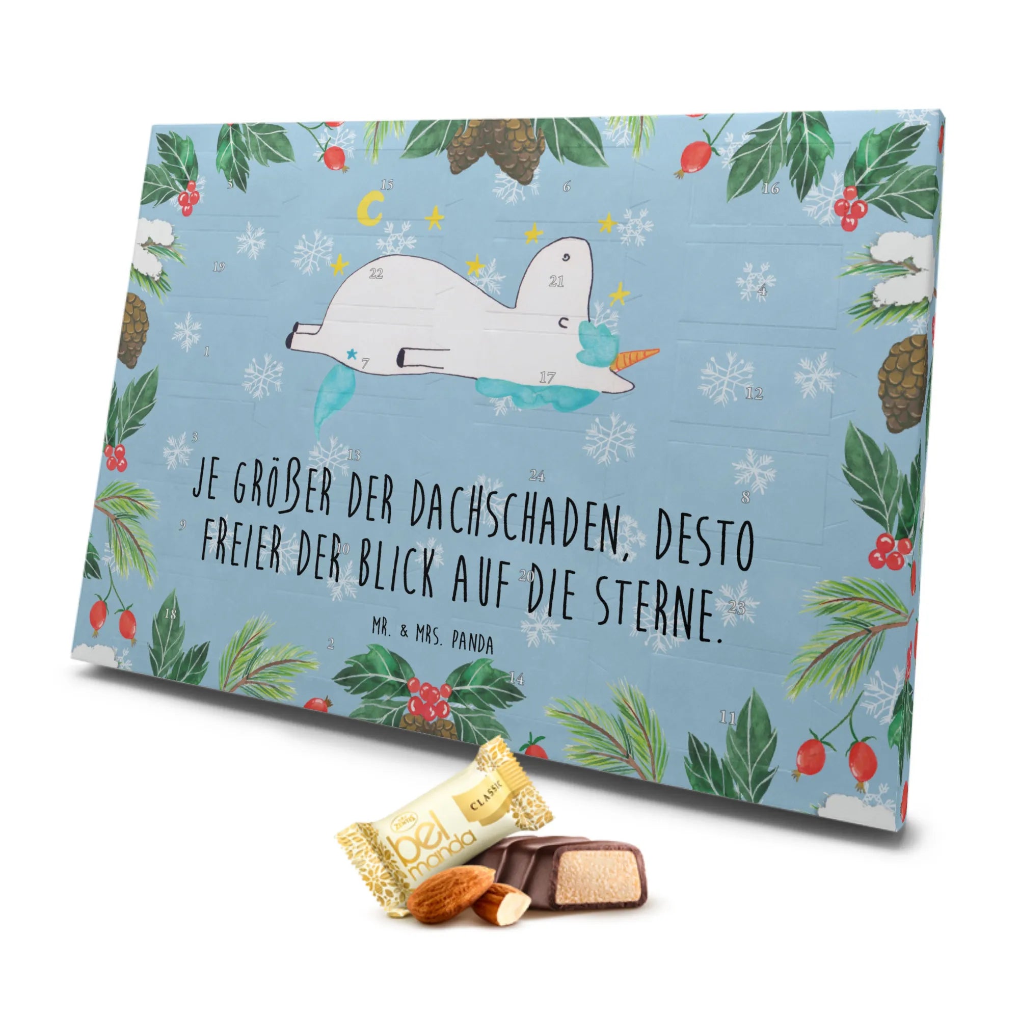Gefüllt mit 24 einzeln verpackten Edelmarzipan Pralinés sorgt er dafür, dass jeder Tag bis Weihnachten etwas ganz Besonderes wird. Jedes Türchen des Kalenders birgt ein geschmackvolles Marzipan-Praliné, das nicht nur lecker ist, sondern auch deine Vorfreude auf das Fest steigert. Das wunderschöne Design zeigt ein traumhaftes Einhorn, das verträumt den funkelnden Sternenhimmel beobachtet, und erinnert uns daran, dass wir ein wenig verrückt sein dürfen – denn: "Je größer der Dachschaden, desto freier der Blick auf die Sterne!"