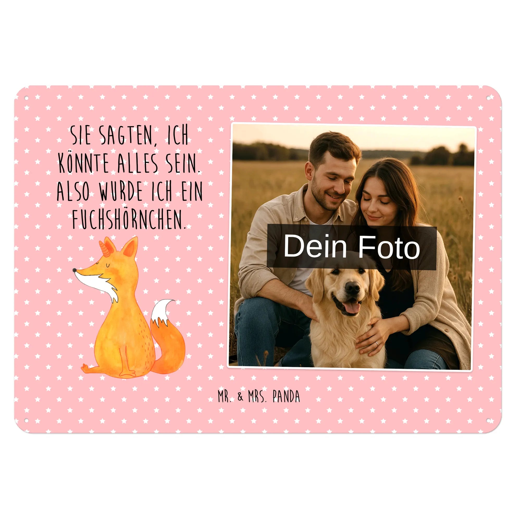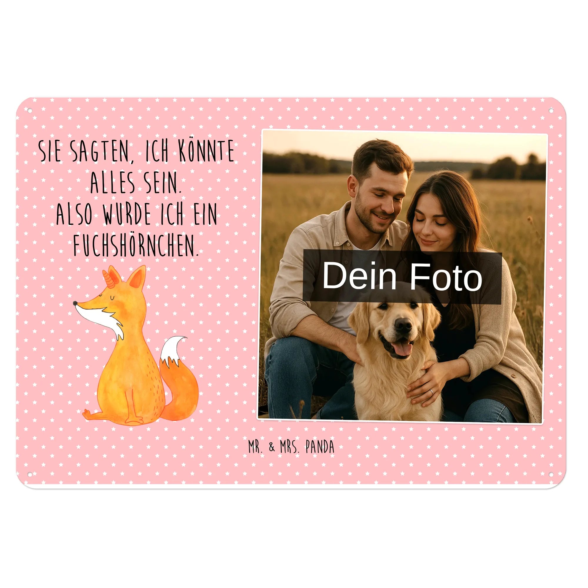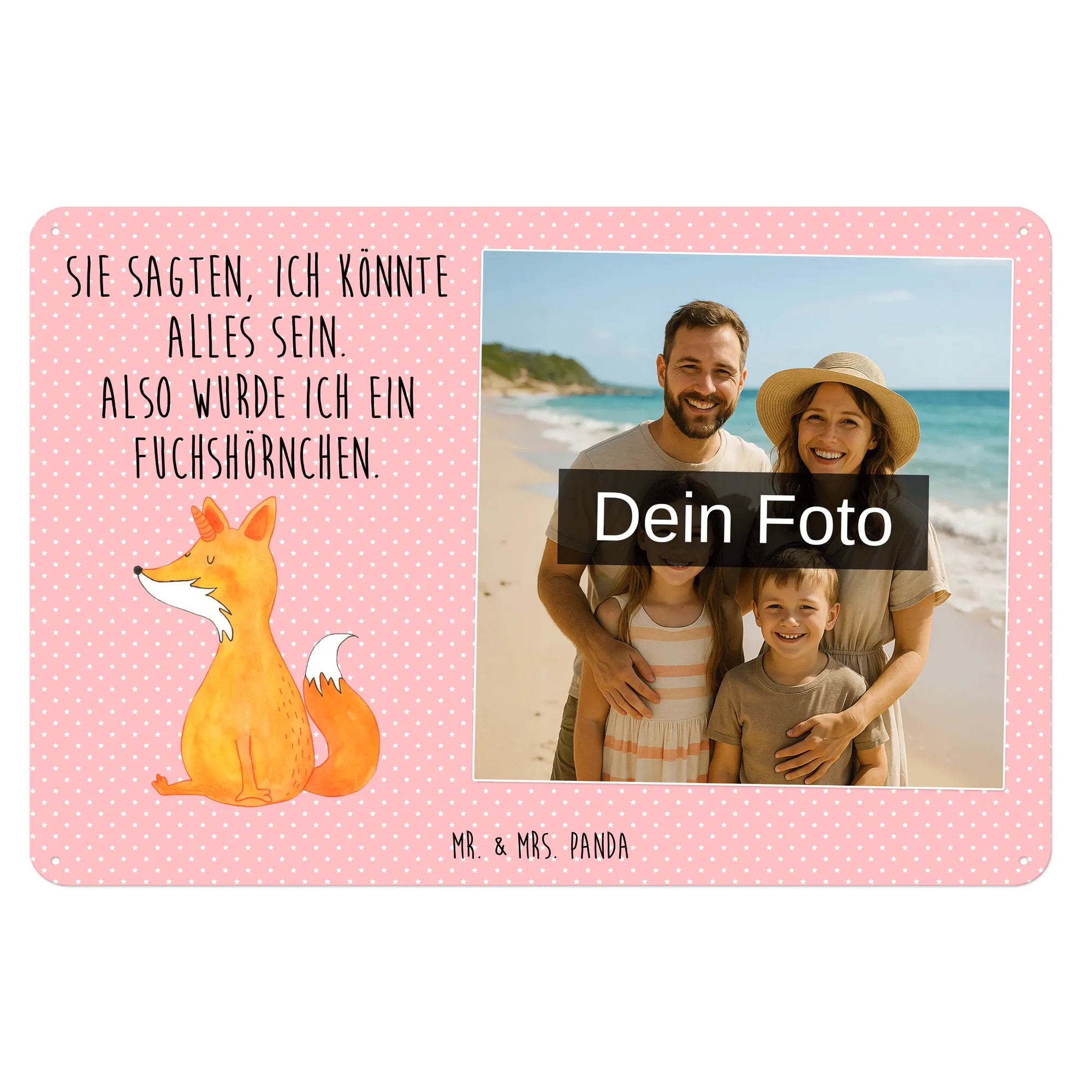 Blechschild mit eigenem Foto personalisiert – liebevoll gestaltet von Mr. & Mrs. Panda. Dieses edle Schild wird mit deinem Foto und unseren niedlichen Illustrationen bedruckt, sodass ein individuelles Dekostück entsteht. Achte unbedingt auf gute Bildqualität und geeigneten Bildausschnitt, damit das Motiv klar und harmonisch wirkt. Bitte nur eigene Bilder oder solche mit Nutzungsrecht hochladen. Gefertigt aus hochwertigem Stahlblech ohne Wölbung mit seidenmatter Oberfläche, bietet das Schild eine edle Optik. Maße: 70 mm x 297 mm x 210 mm. Der Druck ist langlebig und hochwertig verarbeitet. Für sicheren Halt gibt es vier Bohrungen, umgefalzte Kanten und abgerundete Ecken. Ideal für Innenräume, ob an der Tür, im Eingangsbereich oder an der Wohnzimmerwand. Pflegeleicht: einfach mit einem feuchten Tuch abwischen. In mehreren Größen erhältlich, so findest du garantiert die passende Variante. Verschenke Erinnerungen oder gestalte dein Zuhause persönlich — mit dem Blechschild mit eigenem Foto personalisiert von Mr. & Mrs. Panda wird jeder Raum ein Stückchen liebevoller.