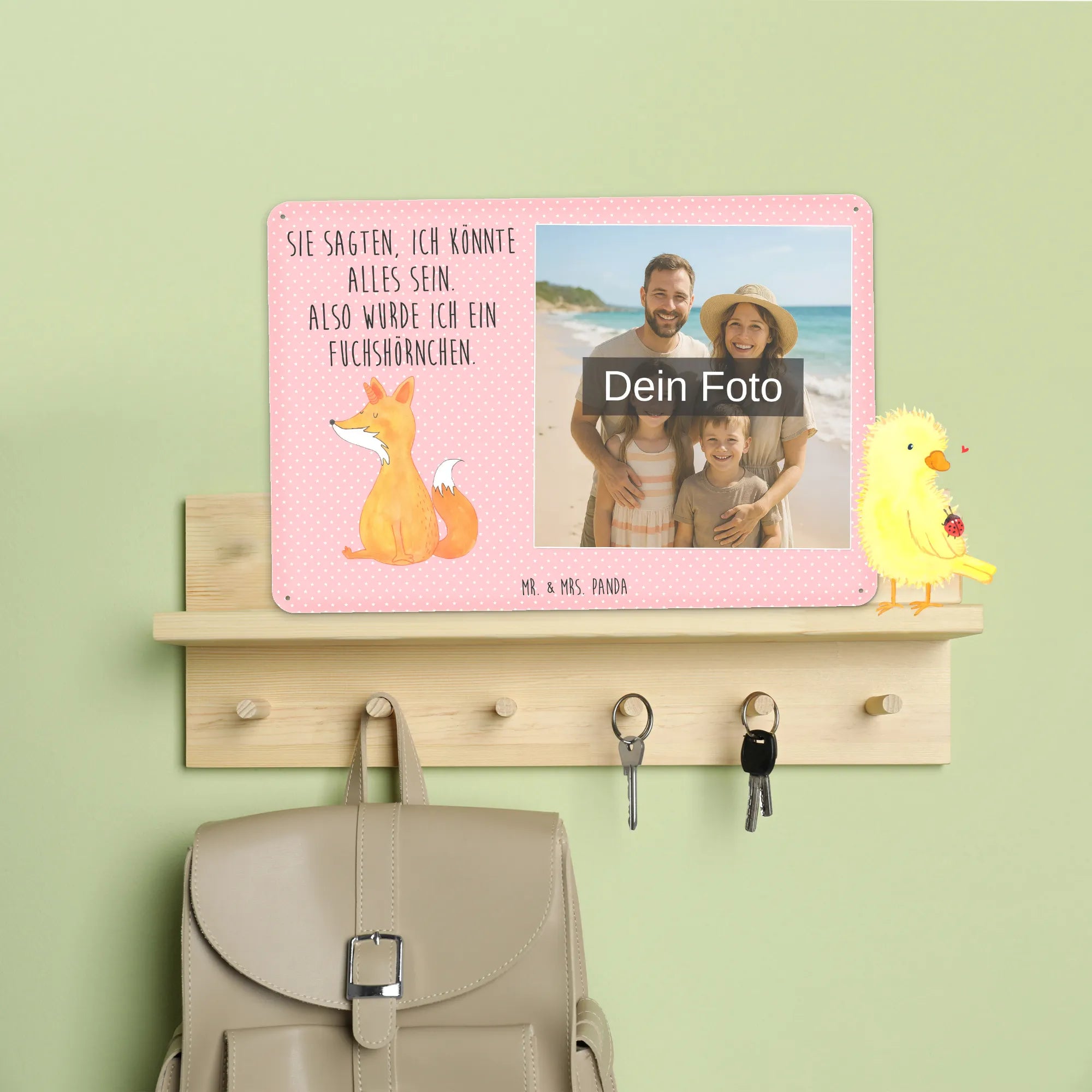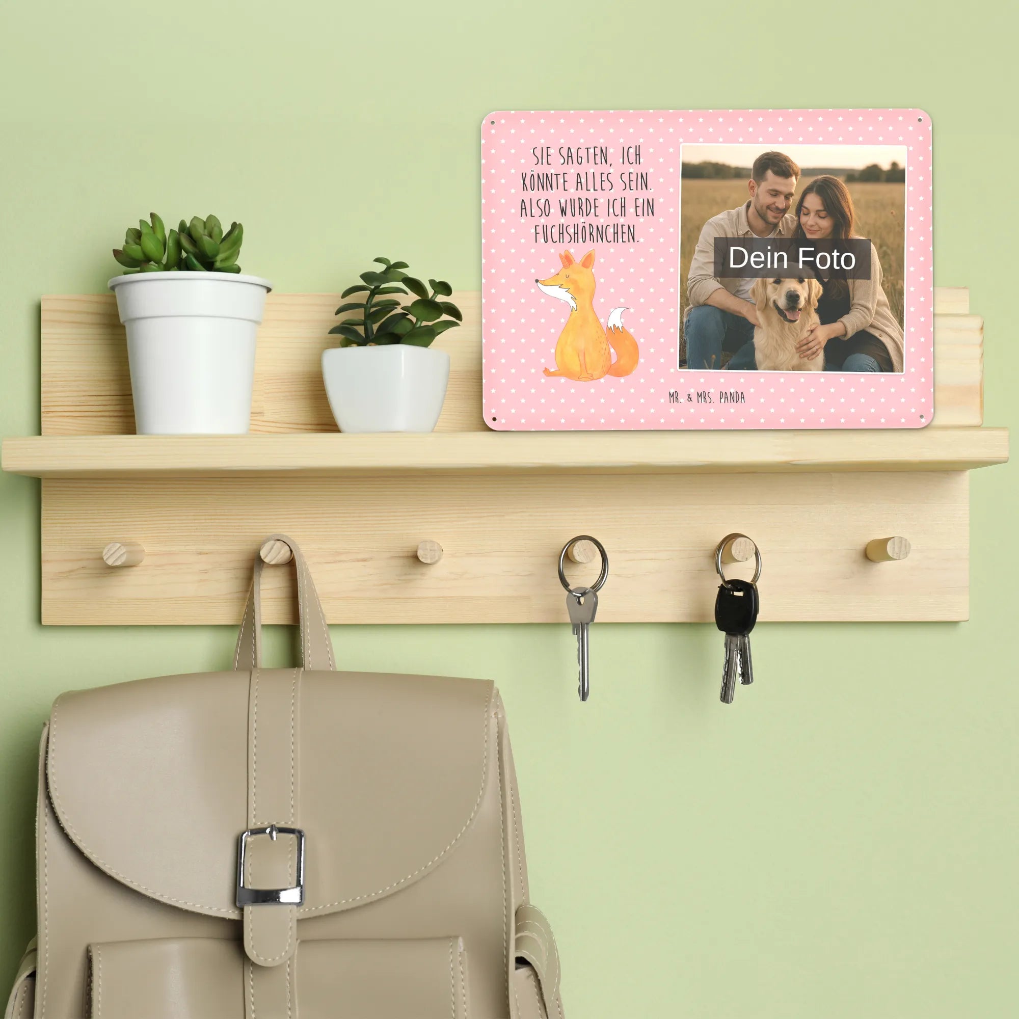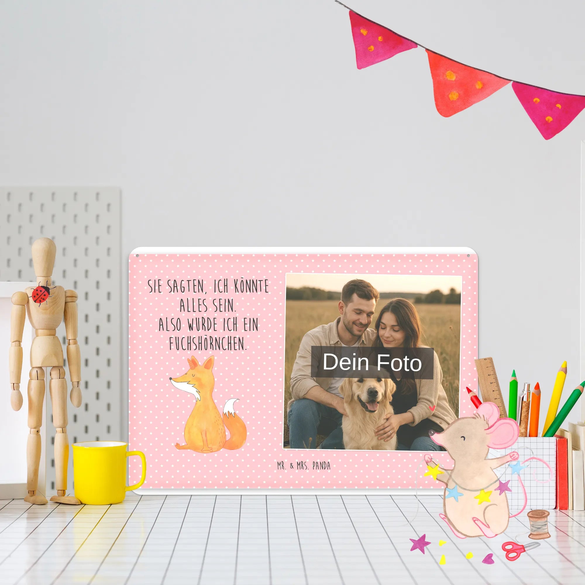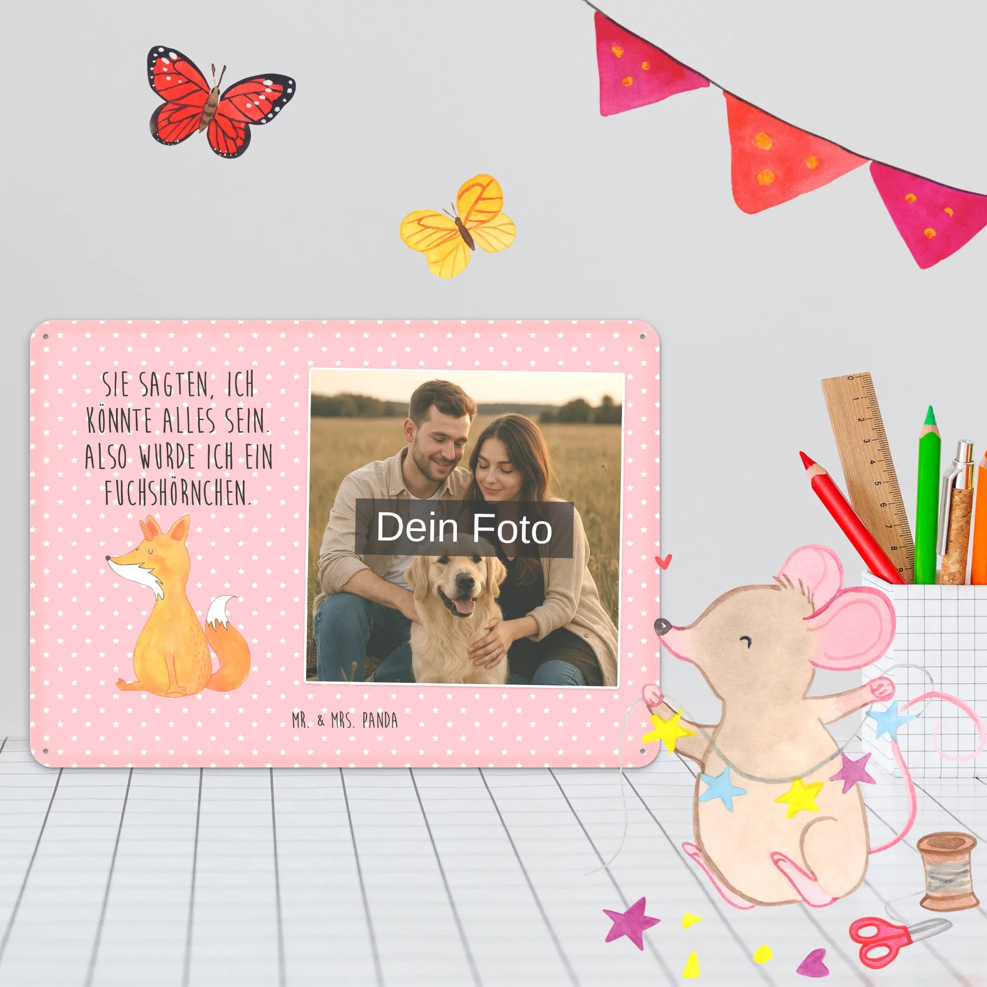 Blechschild mit eigenem Foto personalisiert – liebevoll gestaltet von Mr. & Mrs. Panda. Dieses edle Schild wird mit deinem Foto und unseren niedlichen Illustrationen bedruckt, sodass ein individuelles Dekostück entsteht. Achte unbedingt auf gute Bildqualität und geeigneten Bildausschnitt, damit das Motiv klar und harmonisch wirkt. Bitte nur eigene Bilder oder solche mit Nutzungsrecht hochladen. Gefertigt aus hochwertigem Stahlblech ohne Wölbung mit seidenmatter Oberfläche, bietet das Schild eine edle Optik. Maße: 70 mm x 297 mm x 210 mm. Der Druck ist langlebig und hochwertig verarbeitet. Für sicheren Halt gibt es vier Bohrungen, umgefalzte Kanten und abgerundete Ecken. Ideal für Innenräume, ob an der Tür, im Eingangsbereich oder an der Wohnzimmerwand. Pflegeleicht: einfach mit einem feuchten Tuch abwischen. In mehreren Größen erhältlich, so findest du garantiert die passende Variante. Verschenke Erinnerungen oder gestalte dein Zuhause persönlich — mit dem Blechschild mit eigenem Foto personalisiert von Mr. & Mrs. Panda wird jeder Raum ein Stückchen liebevoller.