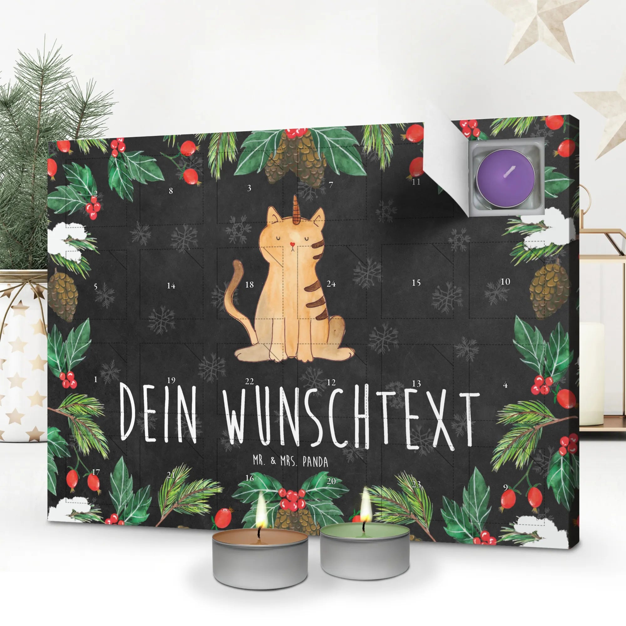 Discover the magic of the pre-Christmas season with our 'Personalized Scented Candle Advent Calendar' from Mr. & Mrs. Panda. Enchantingly adorned with beautiful quotes and motifs, this unique Advent calendar can be personalized with a message or name of your choice. Be captivated by Mrs. Panda's charming drawings on the front and a new festive scent behind every door, including vanilla, lavender, and apple-cinnamon. A sturdy box that can be hung up or displayed completes the experience.