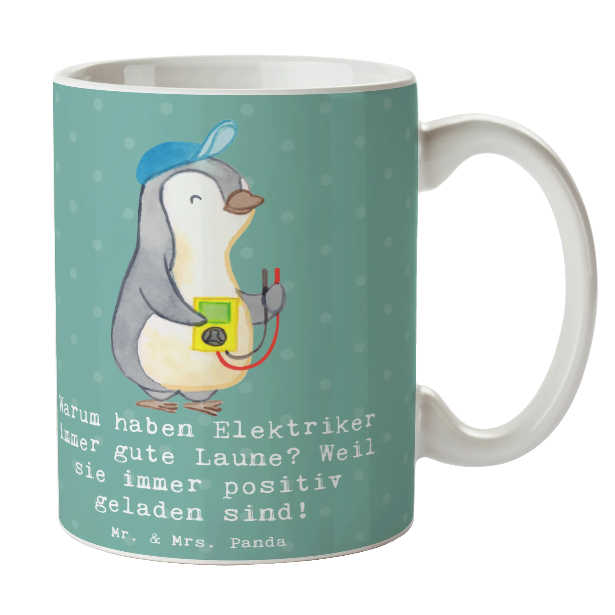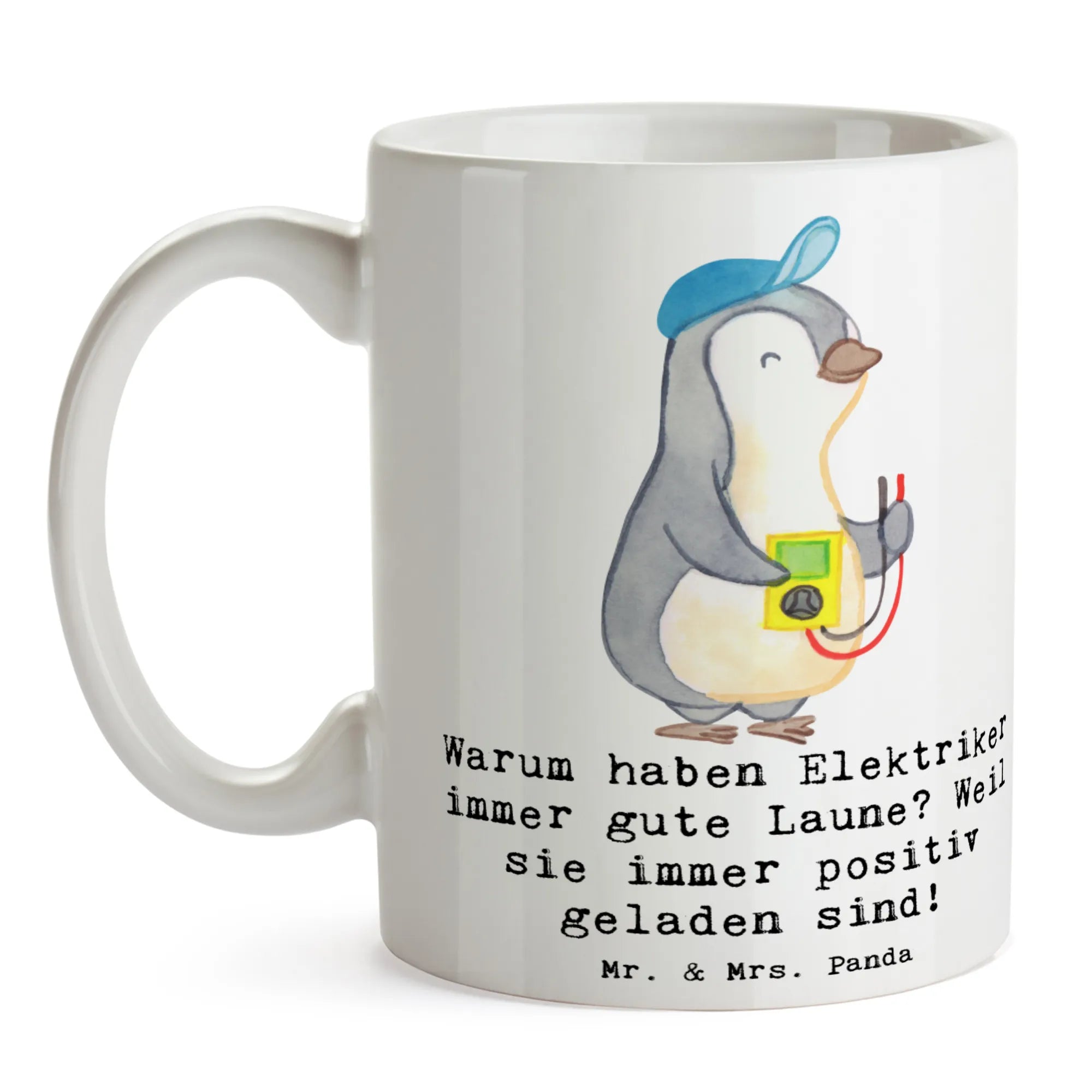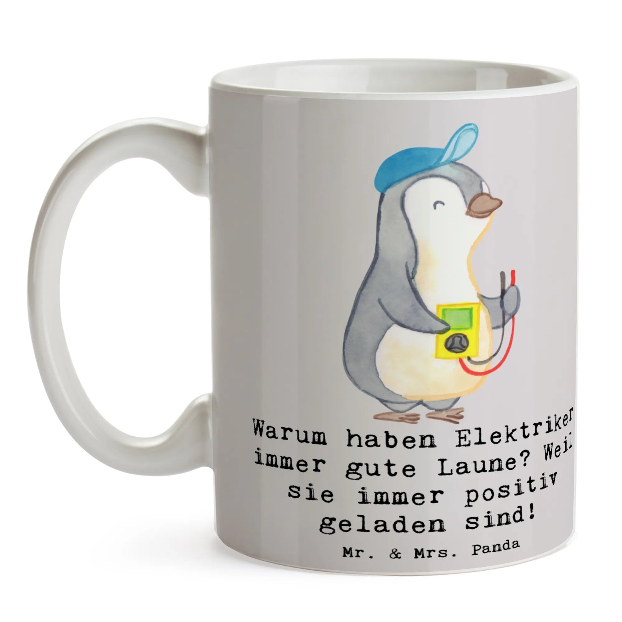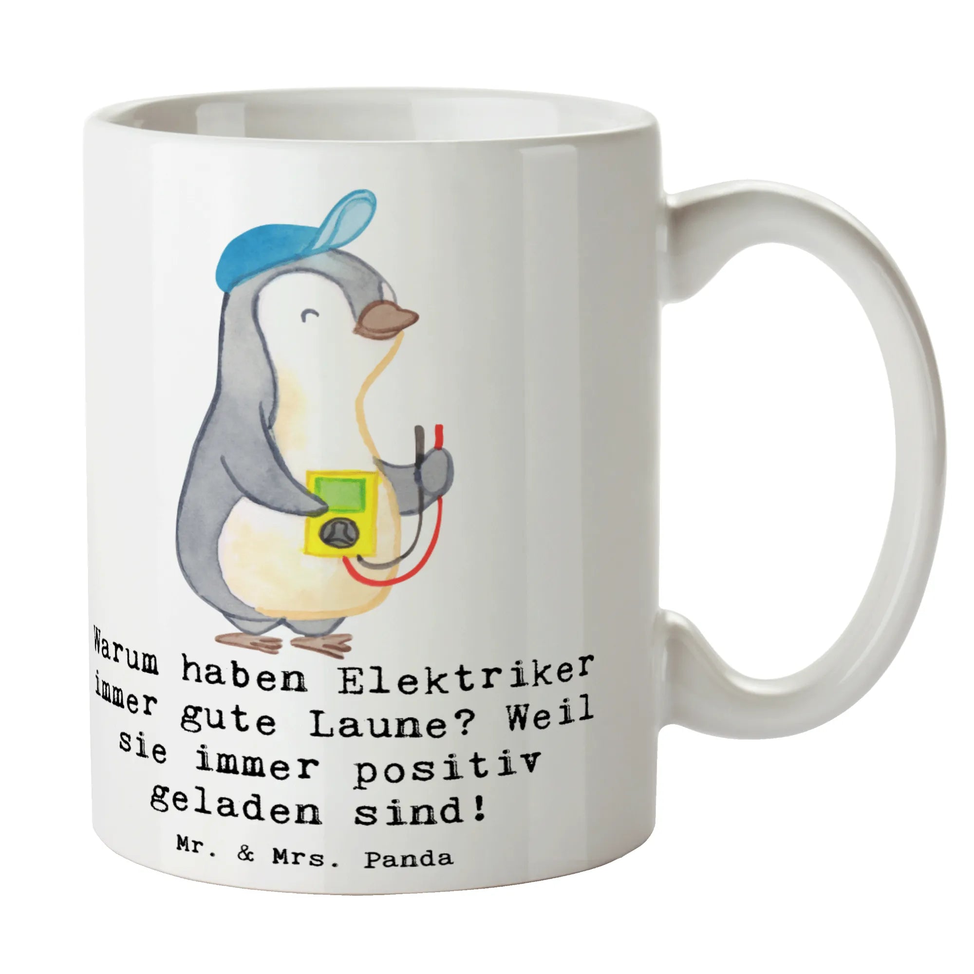 Suchst Du ein Geschenk mit Humor und Herz? Unsere Mr. & Mrs. Panda Tasse Elektriker aus der Berufe-Kollektion ist genau dafür gemacht. Mit dem witzigen Spruch „Warum haben Elektriker immer gute Laune? Weil sie immer positiv geladen sind!“ bringt diese Tasse jeden Morgen ein Lächeln auf das Gesicht von Elektrikern, Azubis, Meistern oder Freunden aus dem Handwerk.