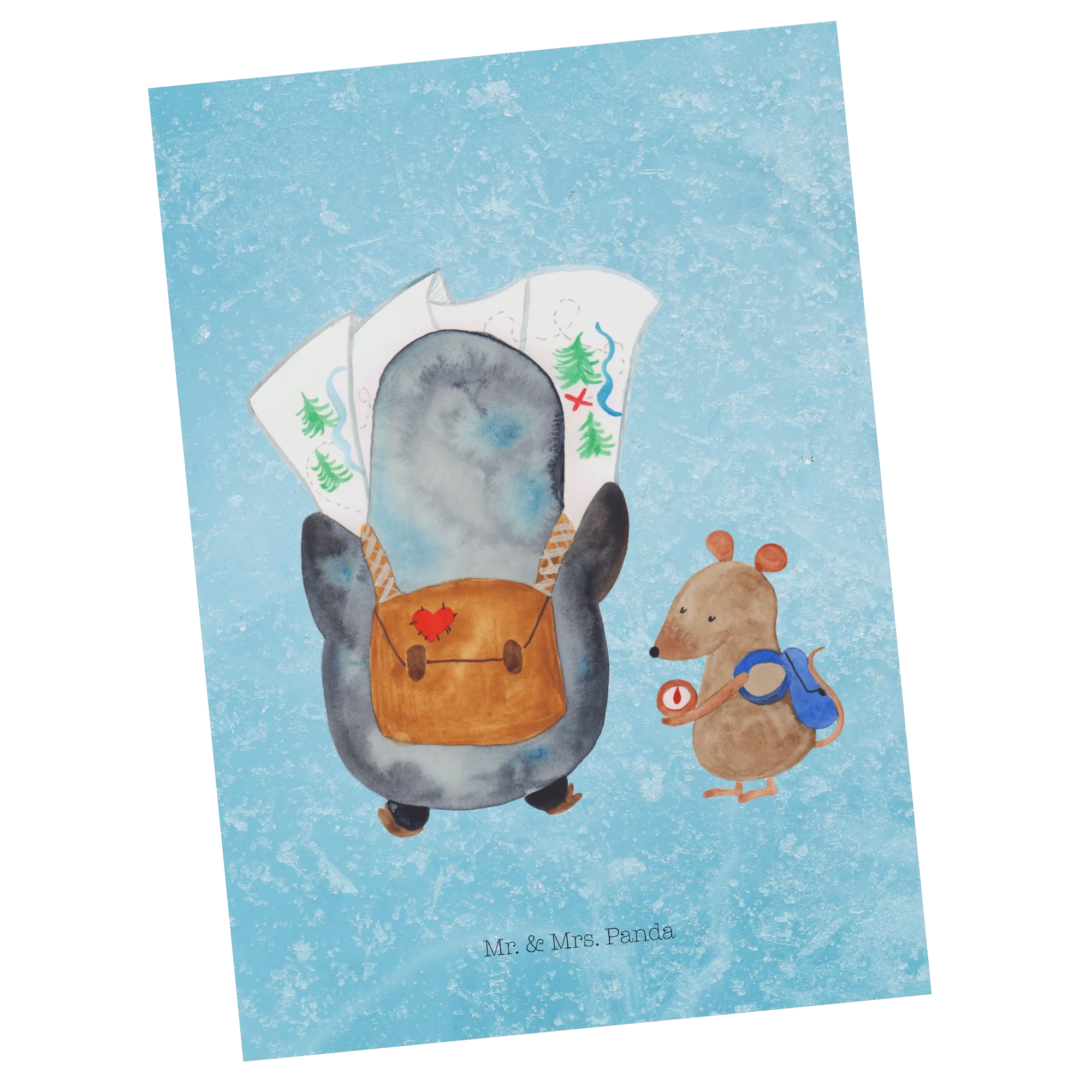 Postcard Penguin & Mouse Hiker - with saying - Ice Blue
