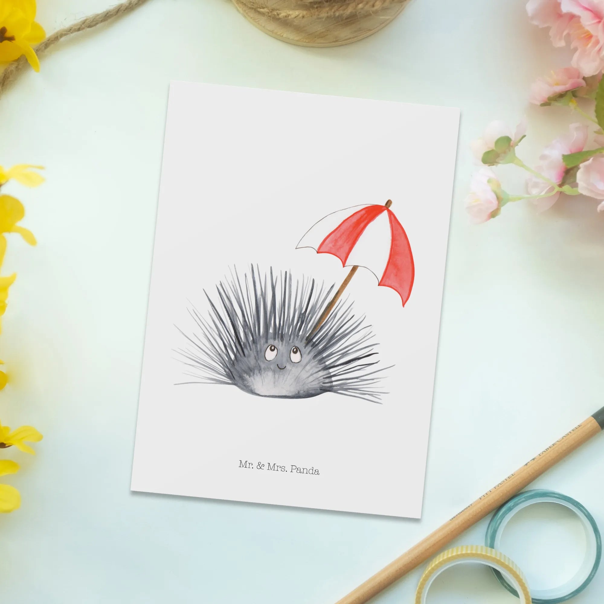 This beautifully designed postcard features a charming sea urchin with big, friendly eyes and a gentle smile, radiating joy and positivity. Its whimsical design, complete with a cute striped umbrella, makes it an eye-catching piece suitable for various occasions.