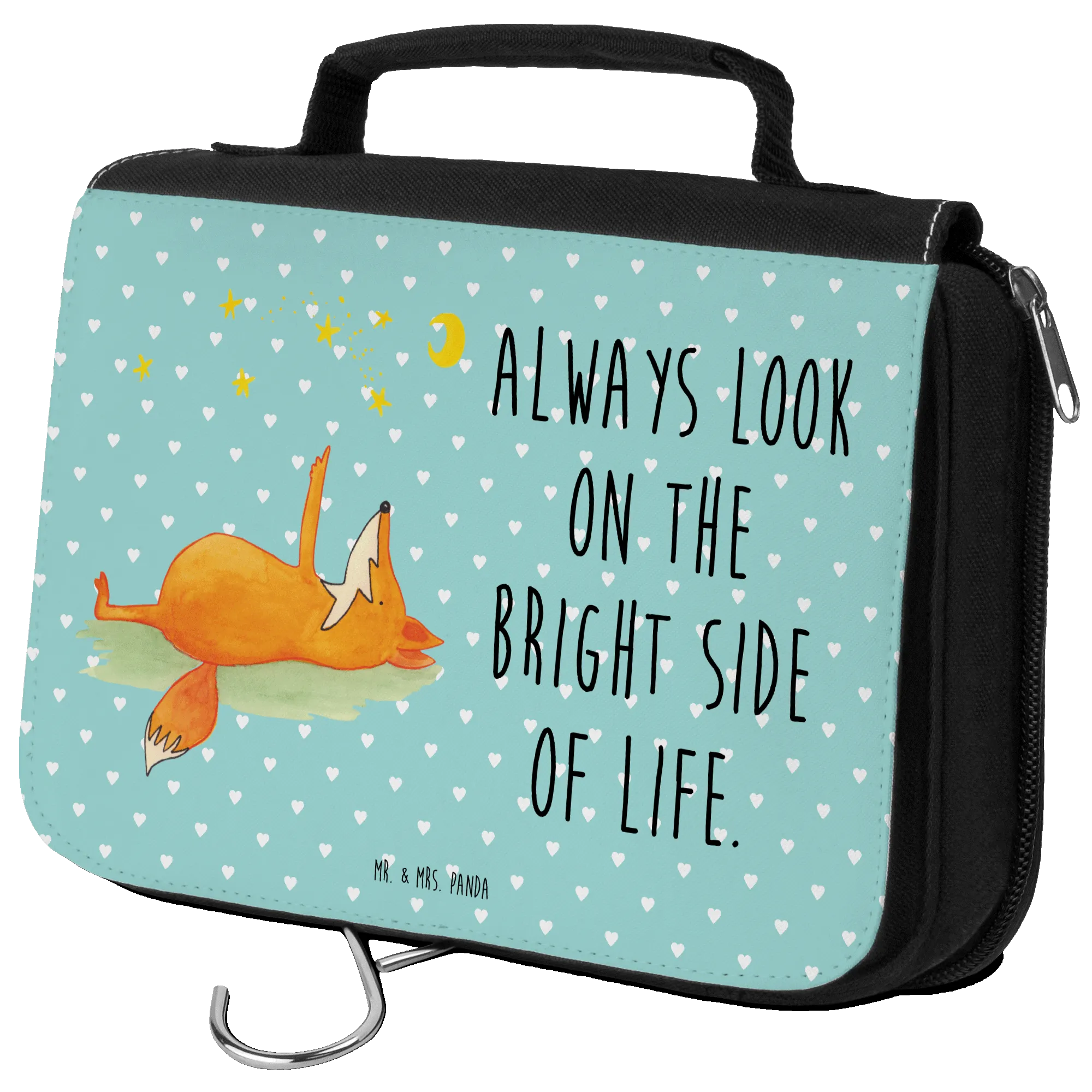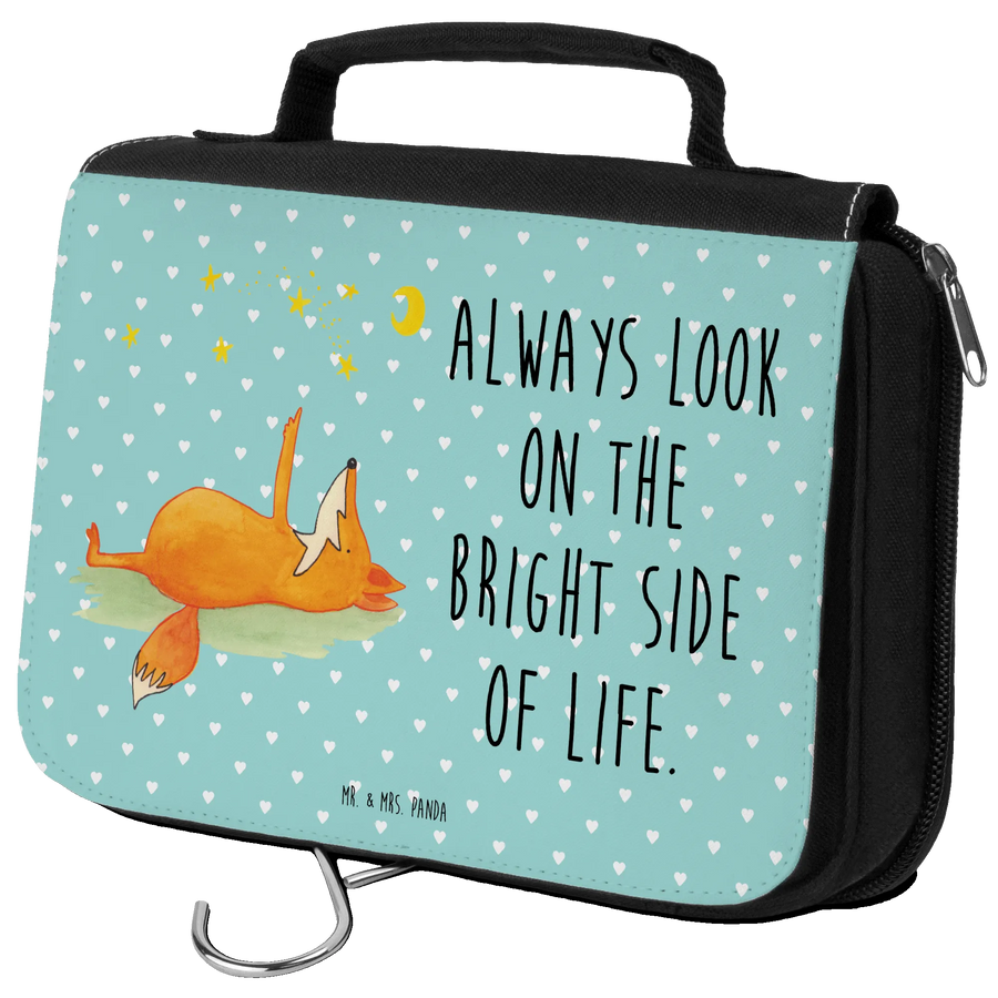 The enchanting motif of a fox gazing up at a twinkling starry sky is not just visually appealing; it's a reminder to “Always look on the bright side of life.” Hand-drawn by the talented Mrs. Panda, this illustration is part of her beloved Fox Collection, which celebrates the clever and social nature of these furry friends. The soft aqua background perfectly complements the whimsical design, making this wash bag a joy to behold.