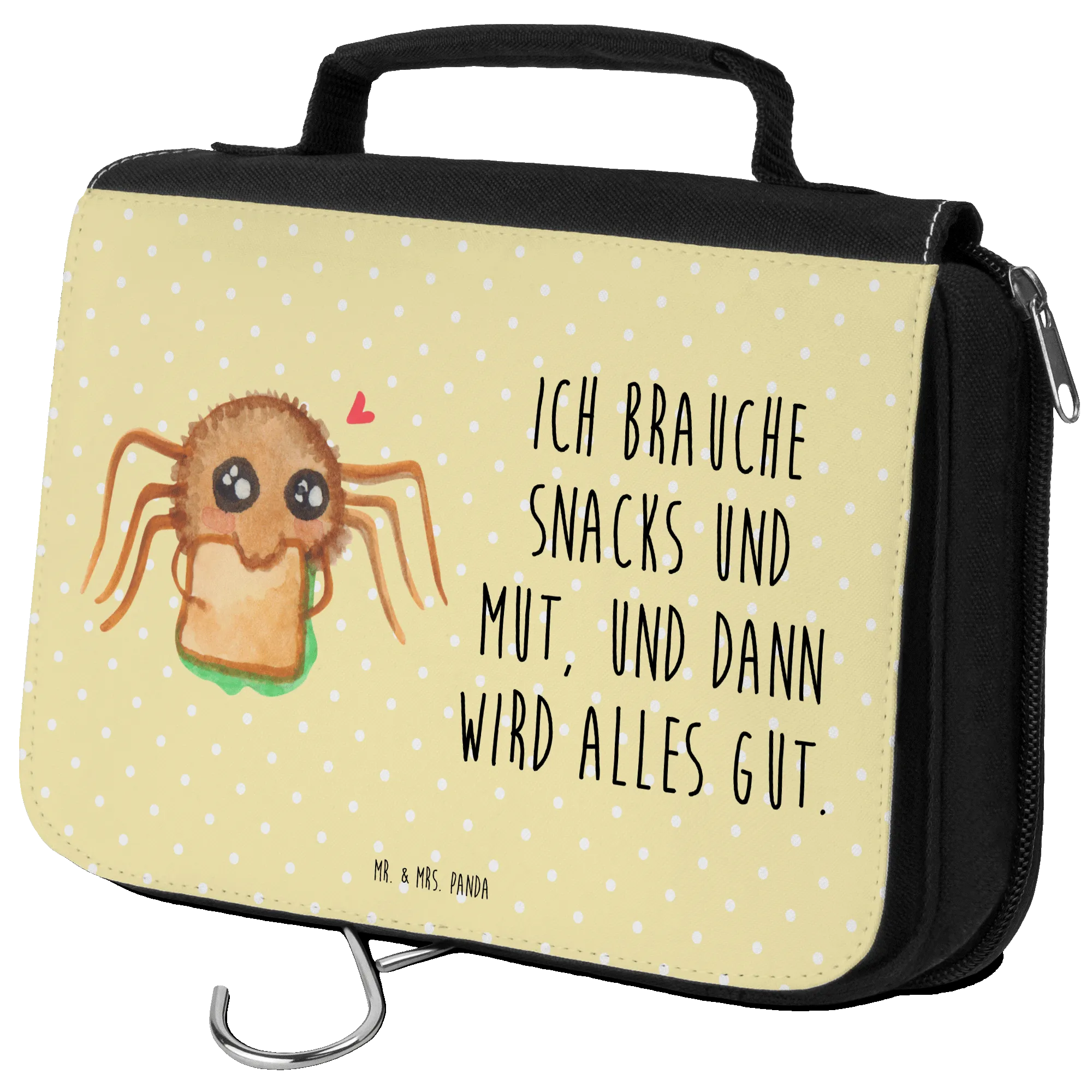 What makes this wash bag so special? The Spider Agathe design, lovingly hand-drawn by Mrs. Panda, showcases Agathe in her playful spirit. Looking at her happily munching on a sandwich will surely bring a smile to your face, no matter how your day is going! The slogan "I need snacks and courage, and then everything will be fine" captured alongside Agathe makes this bag not only functional but also a source of daily inspiration. The warm pastel yellow background matched with the charming illustration creates a cheerful vibe, ensuring that this wash bag stands out in any luggage.