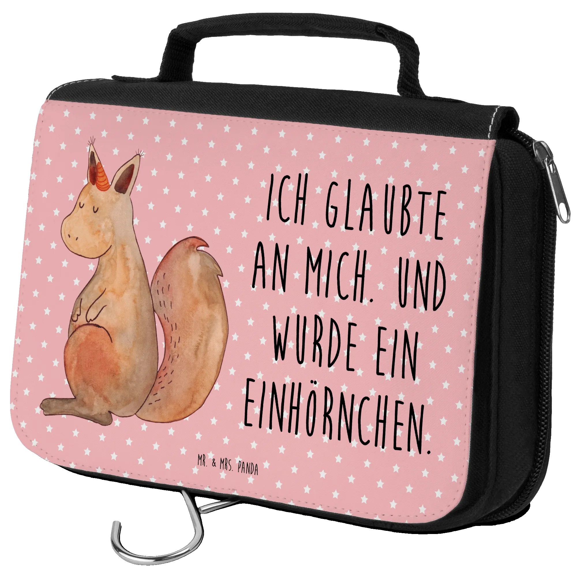 Be unique! The Squirrel Faith wash bag doesn’t just appeal to children or teens; it’s also an excellent present for adults who appreciate the vibrant energy of unicorn-themed items. The positive slogan, 'Ich glaubte an mich. Und wurde ein Einhörnchen.' (I believed in myself and became a unicorn), is a lovely reminder for anyone using this bag—no matter their age.