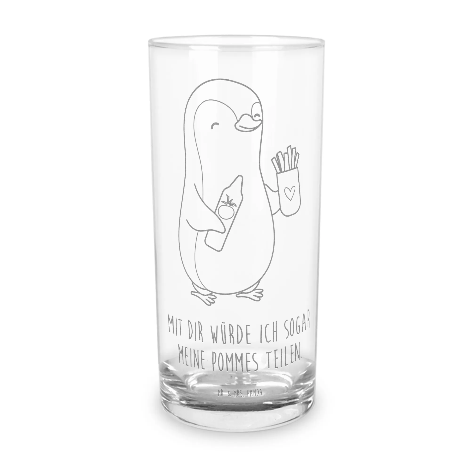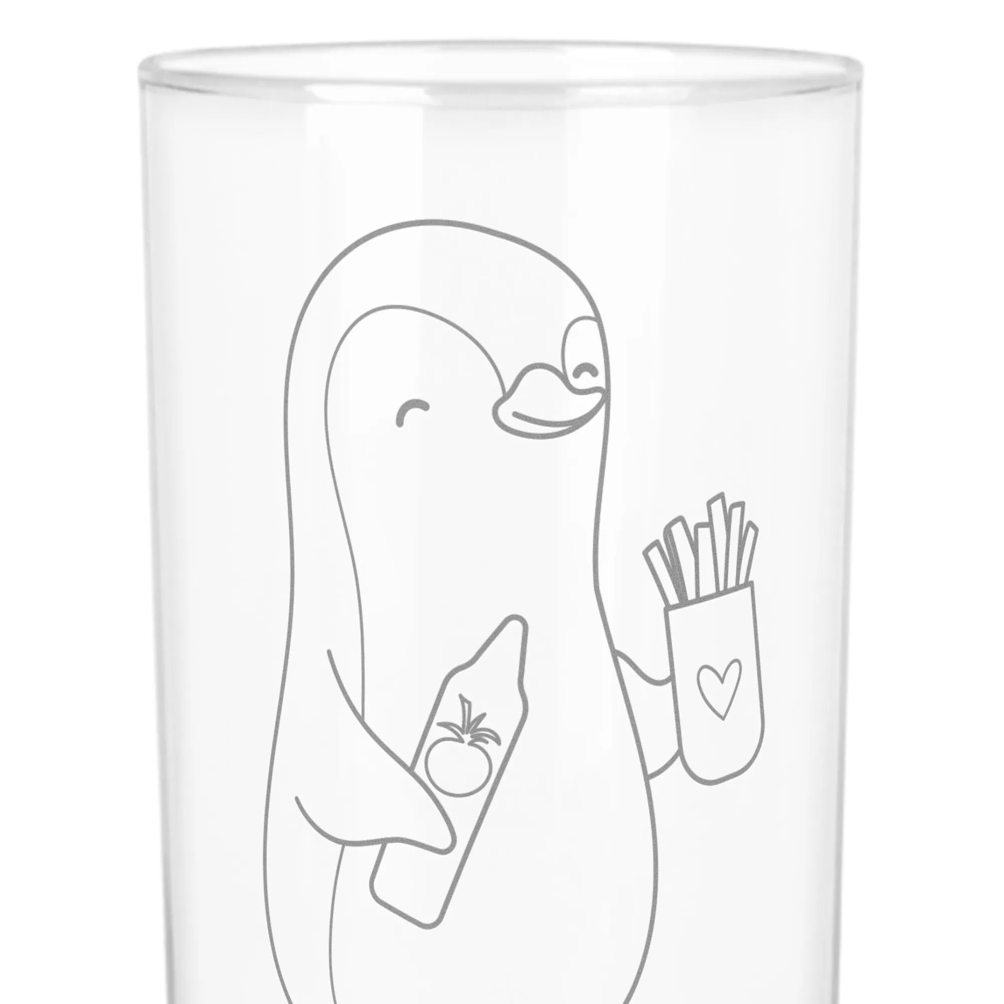 Featuring a quirky, cheerful penguin joyfully holding a red ketchup bottle and a container of fries, this glass is not just fun; it’s tremendously heartwarming! Imagine the smile on your partner's face as they sip their favorite drink from this adorable piece that says 'With you, I’d even share my fries!'