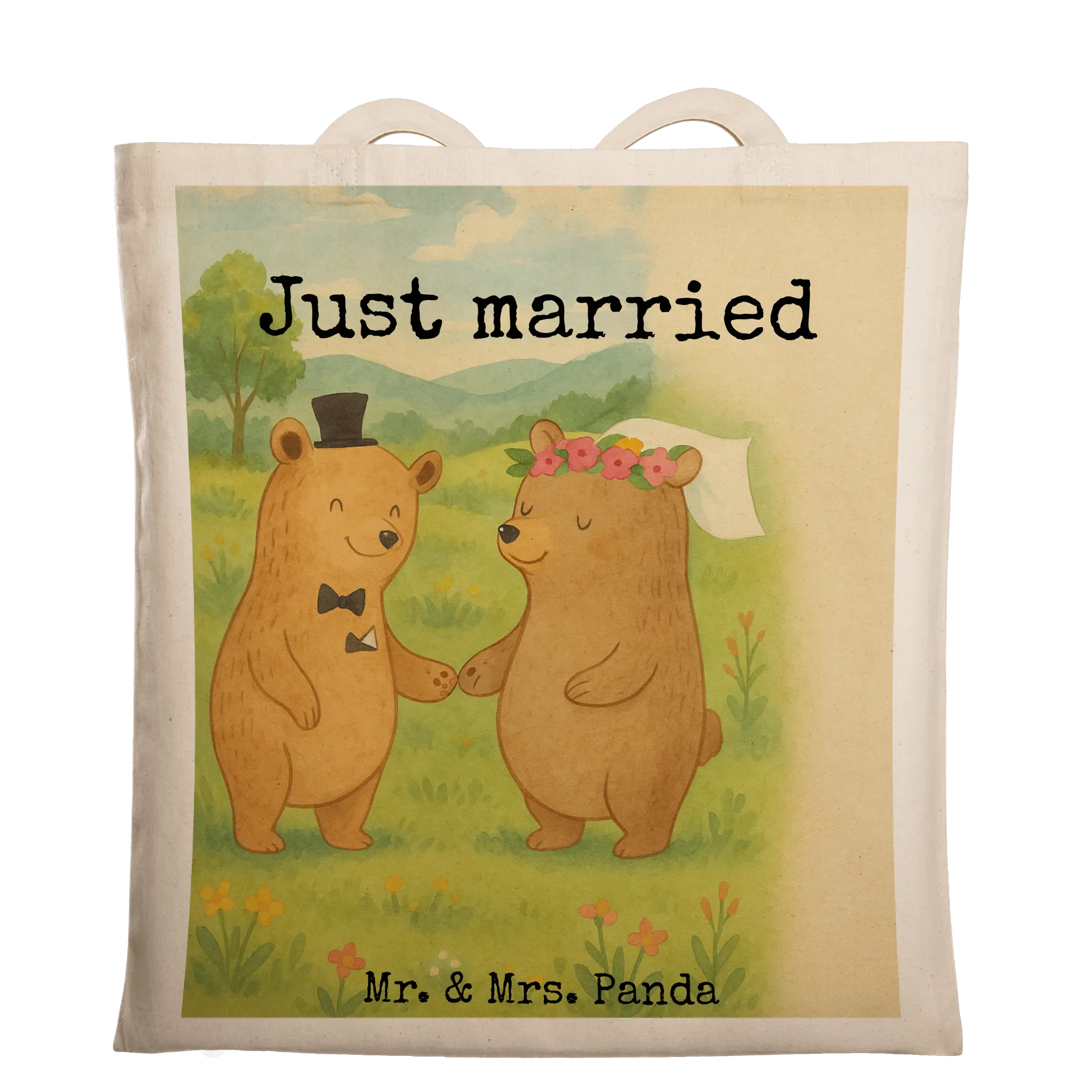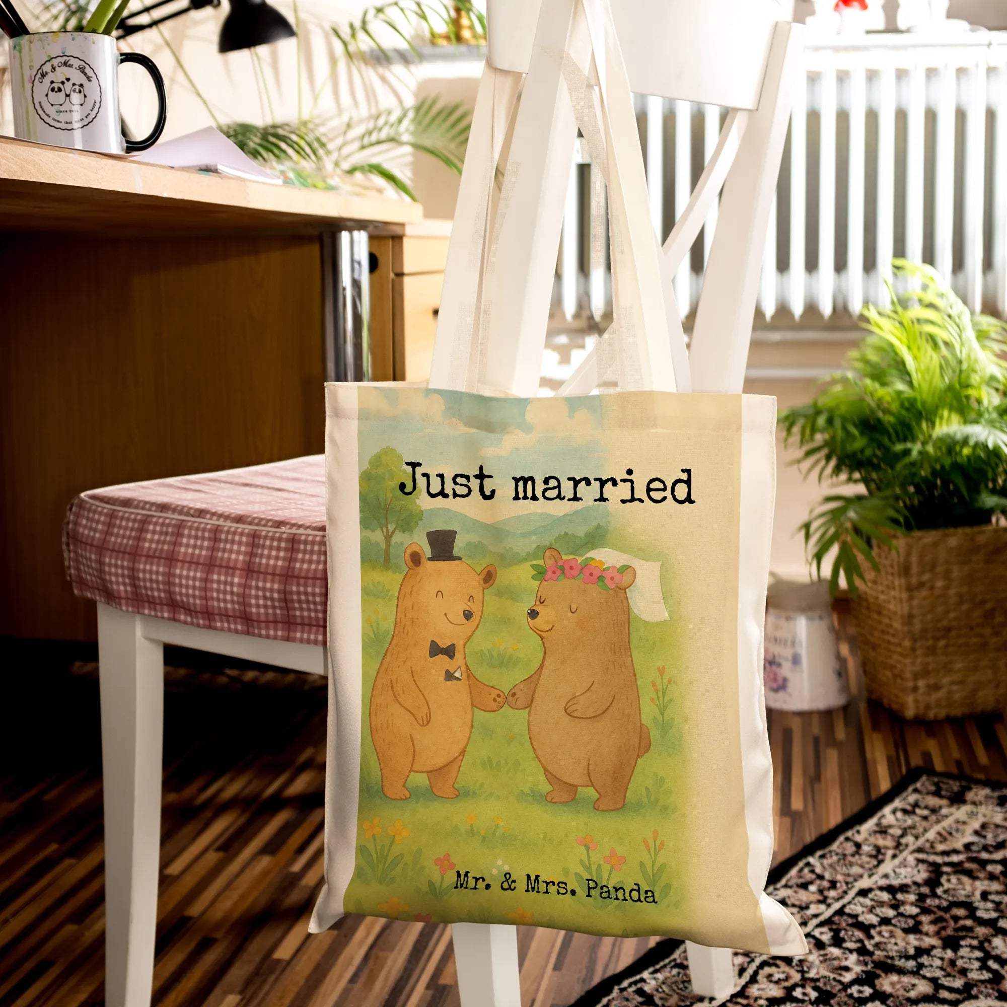 Introducing our delightful bear couple, elegantly dressed for their wedding day! The groom, in his charming hat and bow tie, stands proud next to his lovely bride, who adorns a floral crown and a flowing veil. This watercolor motif beautifully captures the essence of wedding celebrations, making it the ideal gift for newlyweds or as a loving reminder of your own special day. The slogan 'Just married' resonates with the sweet simplicity of love, embodying the joy of starting a new chapter in life together.