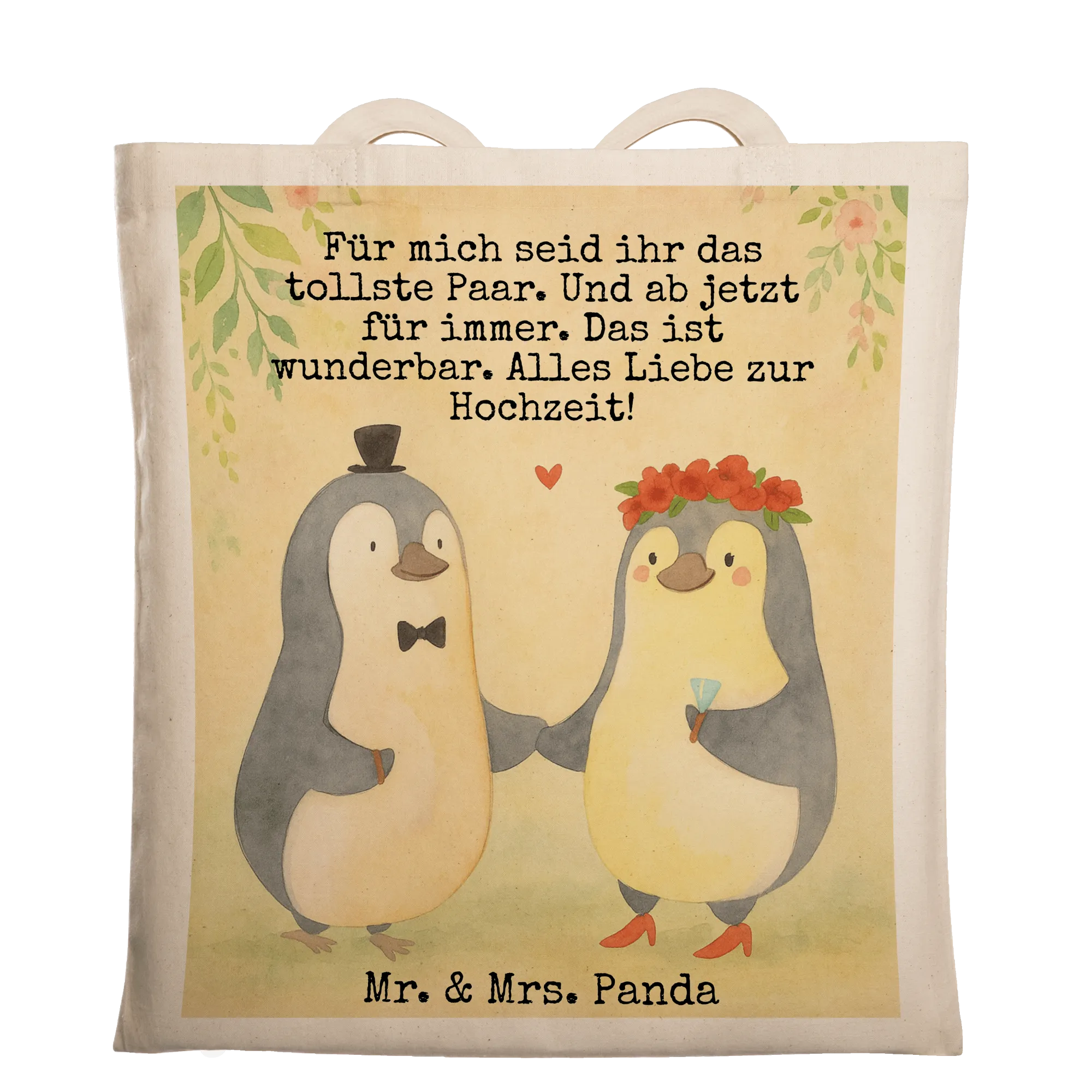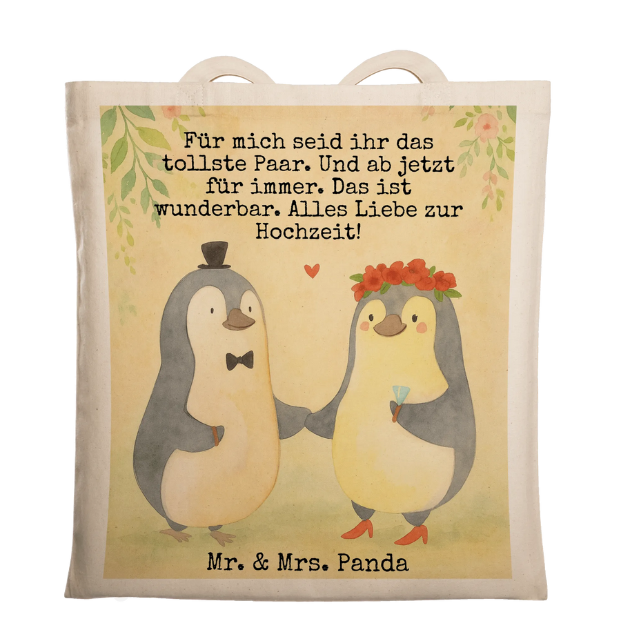 Meet our adorable wedding couple penguin motif, a sweet representation of eternal love. Hand-in-flipper, these cute penguins embody romance, perfect for commemorating a wedding day. The bride, with her delicate floral crown and veil, and the groom in his stylish hat, create a charming image that speaks volumes. The phrase 'Für mich seid ihr das tollste Paar. Und ab jetzt für immer. Das ist wunderbar. Alles Liebe zur Hochzeit!' beautifully captures this enchanting moment and is an ideal gift idea for newlyweds or guests. It’s a canvas of joy that’ll bring smiles for years to come.