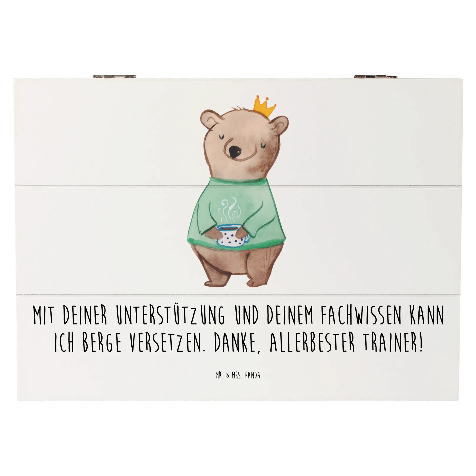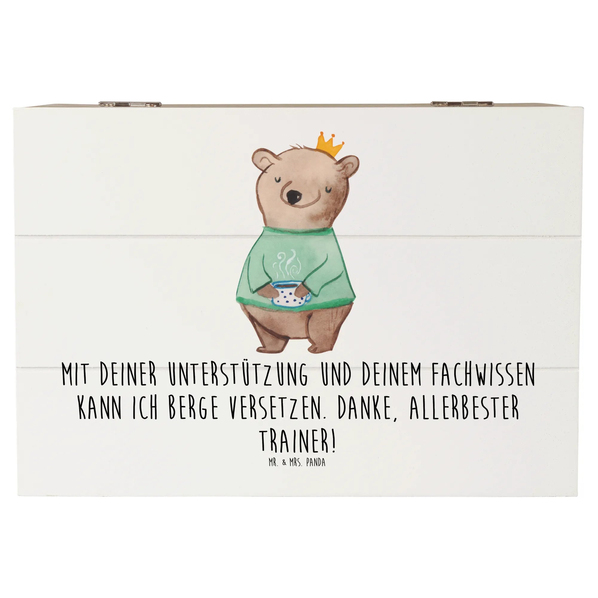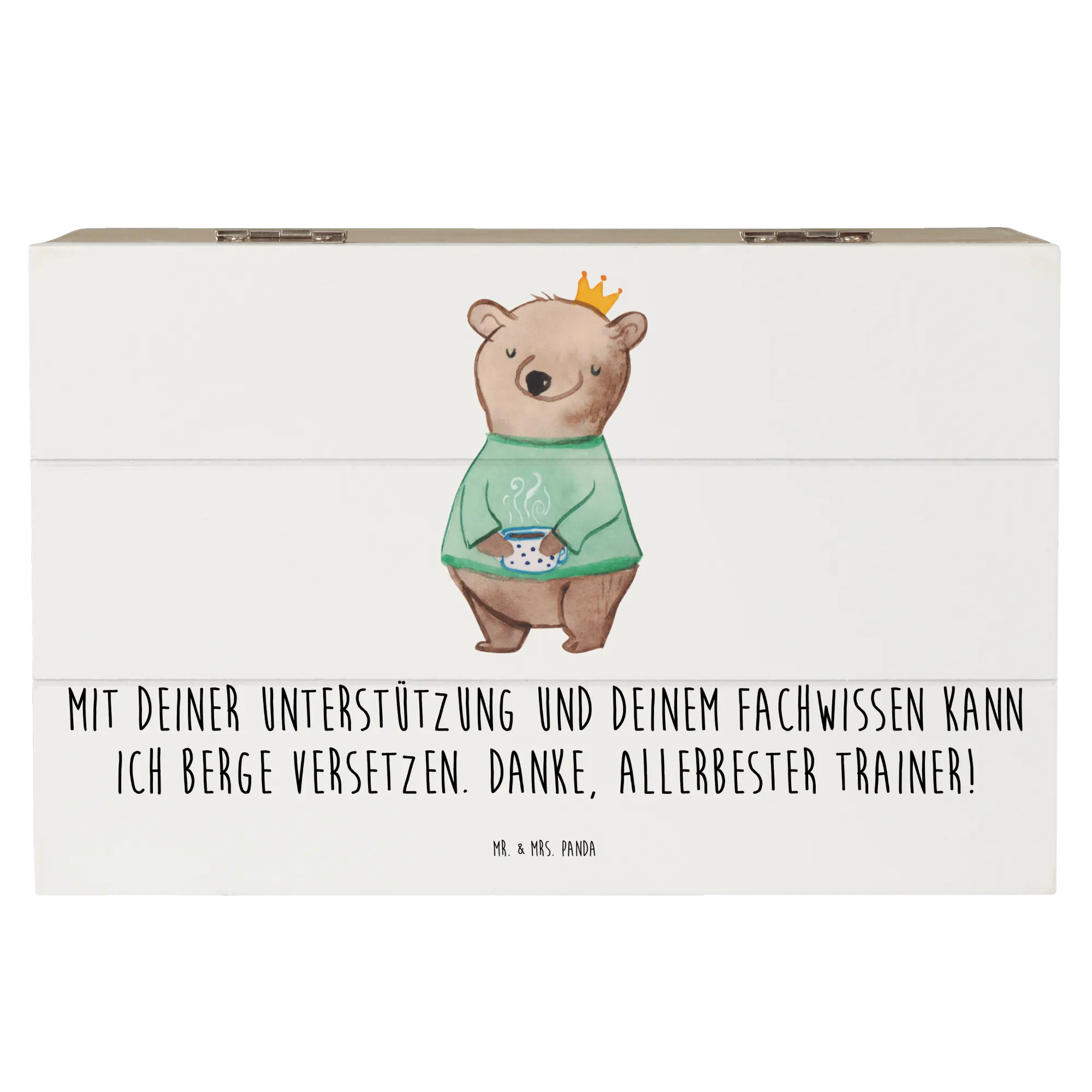 Mit der liebevoll gestalteten Holzkiste „Trainer“ von Mr. & Mrs. Panda zeigst du Dankbarkeit auf besondere Weise. Der aufgedruckte Spruch „Mit deiner Unterstützung und deinem Fachwissen kann ich Berge versetzen. Danke, allerbester Trainer!“ trifft ins Herz und macht diese Geschenkbox zur idealen Erinnerungskiste.