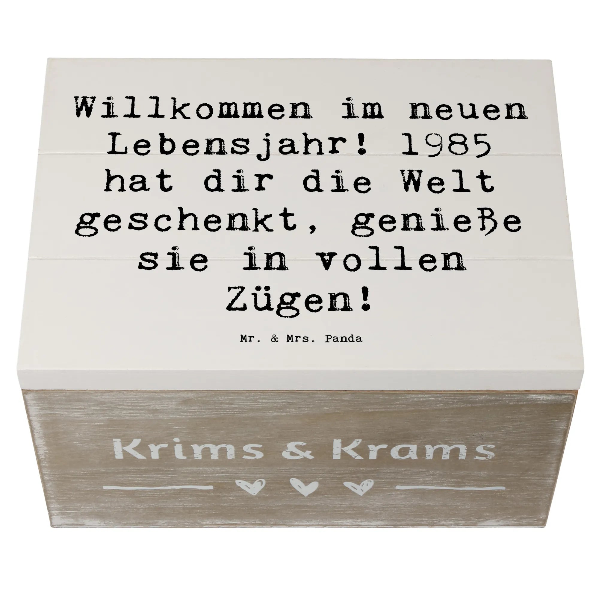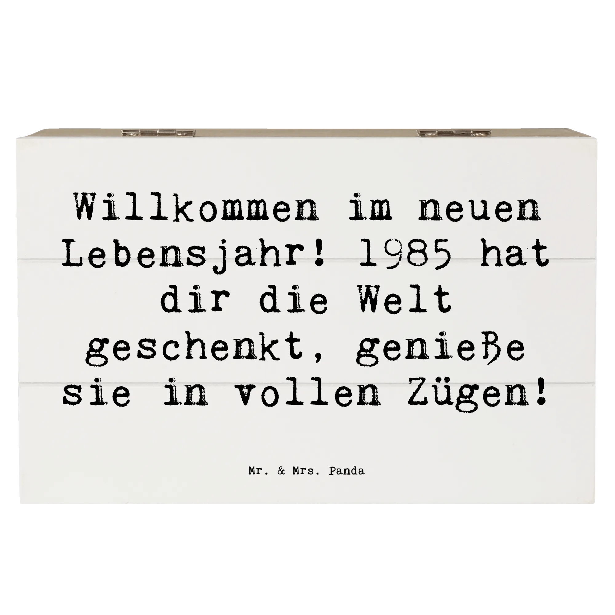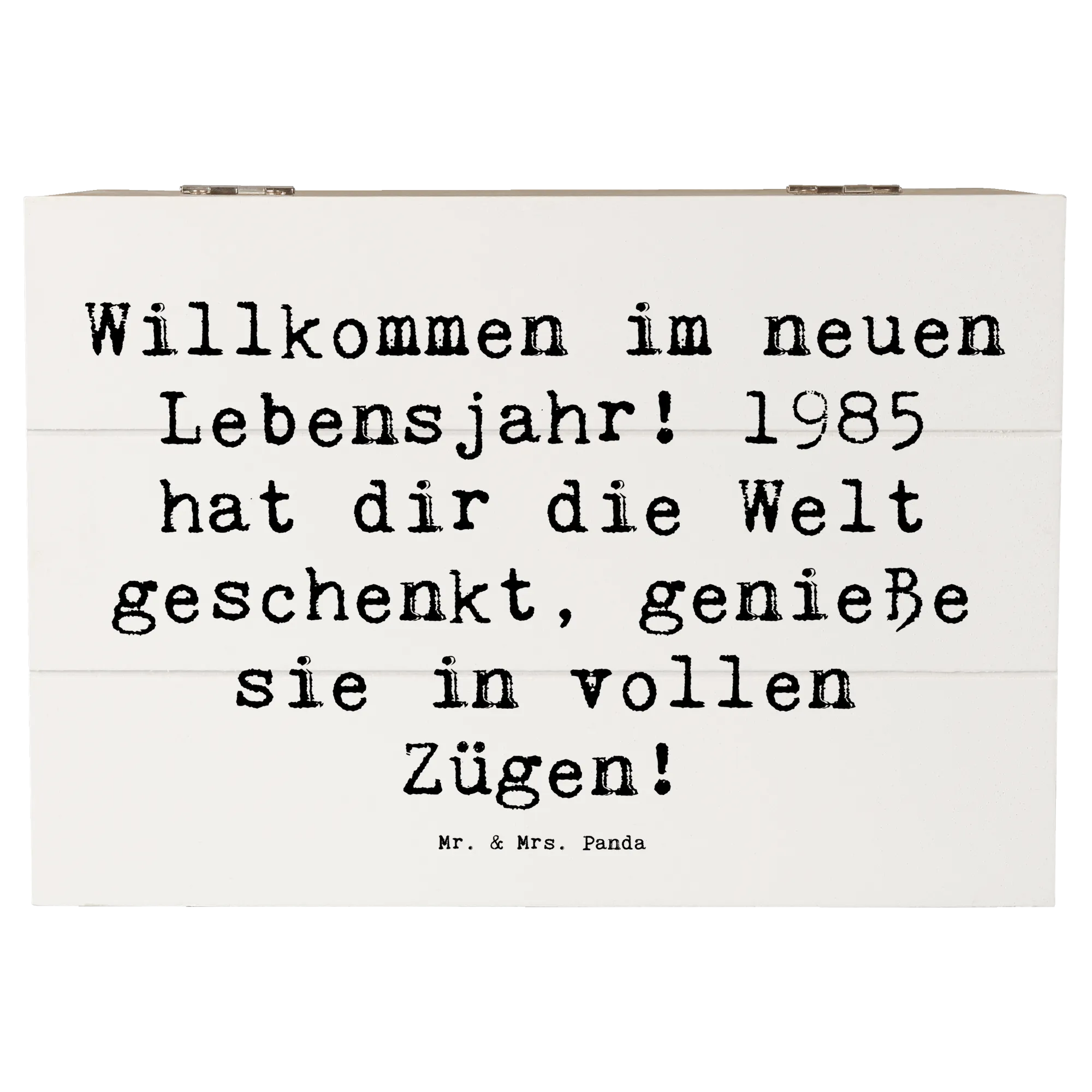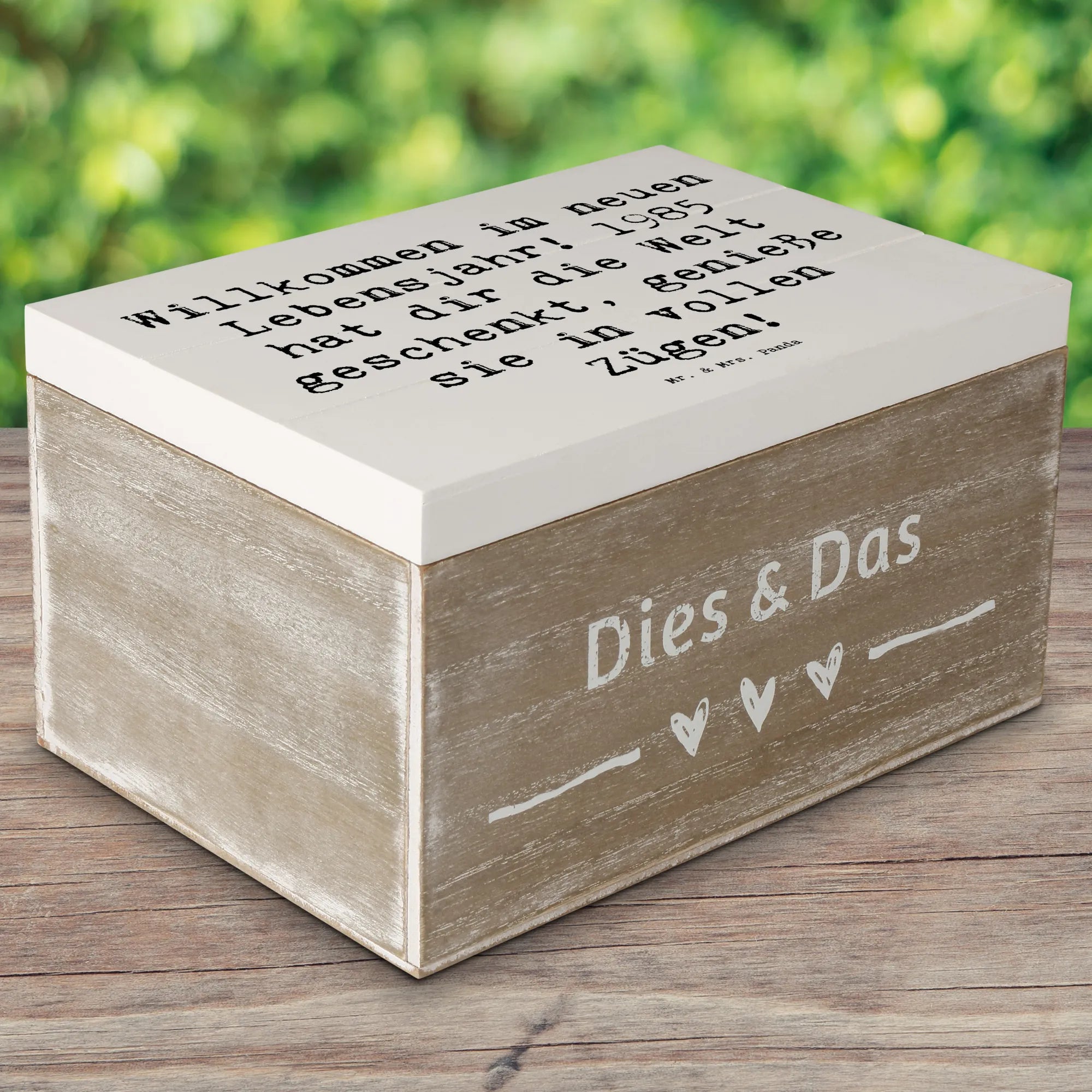 Wooden chest Saying Willkommen im neuen Lebensjahr! 1985 hat dir die Welt geschenkt, genieße sie in vollen Zügen! - 22 x 15 cm - White