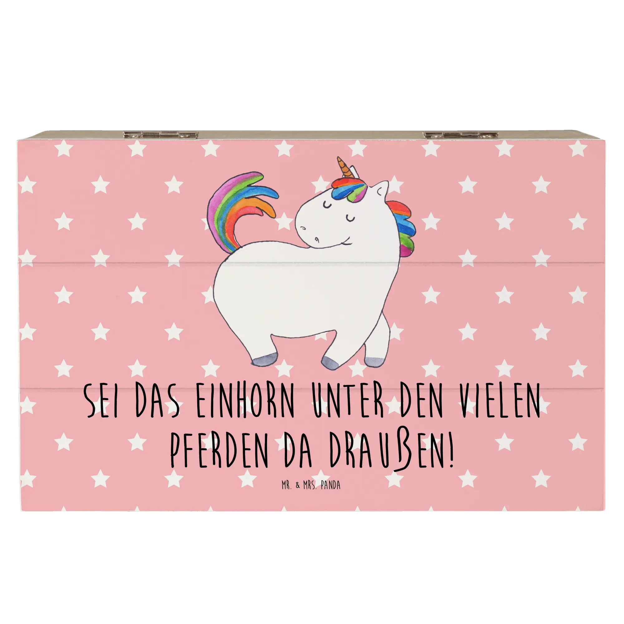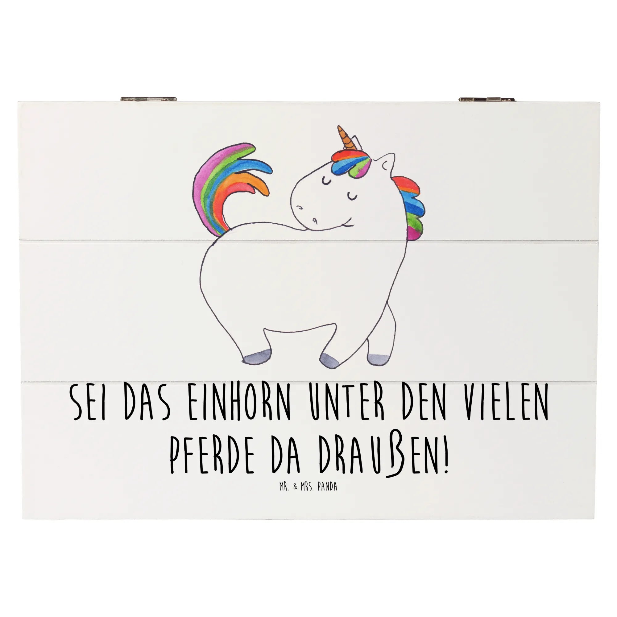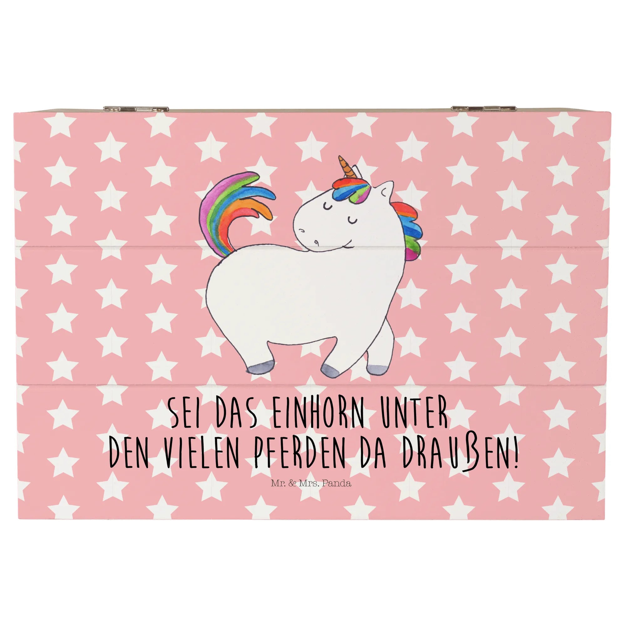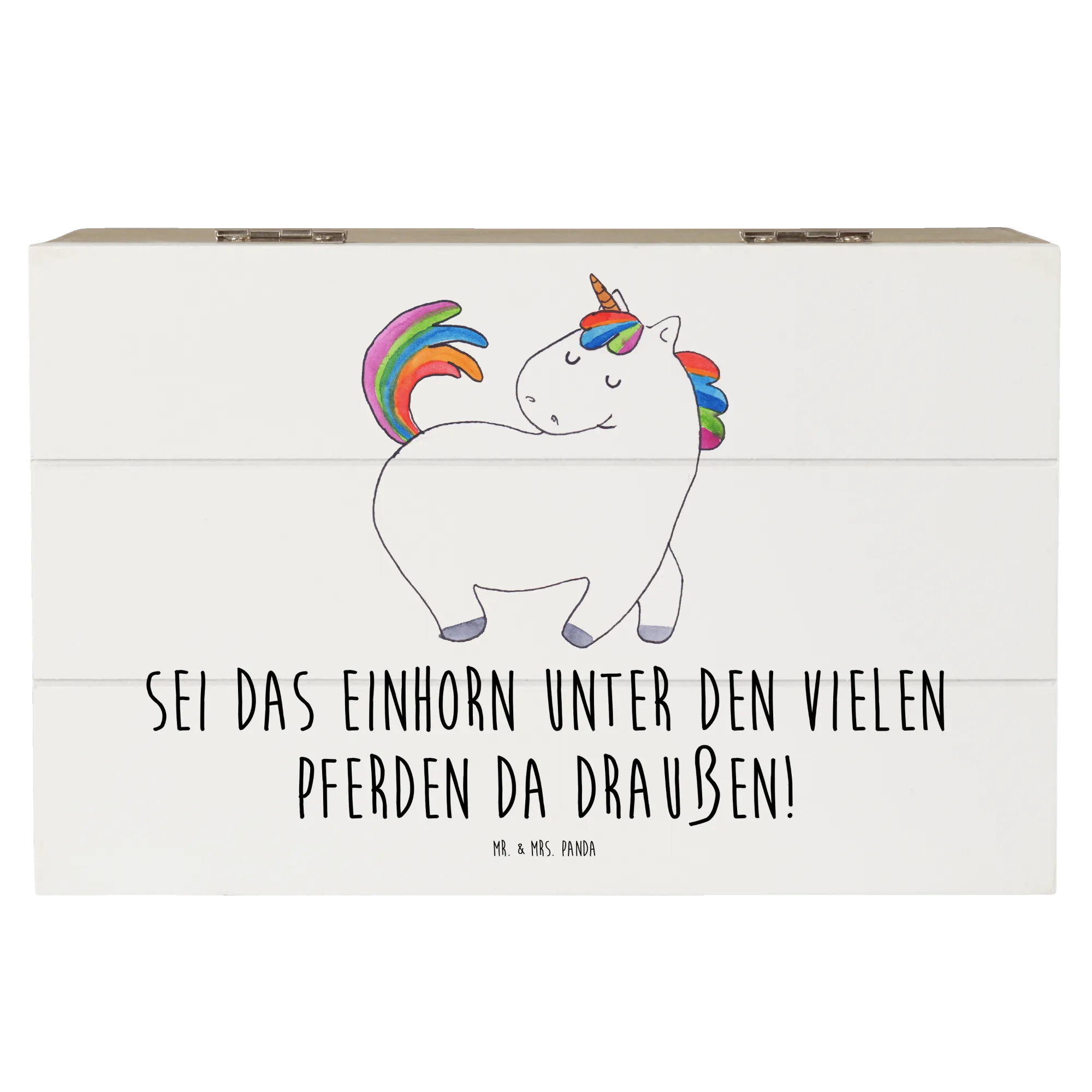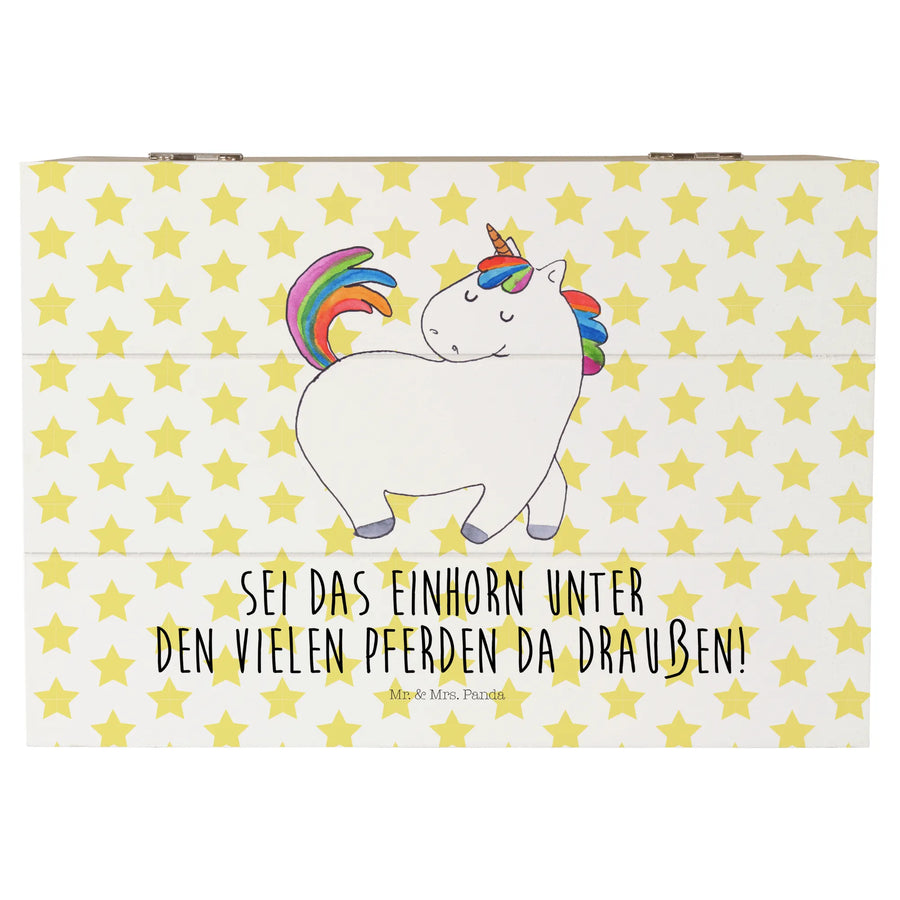 The Unicorn Strutting design is a true masterpiece, hand-drawn by Mrs. Panda, which makes every chest a unique piece of art. The saying "Sei das Einhorn unter den vielen Pferden da draußen!" (Be the unicorn among all the horses out there!) perfectly encapsulates the essence of this chest—celebrating individuality and the magic of being different. It's a wonderful reminder for your best friend or loved one, encouraging them to embrace their unique spirit, just as the strutting unicorn does in its vibrant dance through life.