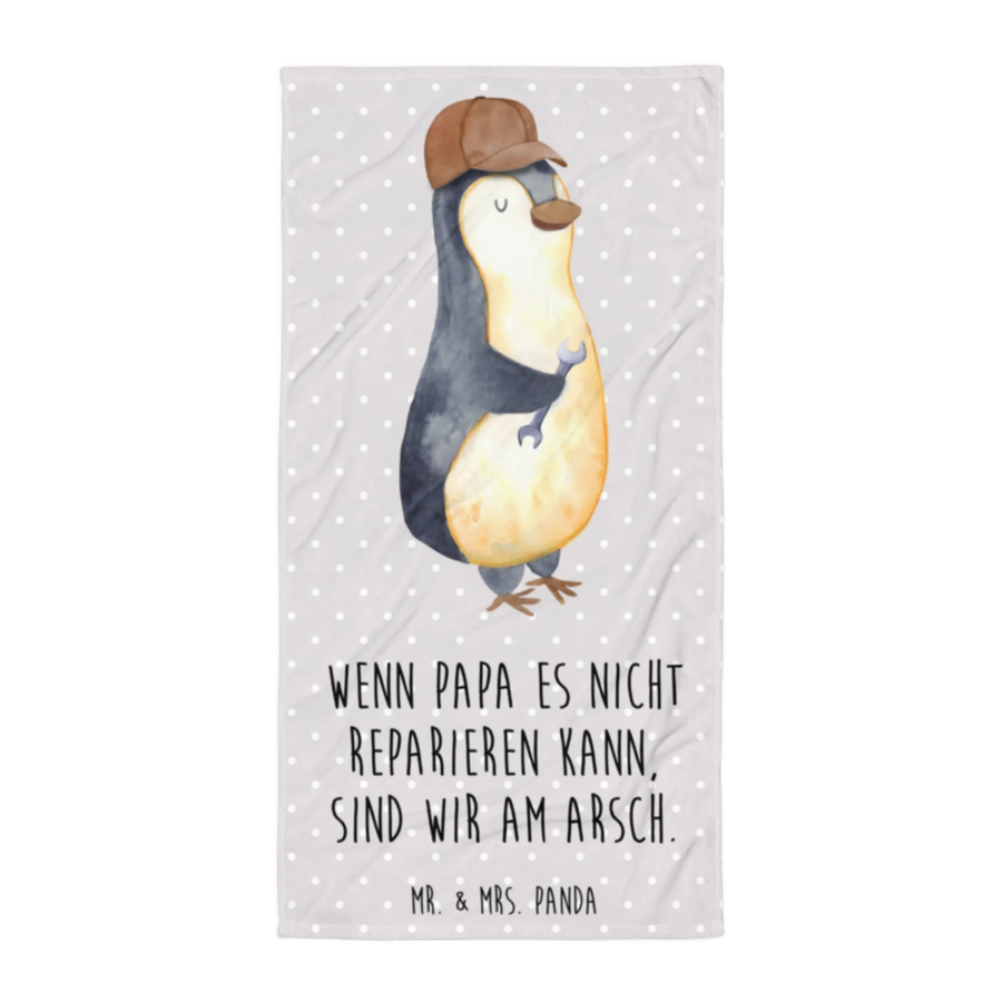 Introducing the XL bath towel by Mr. & Mrs. Panda, designed with love and a sprinkle of whimsy! This gorgeous towel features the playful motif, "If Daddy can't fix it, we're screwed." Picture a cheeky penguin wearing a brown cap, humorously clutching a stylized wrench, perfectly embodying the light-hearted spirit of fatherhood!