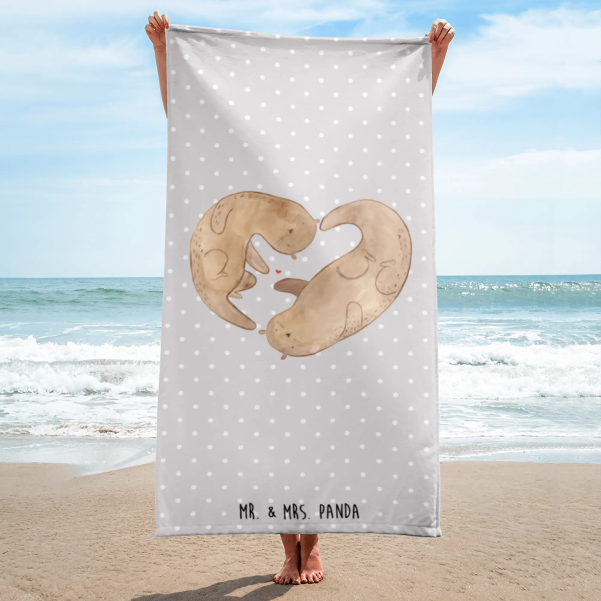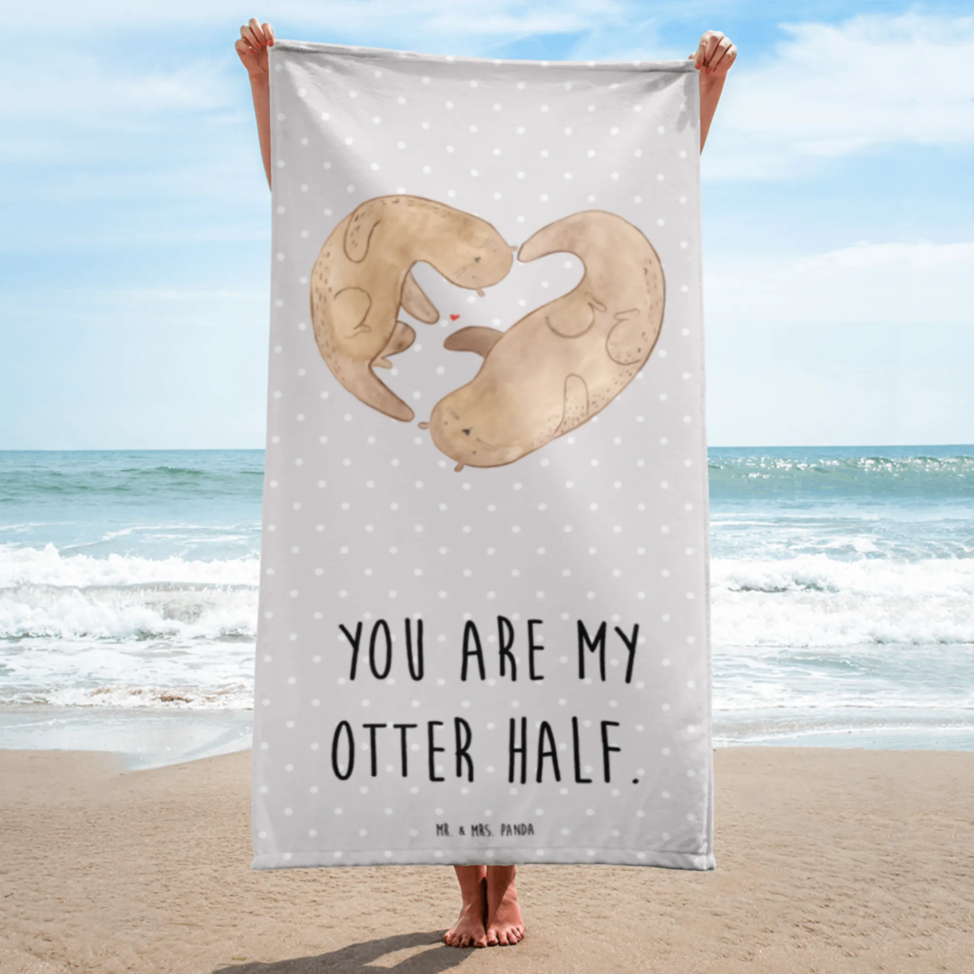 The Mr. & Mrs. Panda XL Bath Towel featuring an adorable otter heart motif is a delightful blend of love and comfort. Measuring an impressive 1520 mm x 760 mm, this oversized towel is perfect for those sun-drenched days at the beach or relaxing afternoons by the pool. Crafted from a plush cotton blend (50% cotton, 50% polyester), it offers the ultimate softness and absorbency, making every drying experience a cozy one.