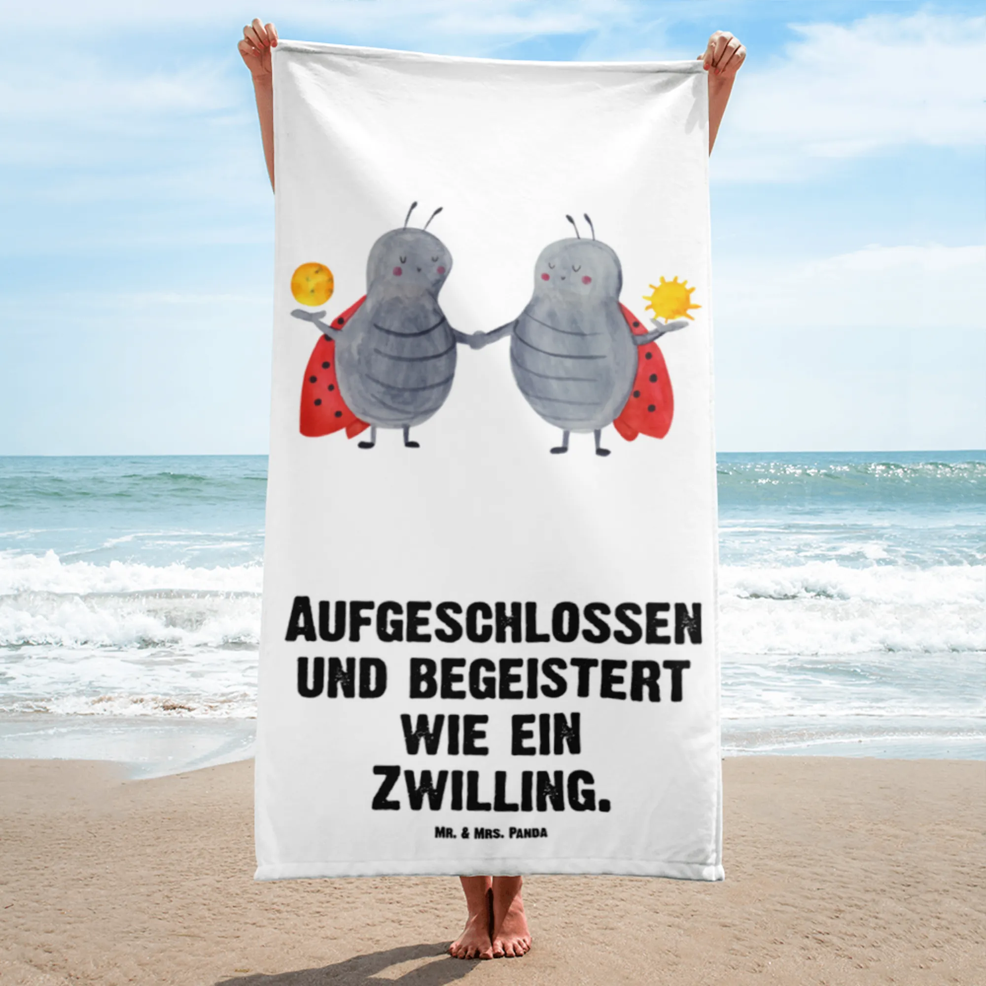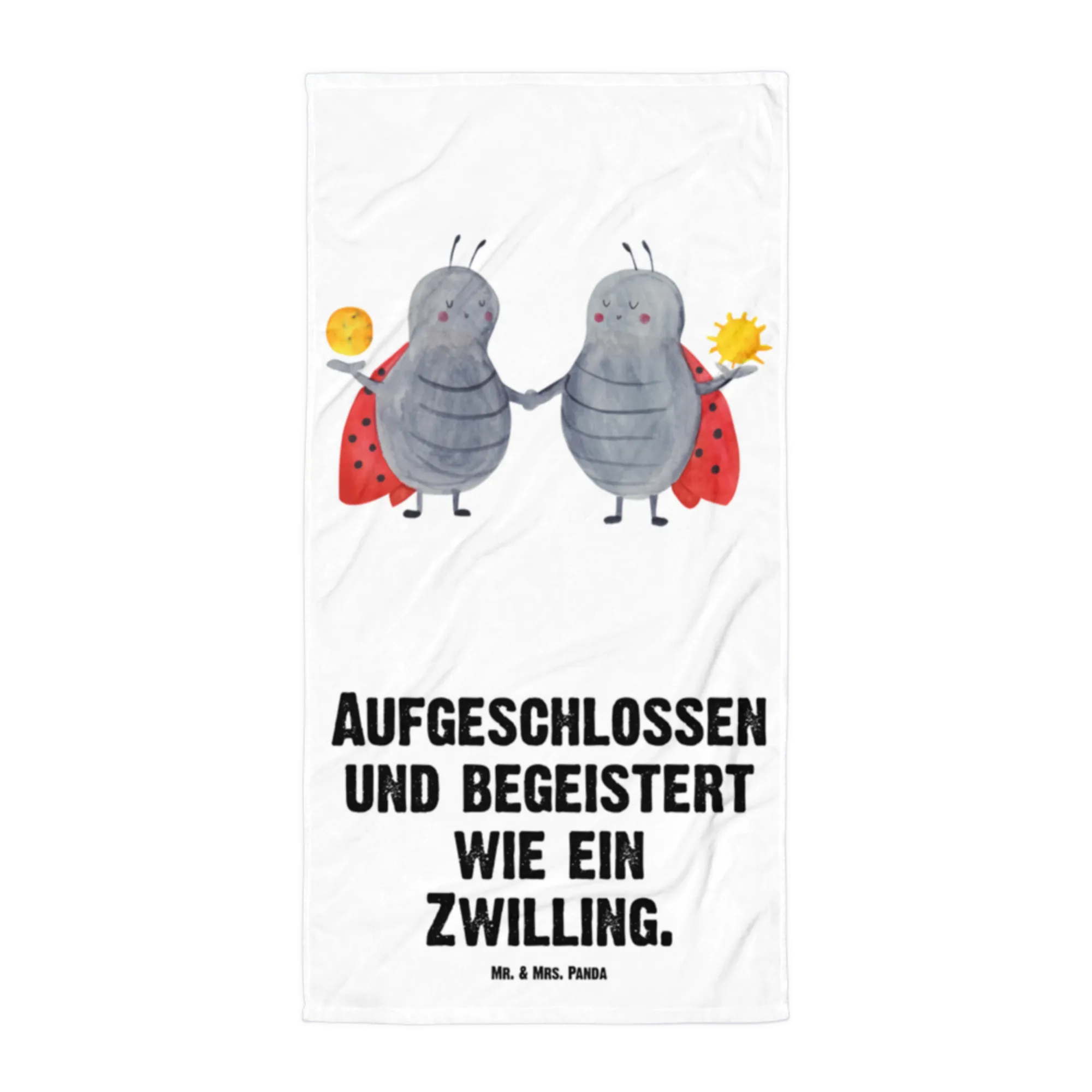 Die Vorderseite des Handtuchs ist farbenfroh und hochwertig bedruckt mit einem charmanten Design, das zwei lächelnde Marienkäfer zeigt, die für Glück und Glückseligkeit stehen. Gleichzeitig trägt der Spruch ‚Aufgeschlossen und begeistert wie ein Zwilling‘ zur positiven Ausstrahlung bei und bringt ein Lächeln auf die Gesichter der Beschenkten.