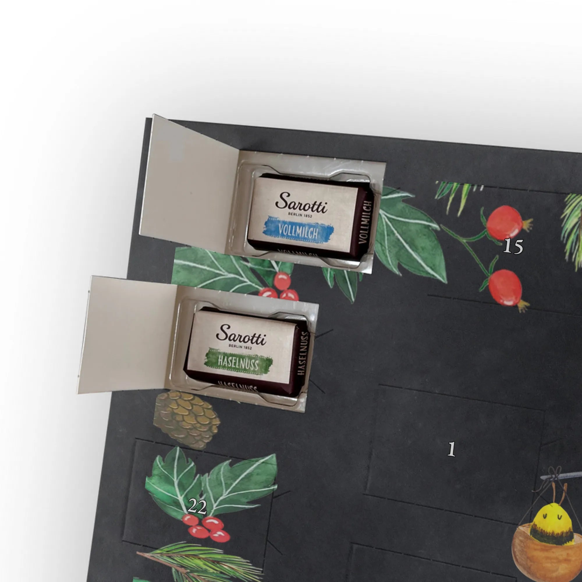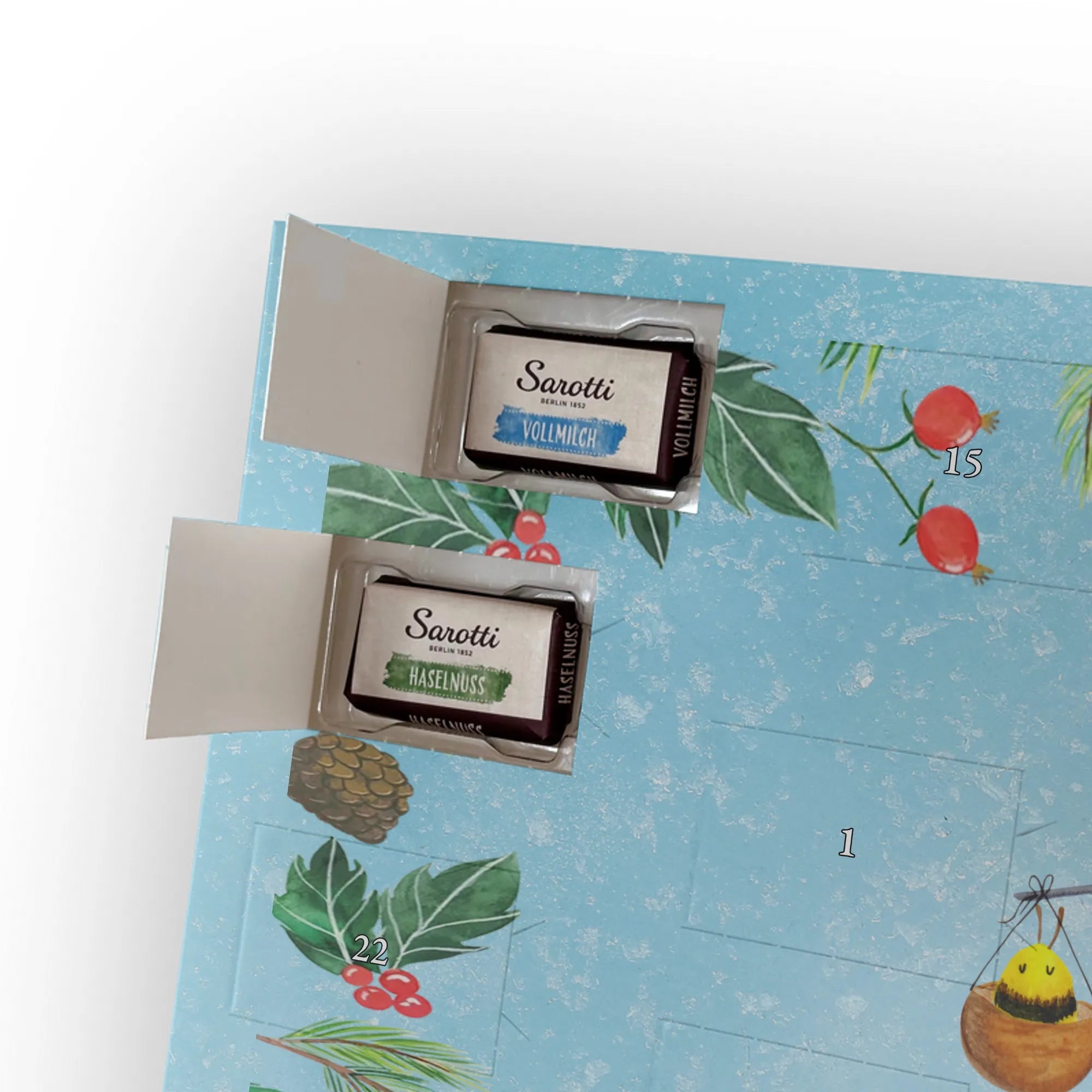 This handy advent calendar 2020 from Mr. & Mrs. Panda is really something very special - it is decorated with wonderful motifs and has the size 24m x 18cm x 2,5cm. It is filled with 24 chocolate balls and costs 14,90€ - the calendar can be hung up or set up using the set-up function on the back. Please note that we also have a larger calendar with delicious chocolate from Hello Lindt.