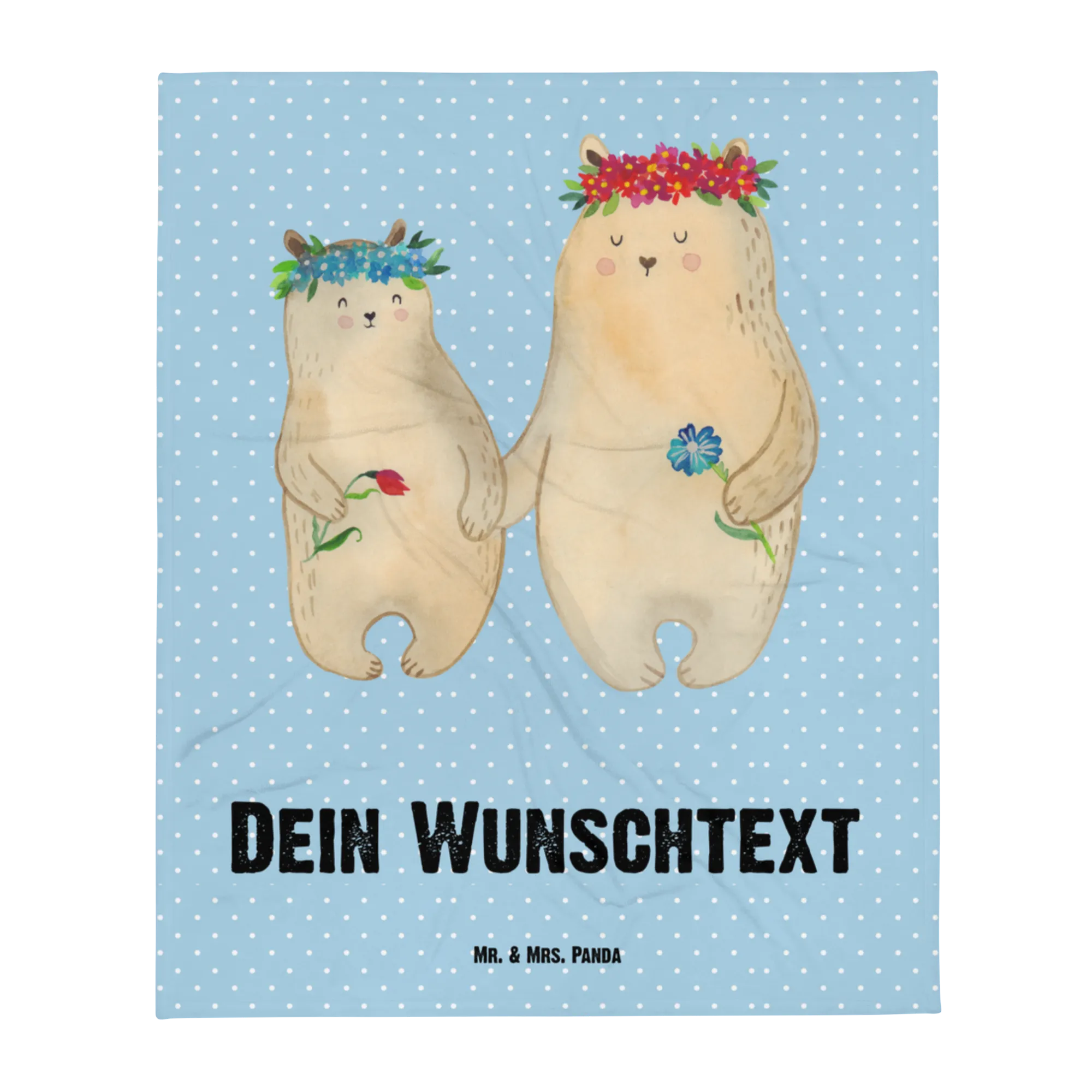 Baby blanket with name Bears with flower crown - Blue Pastel