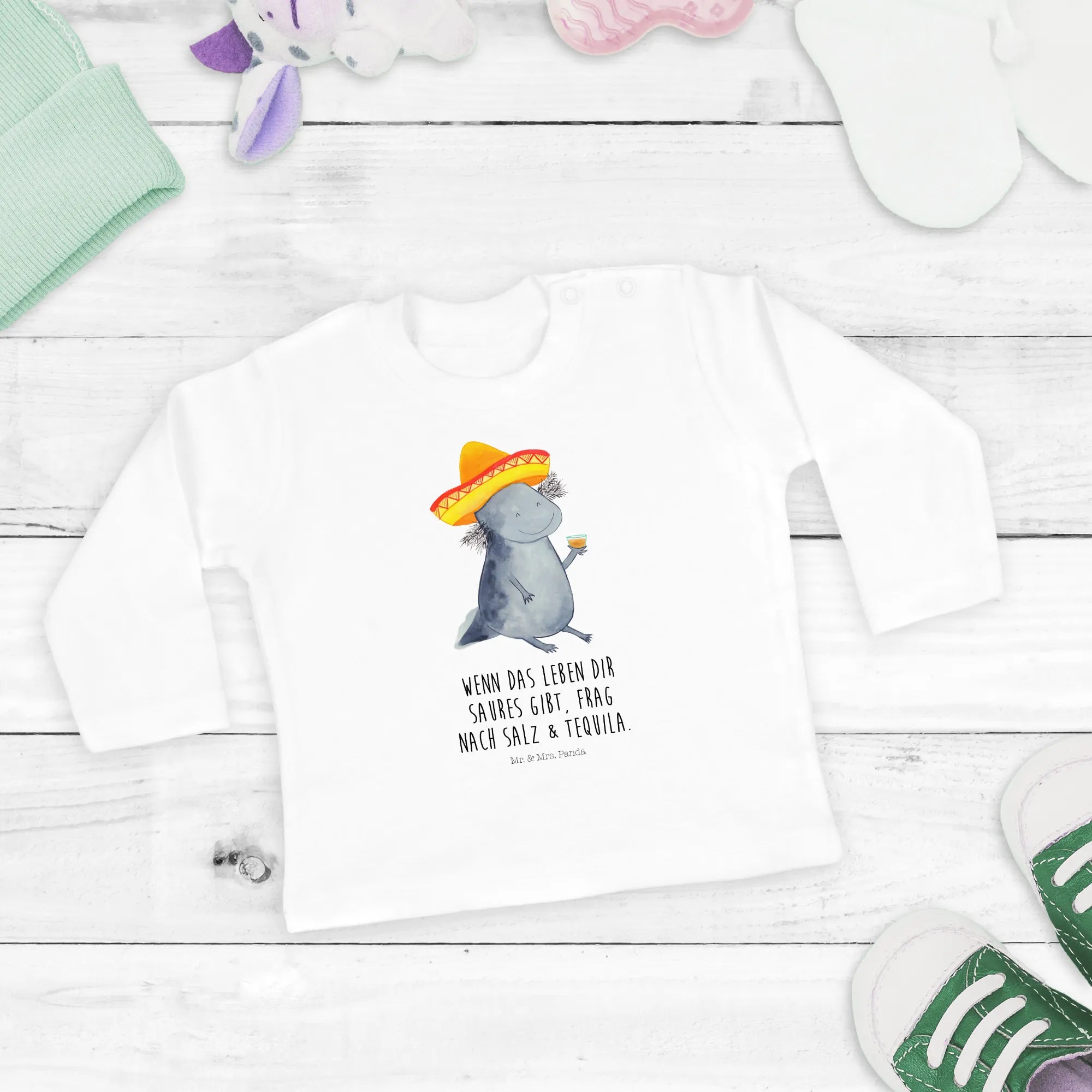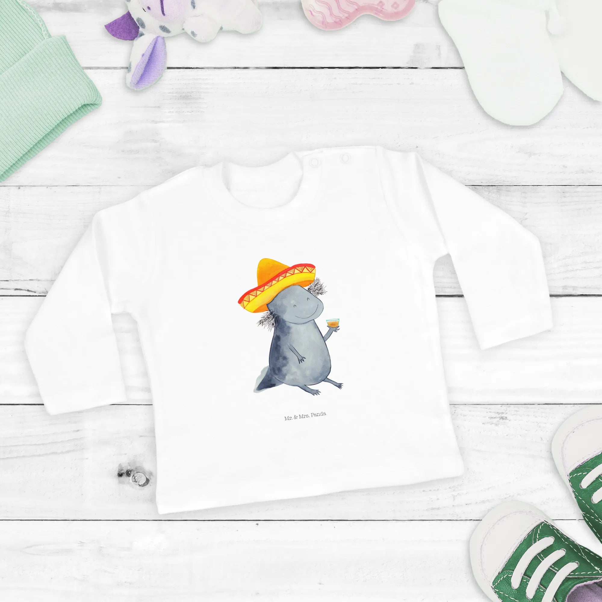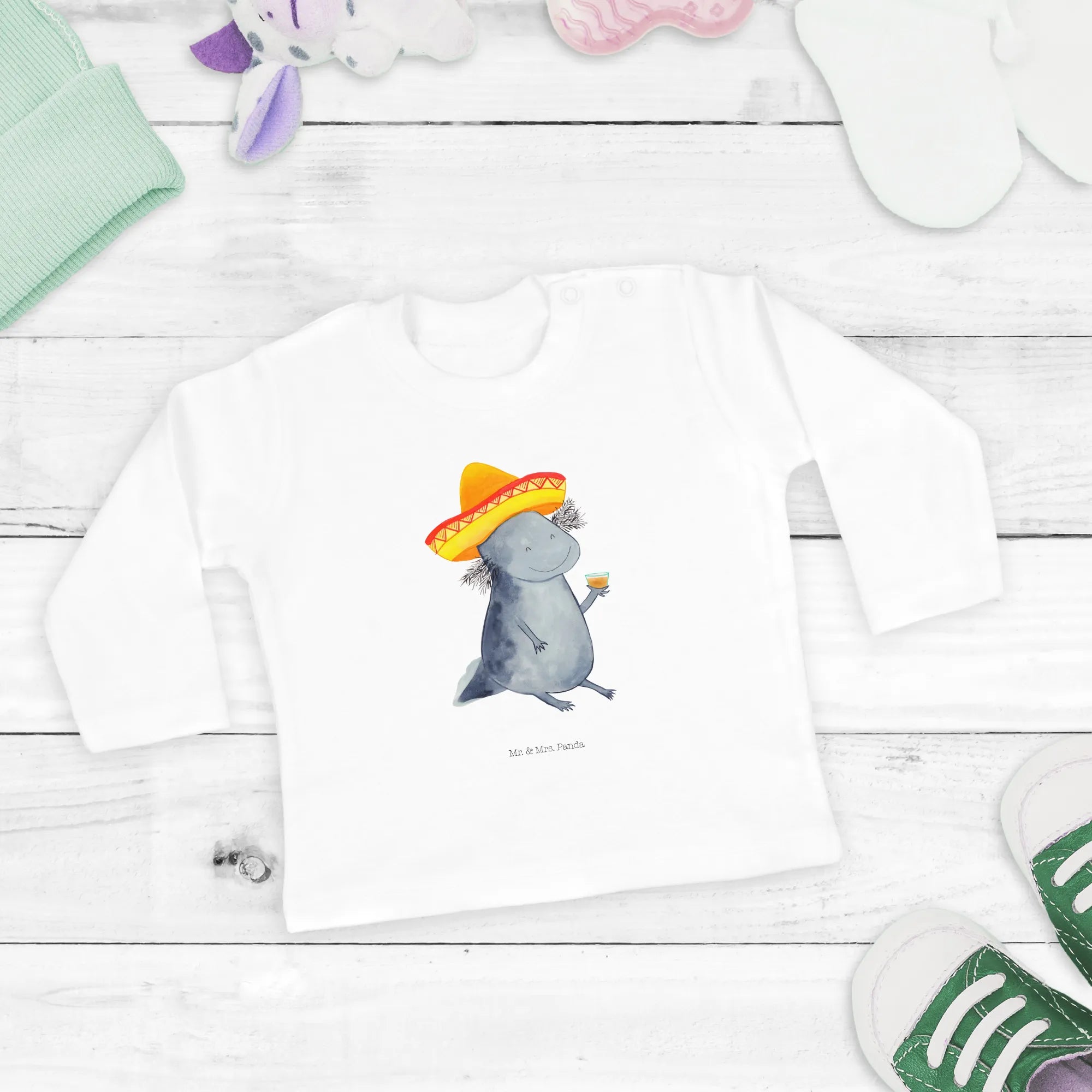 Why choose our Axolotl Tequila long-sleeve shirt? It’s about that personal touch! Each design is lovingly hand-drawn by Mrs. Panda, ensuring that your baby wear is unique and made with care. The vibrant colors and cheerful design ensure that it not only looks adorable but also remains durable, perfect for any little explorer.