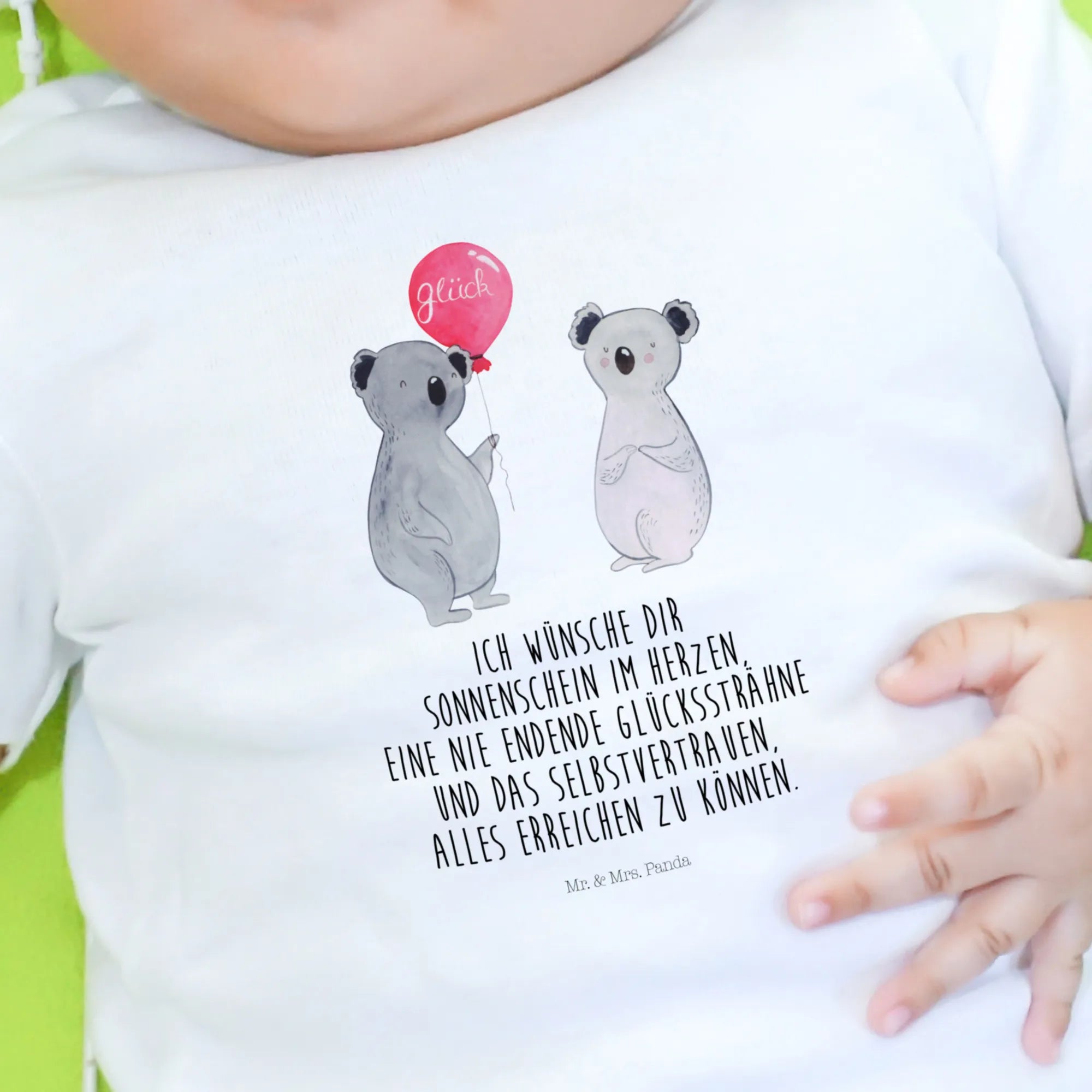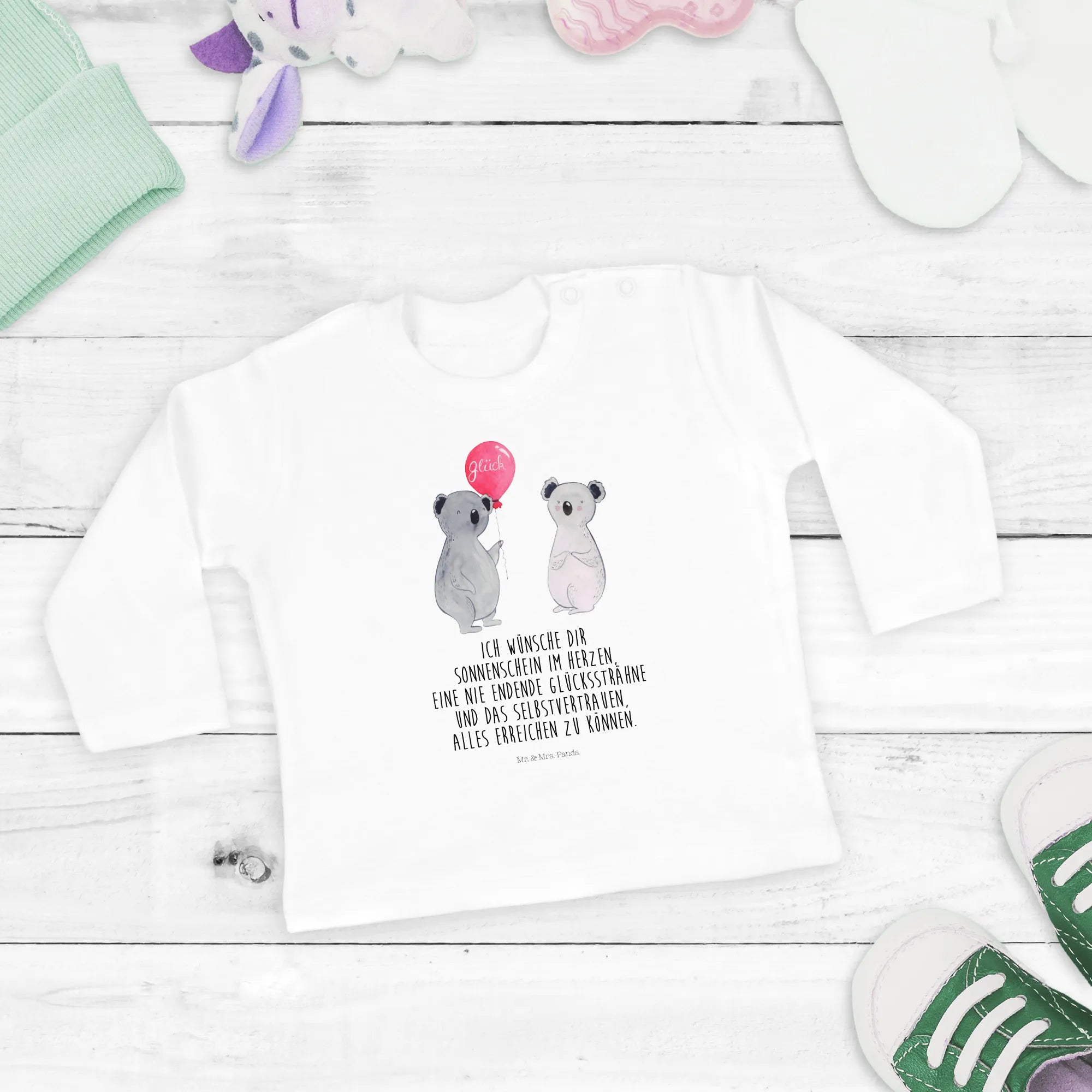 Imagine two cute koalas, bursting with happiness! One of them holds a bright balloon, embodying the joyous spirit of any celebration. This delightful motif is perfect for parties and birthdays, serving as a reminder to cherish those special moments. The slogan 'Ich wünsche dir Sonnenschein im Herzen, eine nie endende Glückssträhne und das Selbstvertrauen, alles erreichen zu können' perfectly conveys our wishes for you—may sunshine fill your heart, luck follow you endlessly, and may you believe in your dreams. This design is a sweet reminder of how delightful life can be.