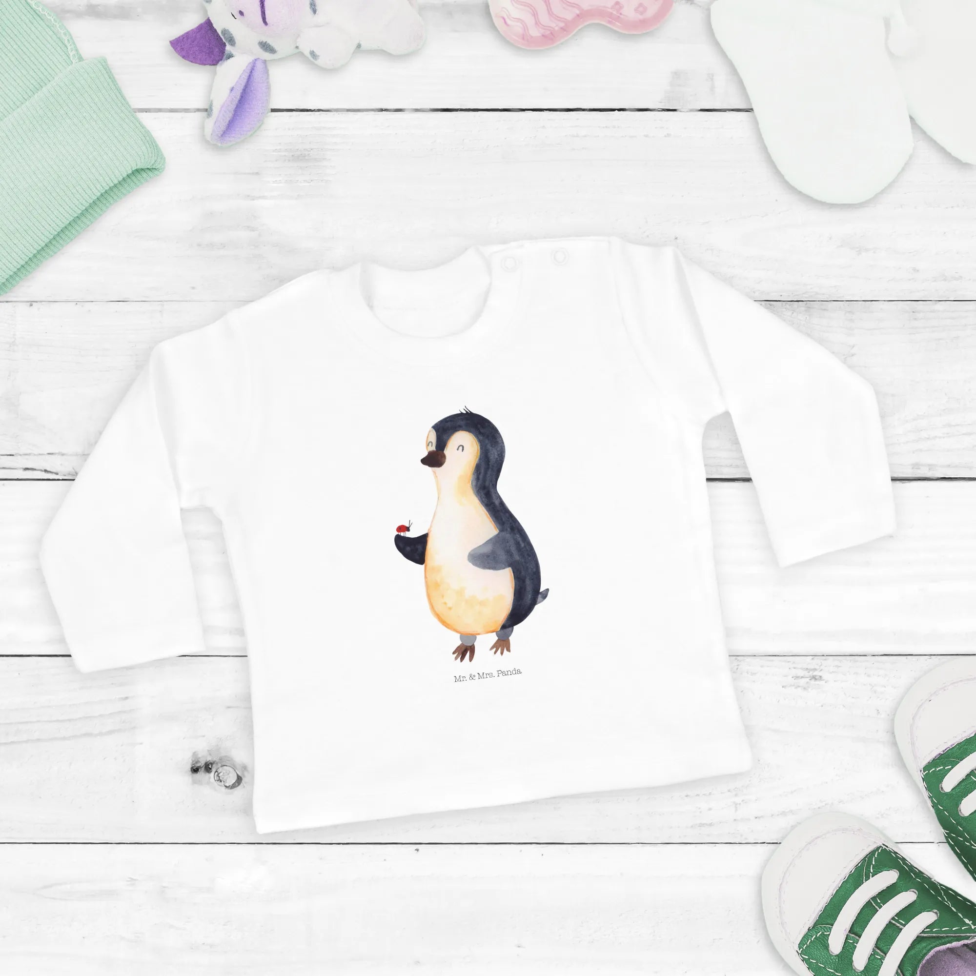 Looking for the perfect gift for your little bundle of joy? Look no further! The Baby Long Sleeve Penguin Ladybird from the delightful Penguin Collection by Mr. & Mrs. Panda is simply a must-have! This charming baby long-sleeve top is made from 100% organic cotton, ensuring that your baby is wrapped in the softest and most gentle fabric available. With its eye-catching motif of an adorable penguin holding a cheerful ladybird on its flipper, it will undoubtedly bring a smile to both babies and parents alike.