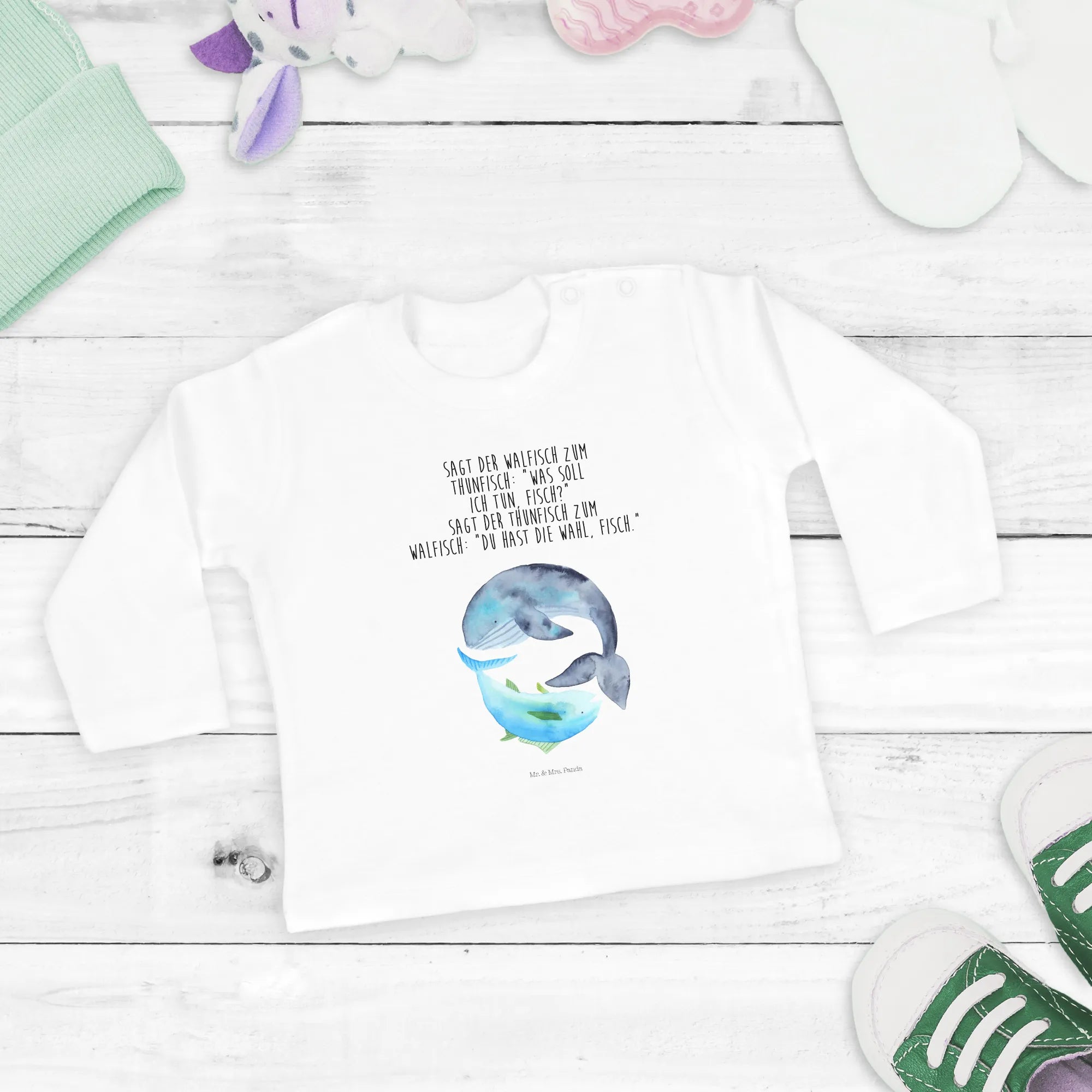 The charming design showcases the whimsical friendship between a playful whale and a curious tuna, beautifully hand-drawn by Mrs. Panda. This unique portrayal not only makes the shirt an eye-catching piece but also sparks joy and laughter. The flat joke embedded in the design—"What shall I do, fish?" and "You have the choice, fish!"—will surely bring a smile to any face, making it a fantastic gift idea for baby showers or first birthday celebrations.