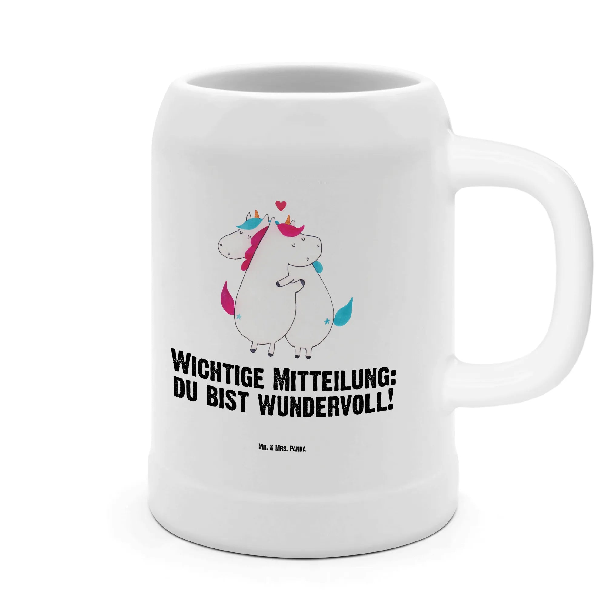 Measuring a perfect 500ml, this charming beer mug is not just a drinking vessel; it’s an exquisite piece of art designed for those who love unique and funny gifts. Perfect for unicorn enthusiasts, this mug features two snuggling unicorns that send out a heartwarming message: "You are wonderful!" It’s a fantastic way to express appreciation to a loved one or partner, and it fits seamlessly into any celebration or occasion.
