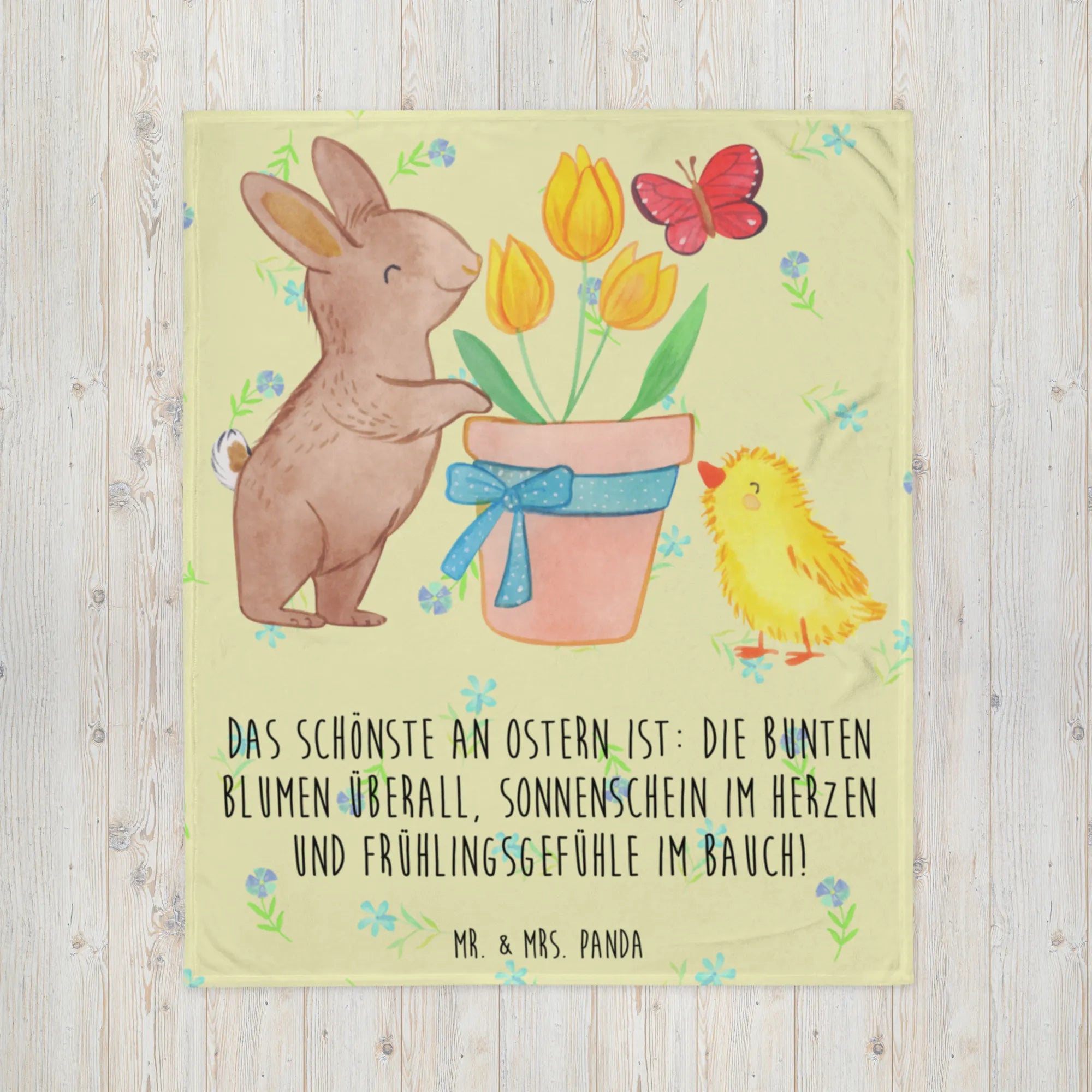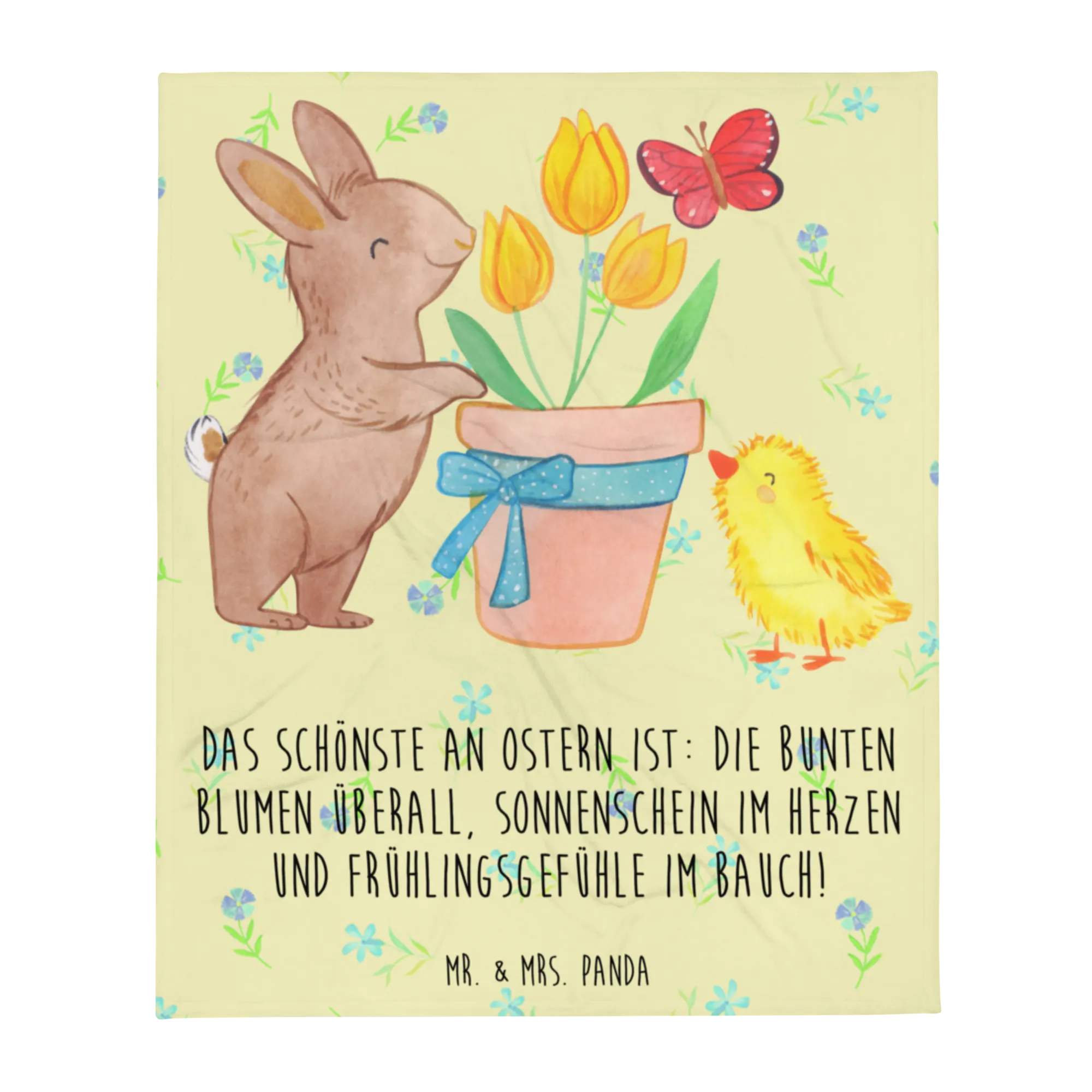In this heartwarming motif, we find a joyful bunny embracing a vase adorned with three vibrant yellow tulips. The vase, lovingly tied with a blue polka-dotted bow, brings an extra touch of charm to the scene. A cheerful little yellow chick stands at the base of the vase, gazing up at the tulips, while a bright red-orange butterfly flutters nearby. The warm, soft colors create an inviting and uplifting atmosphere, perfectly reflecting the joy of Easter. Our slogan captures this spirit: 'Das Schönste an Ostern ist: die bunten Blumen überall, Sonnenschein im Herzen und Frühlingsgefühle im Bauch!' Embrace the happiness that Easter brings and let your heart bloom just like those beautiful flowers!