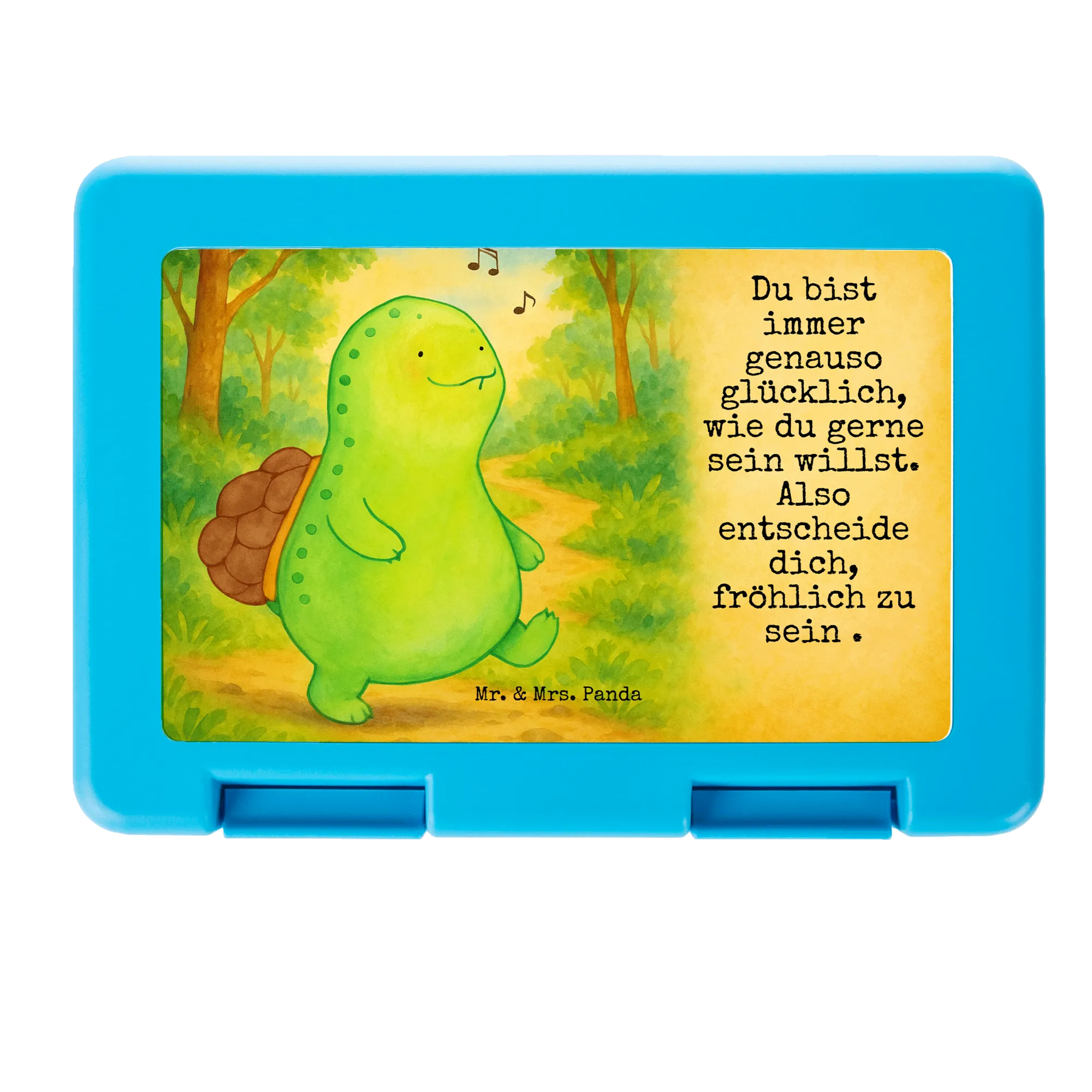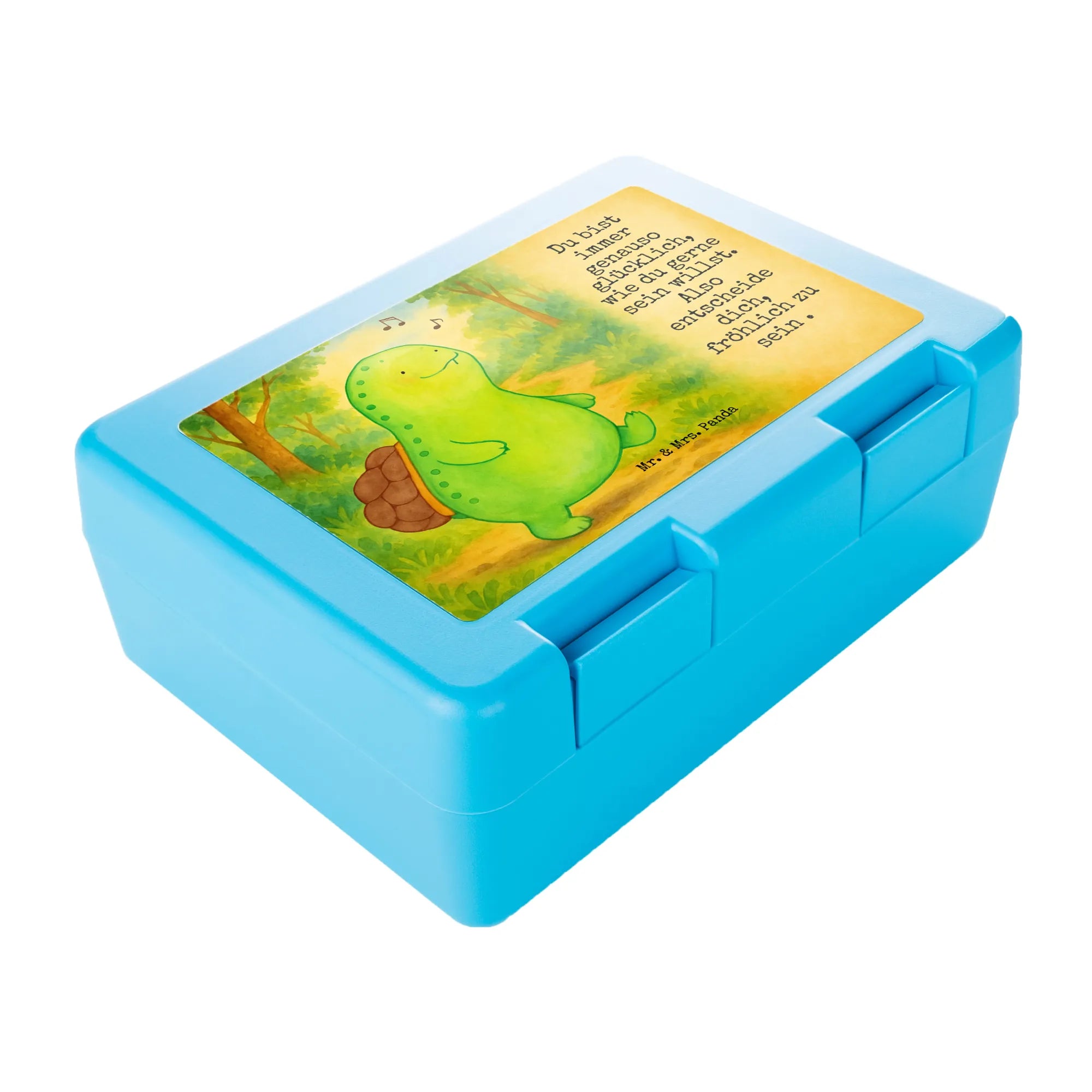 Diese liebevoll gestaltete Brotdose aus unserer Schildkröten-Kollektion verbindet Funktionalität mit Herzlichkeit. Das süße Motiv einer fröhlich pfeifenden Schildkröte und der inspirierende Spruch „Du bist immer genauso glücklich, wie du gerne sein willst. Also entscheide dich, fröhlich zu sein .“ schenken jedem Pausenmoment ein Lächeln. Ob als Brotbehälter für die Schule, Bento Box für die Uni oder Lunchbehälter für die Arbeit – diese Lunchbox bringt Lebensfreude mit.