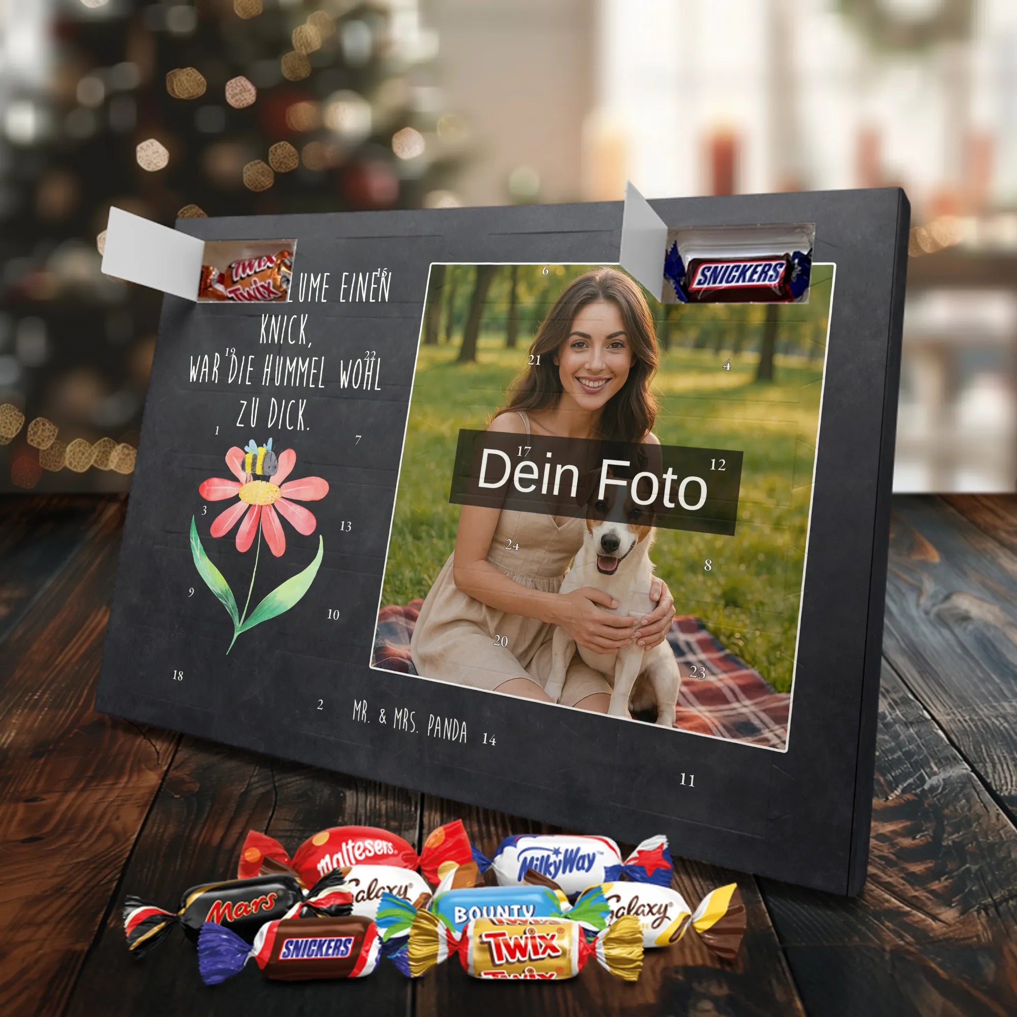Lustiger Personalisierter Schoko Foto-Adventskalender – das Must-have für eine persönliche Adventszeit von Mr. & Mrs. Panda. Jeder Kalender wird mit unseren charmanten Illustrationen und liebevollen Sprüchen bedruckt, während dein Foto die Vorderseite einzigartig macht. Achte bitte darauf, ein Foto mit guter Qualität und ausreichend hoher Auflösung hochzuladen, damit der Druck gestochen scharf wirkt. Überprüfe den Bildausschnitt, damit wichtige Bereiche nicht verloren gehen. Denk daran, nur Bilder zu verwenden, bei denen du die nötigen Rechte besitzt. Die Verarbeitung ist hochwertig: brillante Druckqualität mit seidenmatter Oberflächenveredelung und bedruckten Seitenflächen. Maße: 325 mm x 225 mm x 27 mm. Du kannst den Kalender aufhängen oder aufstellen – sehr praktisch. Hinweis: Die hochgeladenen Fotos werden nicht nachbearbeitet oder zugeschnitten; Rücknahme bei personalisierten Foto-Artikeln ist ausgeschlossen. Gefüllt ist der Kalender mit Celebrations Schokolade – 24 Stück in 8 verschiedenen Sorten (Maltesers, Mars, Snickers, Twix, Milky Way, Bounty, Galaxy, Galaxy Caramel). Verschenke ein Stück persönlich gestaltete Vorfreude und mache jeden Dezembertag zu etwas Besonderem.