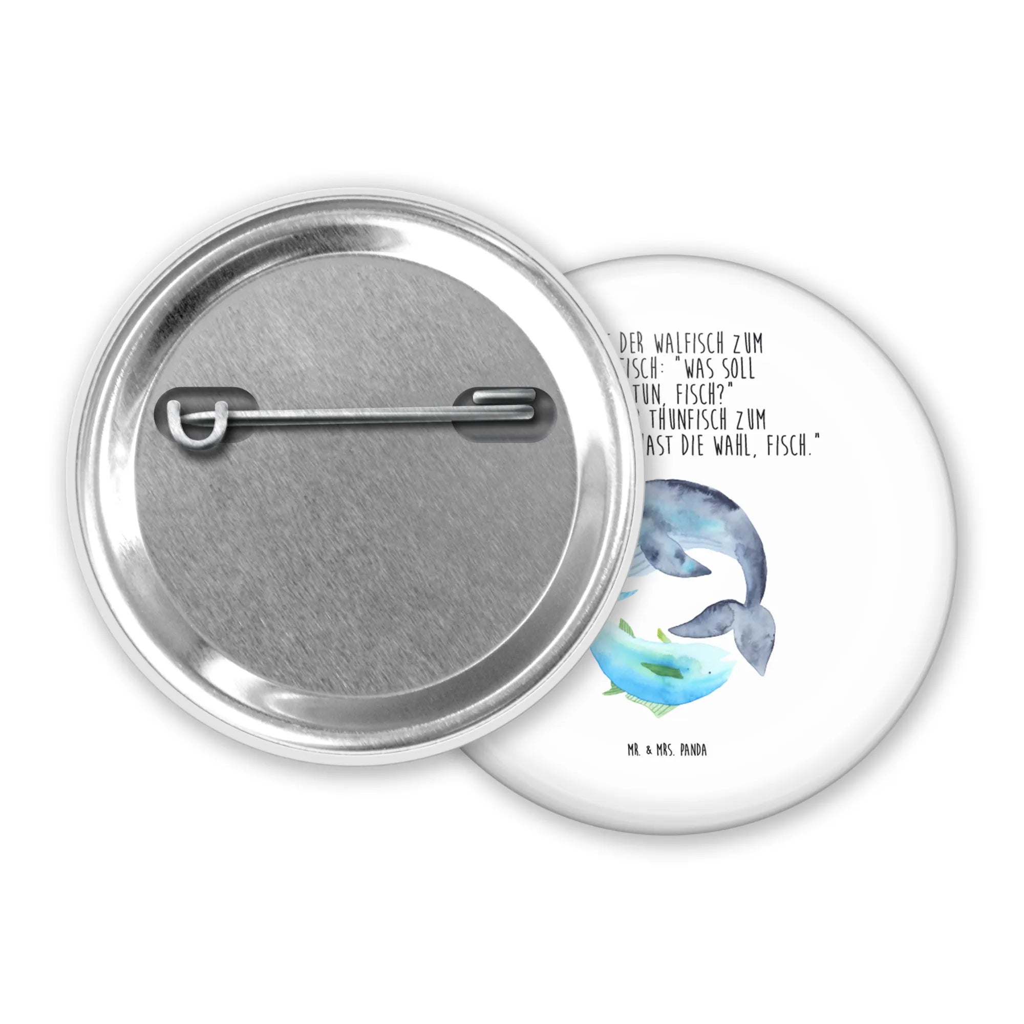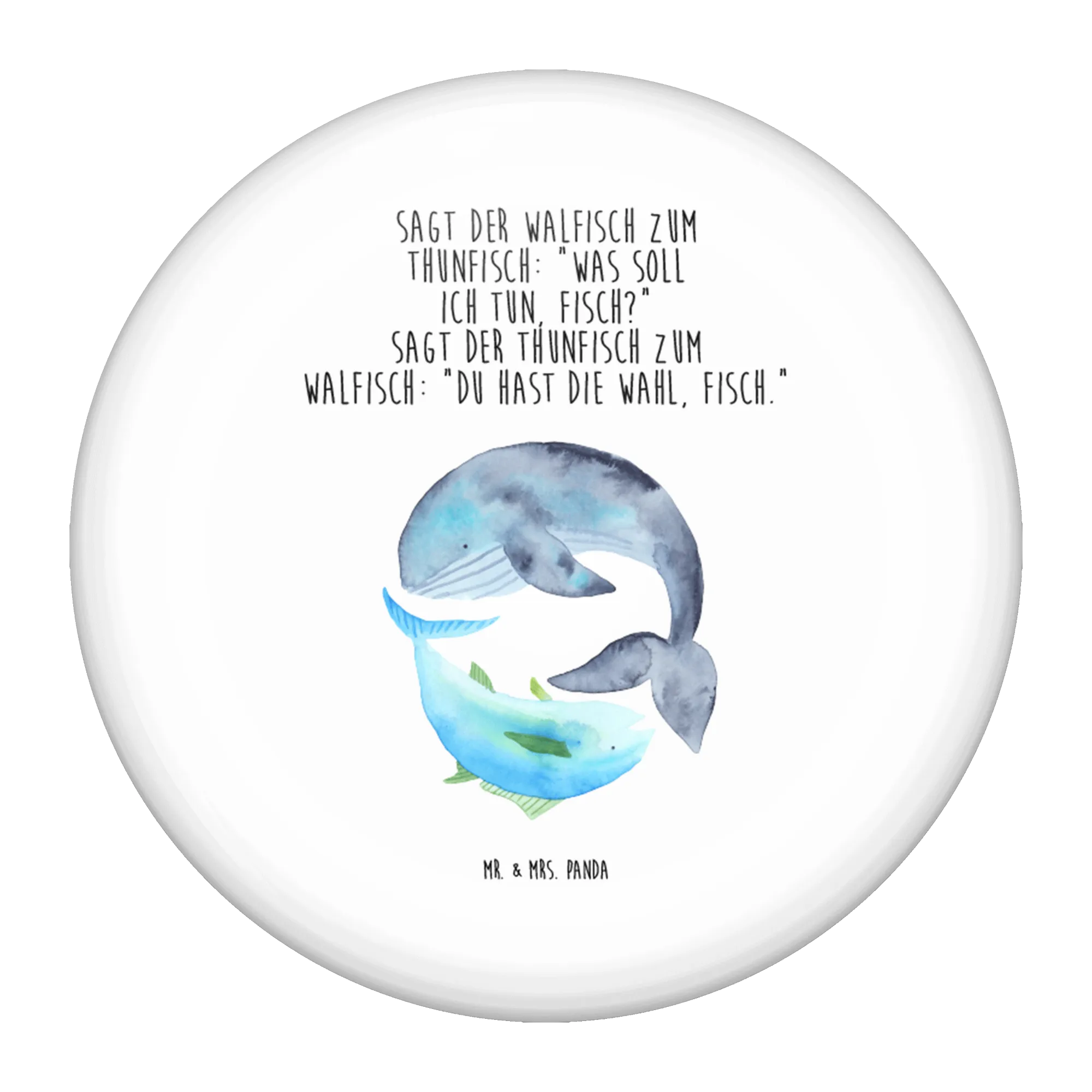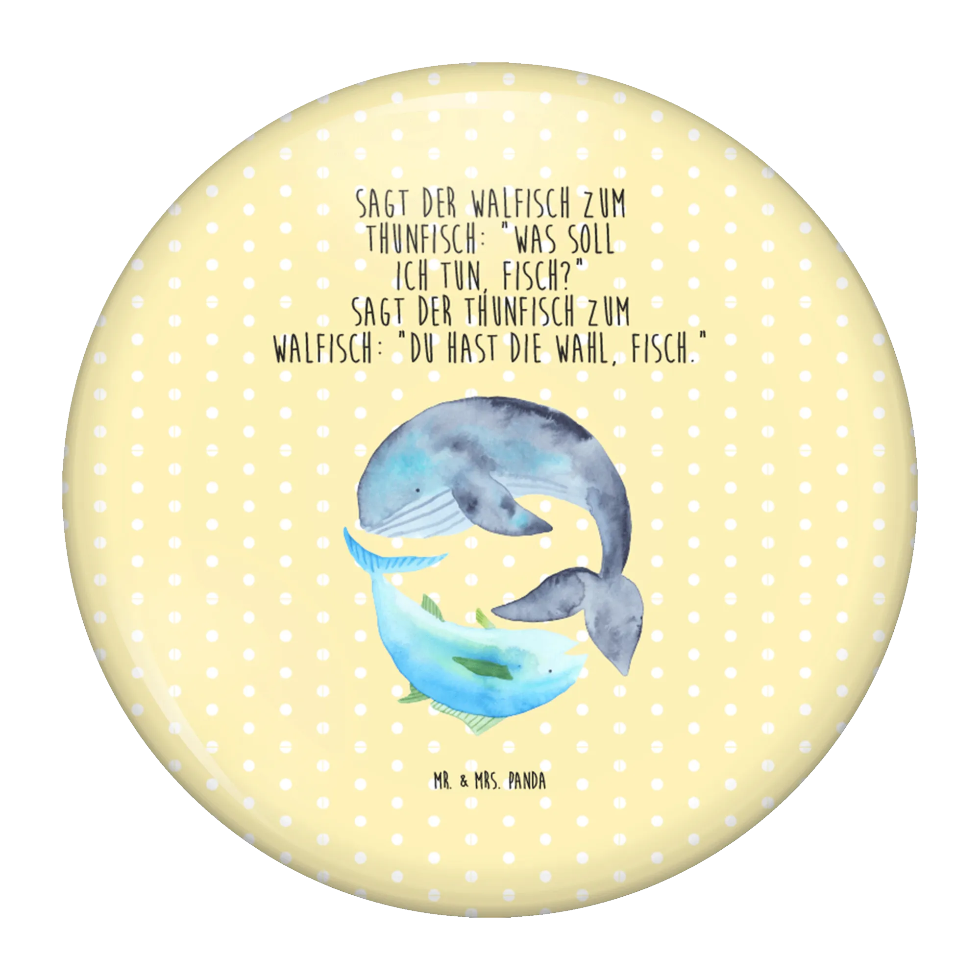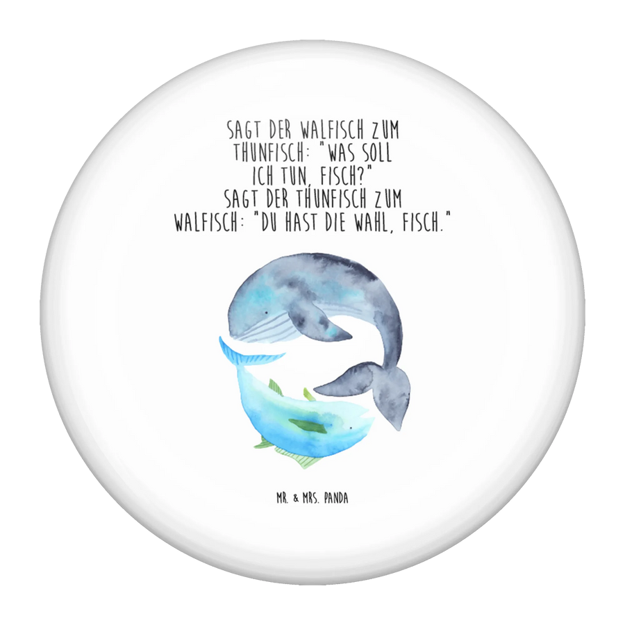 The design is adorned with the hilarious slogan, ‘Sagt der Walfisch zum Thunfisch: „Was soll ich tun, Fisch?“ Sagt der Thunfisch zum Walfisch: „Du hast die Wahl, Fisch.” This light-hearted banter between the whale and the tuna adds an extra layer of fun, making it an ideal gift for anyone with a sense of humor. Whether it’s a birthday, an animal-themed party, or simply a surprise for someone who could use a good laugh, this button is destined to bring joy and smiles.