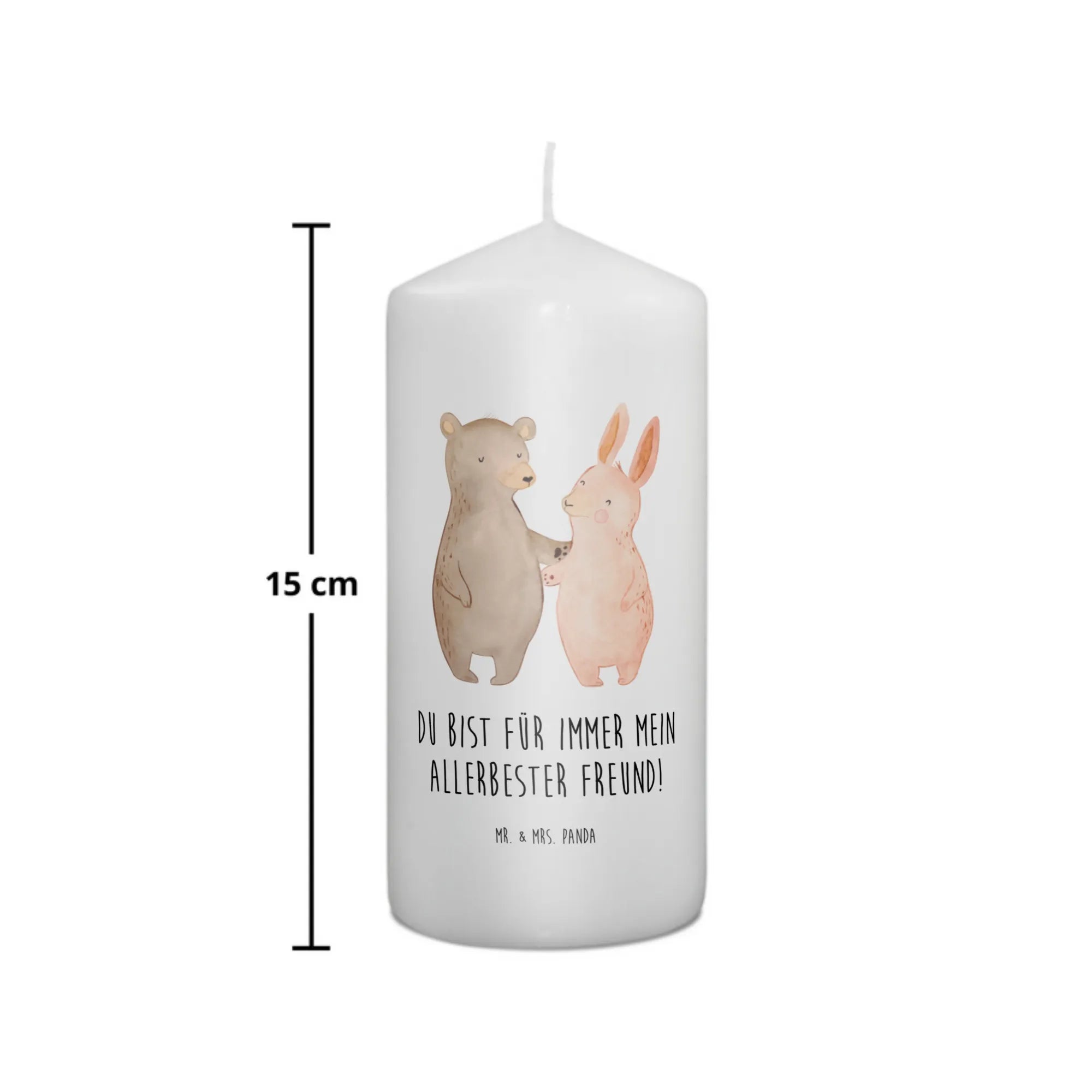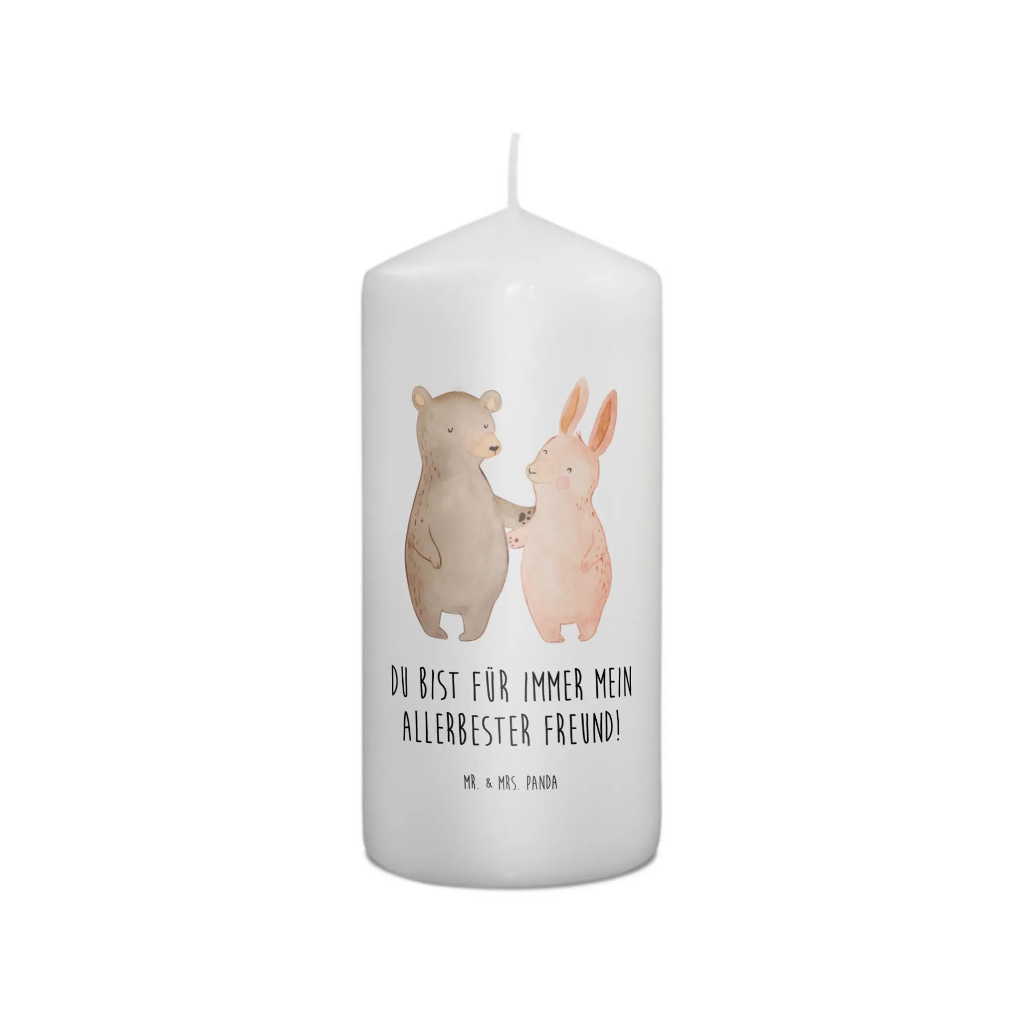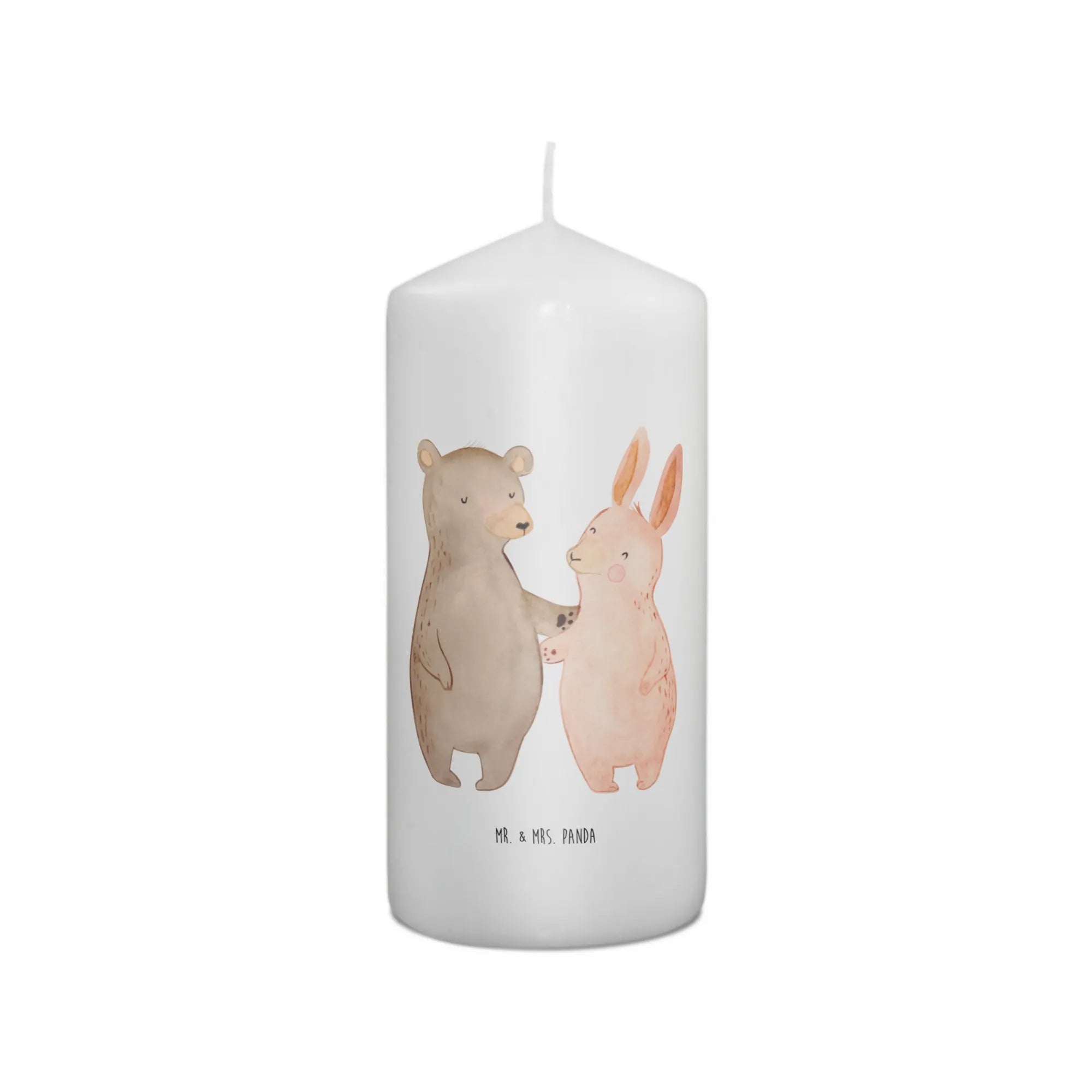 On the front of the candle, a heartwarming illustration showcases a lovable bear and a bunny wrapped up in a cozy hug, radiating joy and affection with soft colors and an endearing cartoon style. This motif not only symbolizes the warmth of companionship but also serves as a beautiful reminder that the strongest bonds – be it among friends, couples, or family members – are worth celebrating.