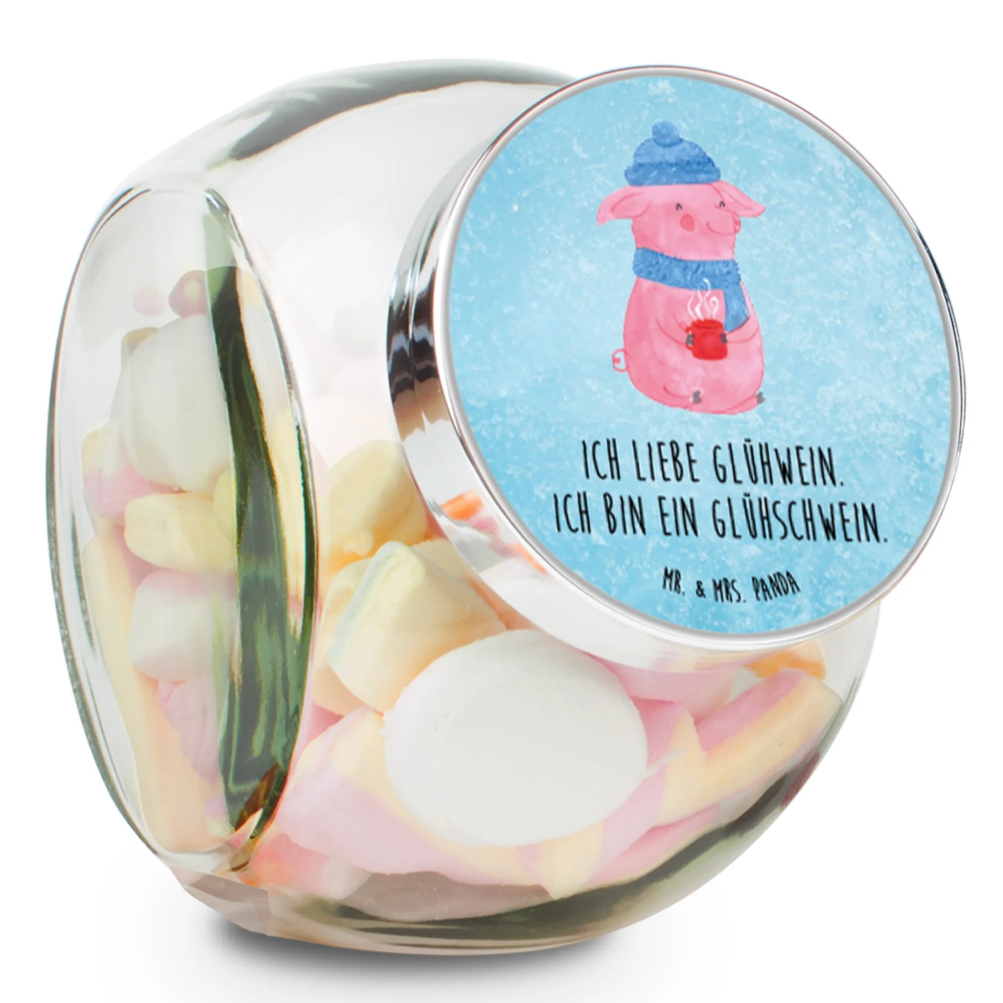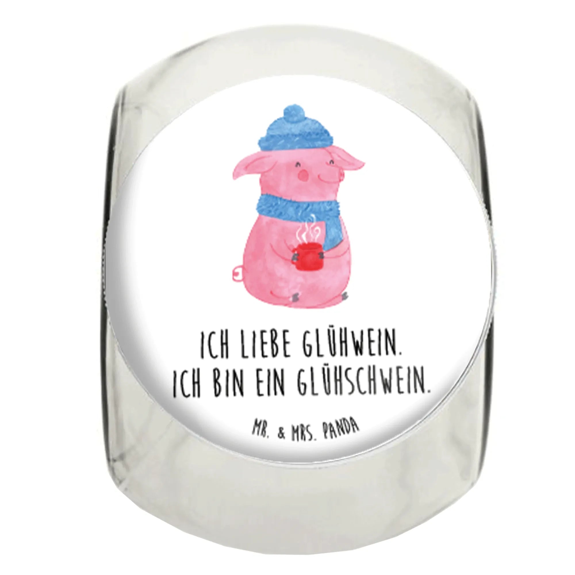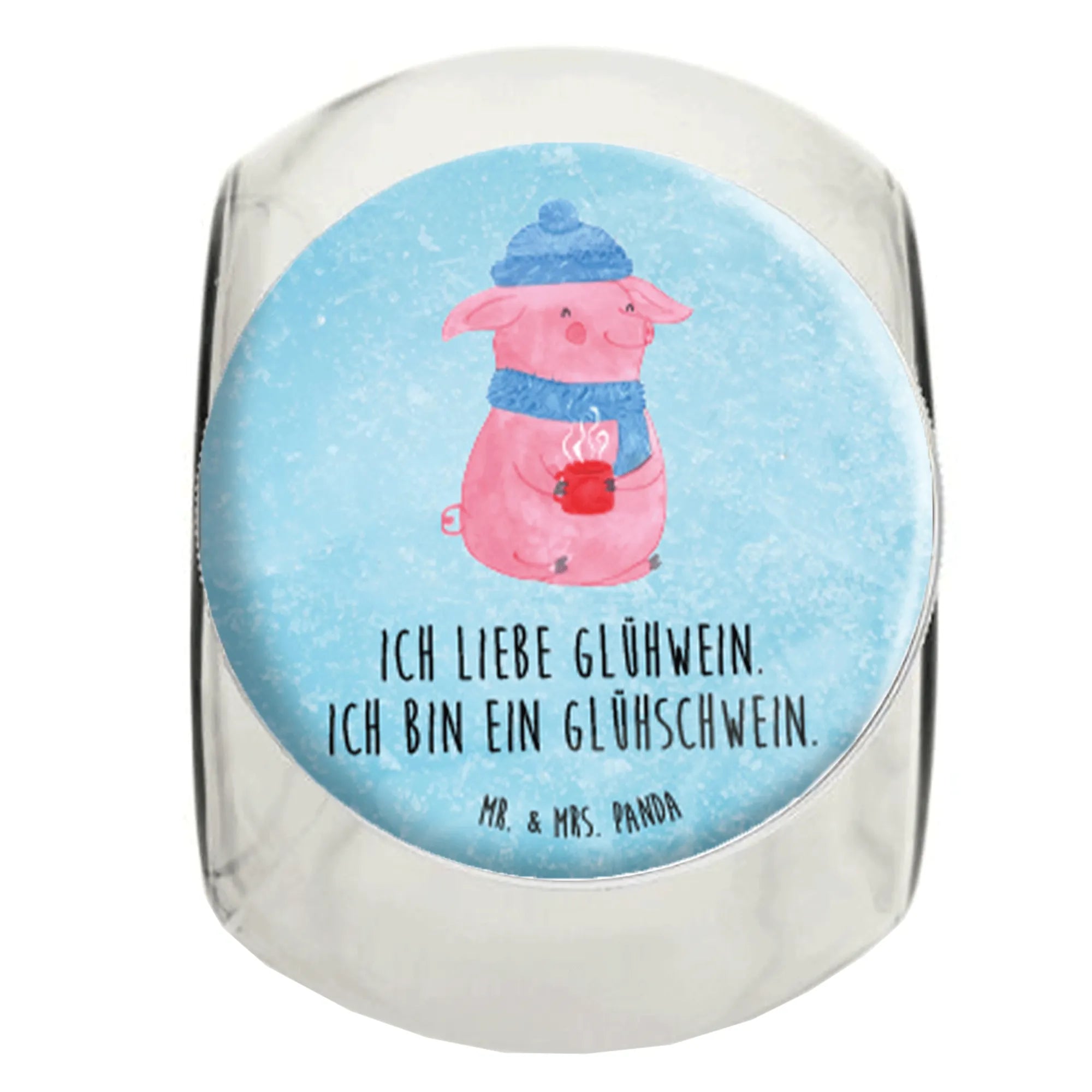 Imagine gifting this beautiful Candy Jar at your next holiday gathering, winter party, or as a thoughtful gesture to a friend who loves everything about Christmas! The charming motif showcases a happy, pink pig dressed in cozy winter attire, complete with a fluffy blue hat and a matching scarf, holding a steaming mug of mulled wine. The joyful illustration combined with the playful slogan "I love mulled wine. I'm a mulled pig." brings smiles and laughter to any occasion.