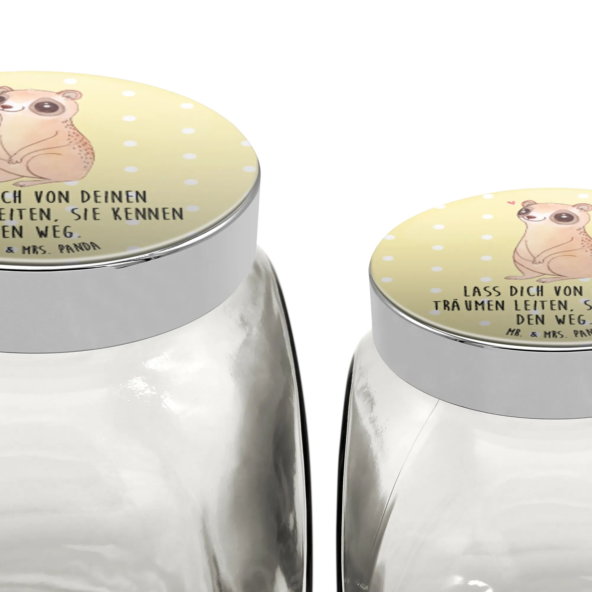 Hello, you wonderful treasure hunter of small and large joys! Today we take you into the magical world of candy jars by Mr. & Mrs. Panda. You will see, each jar is a small marvel of joy. The candy jar by Mr. & Mrs. Panda - A home for your sweet treasures Imagine you have a beautiful jar in front of you, transparent like a crystal-clear morning sky. In it rest your favorite sweets, cookies or even coffee and tea. Yes, exactly! In our candy jar, freshness and aroma remain exactly where they should be – embraced by love and comfort. But that's not all! You can choose between two sizes: XL for the small joys of life (870ml) and XXL for the big moments of happiness (2000ml). And guess what? Both sizes are printed with the enchanting motifs and sayings of Mr. & Mrs. Panda. A feast for the eyes! Not only beautiful but also practical The jar is not just a visual highlight. Thanks to the arched doming coating, the motifs shine with brilliant color intensity that will enchant you every time. The coating is robust and glossy, like a small shield for your sweet treasures. And don't worry about durability – the silver-colored screw cap keeps everything securely closed. The jar is perfect for everything your heart desires: sweets, cereal, tea or spices. And you can use it either upright or tilted – just as you like! A piece of luck you can see and feel Each jar is a small work of art. Imagine how it shines in your kitchen or on your desk, a constant companion that brings a smile to your face. And the best part? You can personalize it with your favorite motif by Mr. & Mrs. Panda. A true one-of-a-kind! So, what are you waiting for? Bring a little magic into your home and experience how a simple jar fills your life with joy and color. Grab your candy jar by Mr. & Mrs. Panda and let the party of joie de vivre begin!