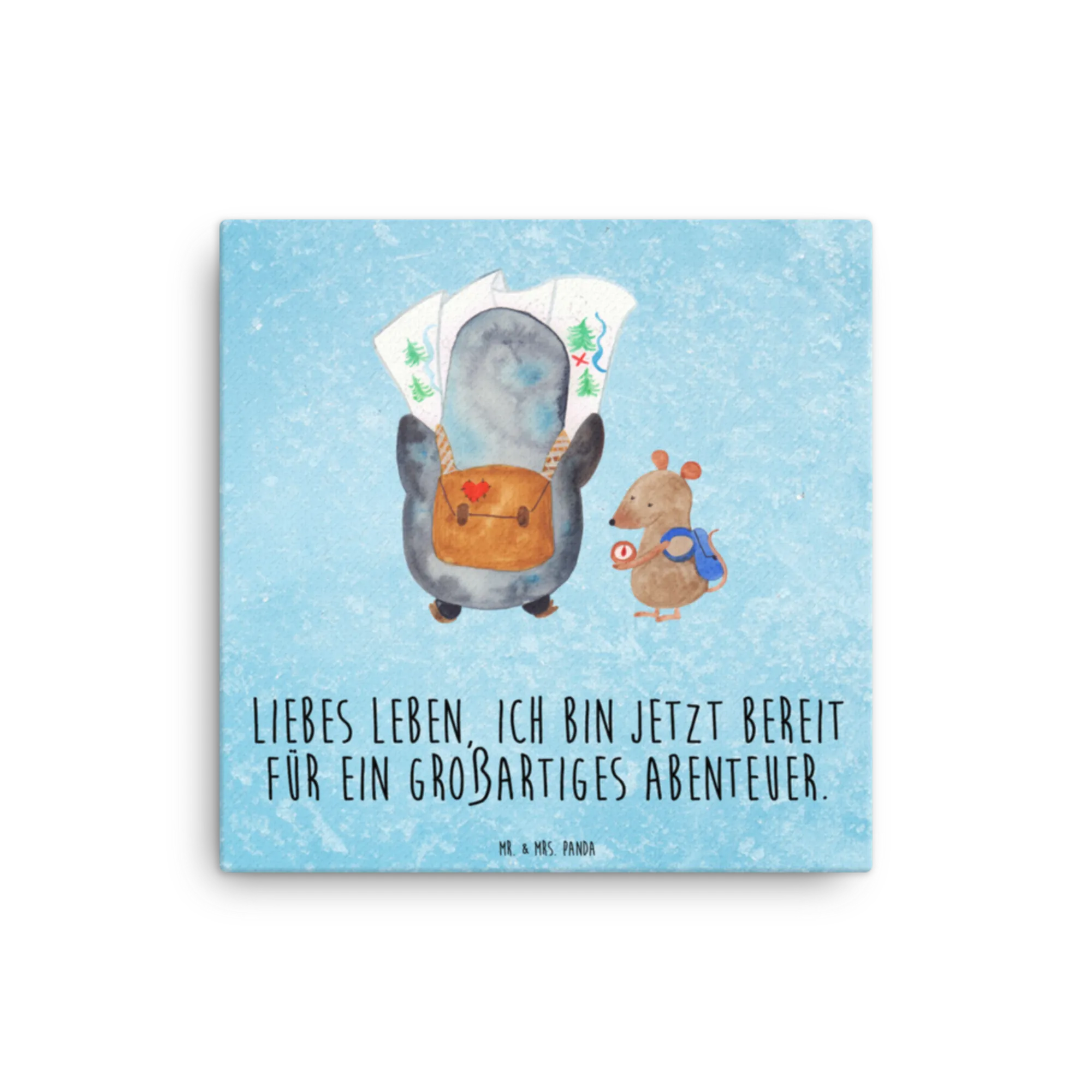 Canvas picture Penguin & Mouse Hiker - 40 x 40 cm - with a saying - White